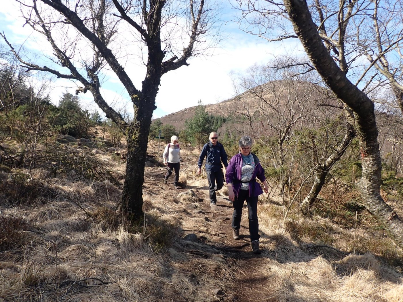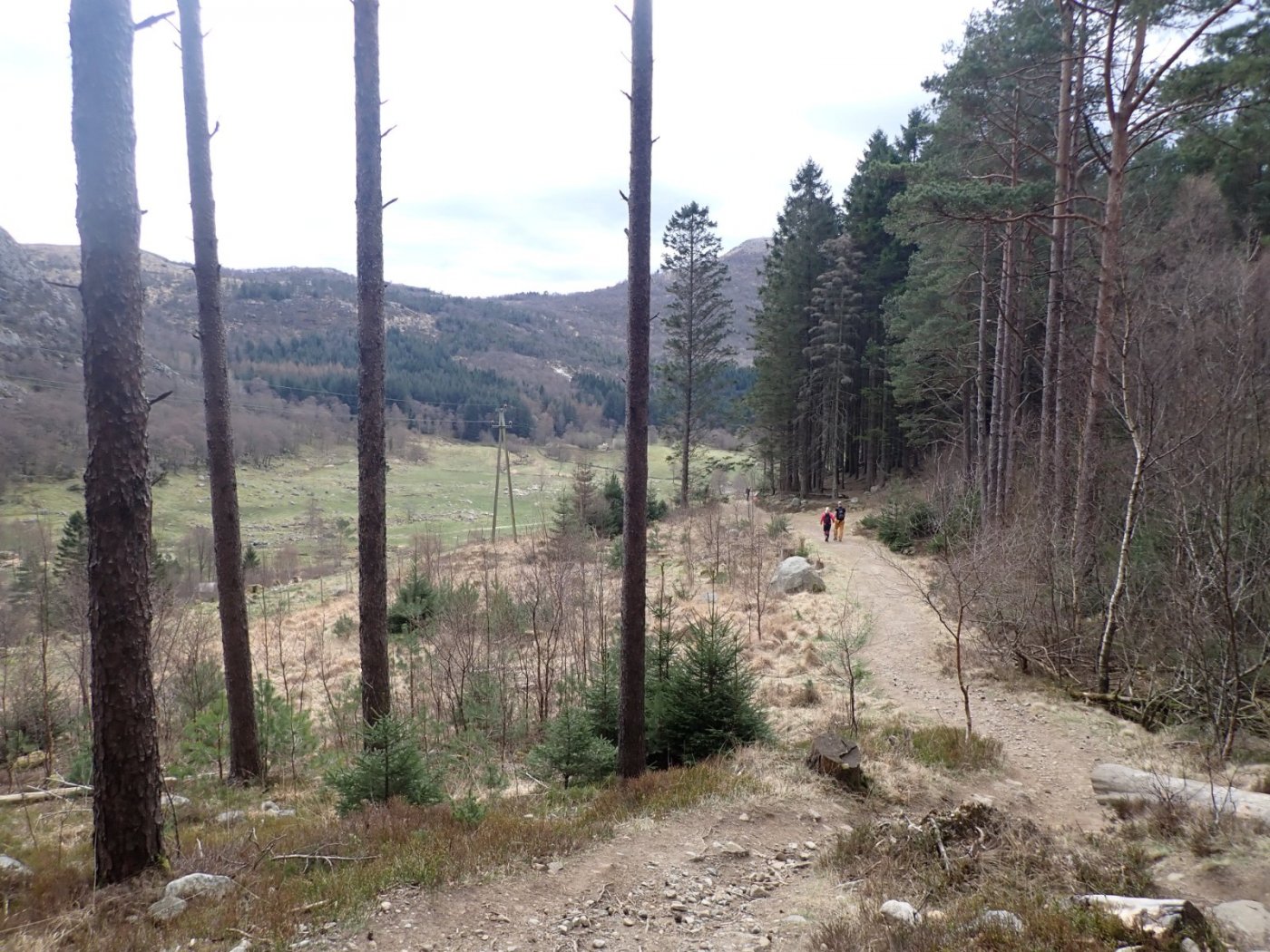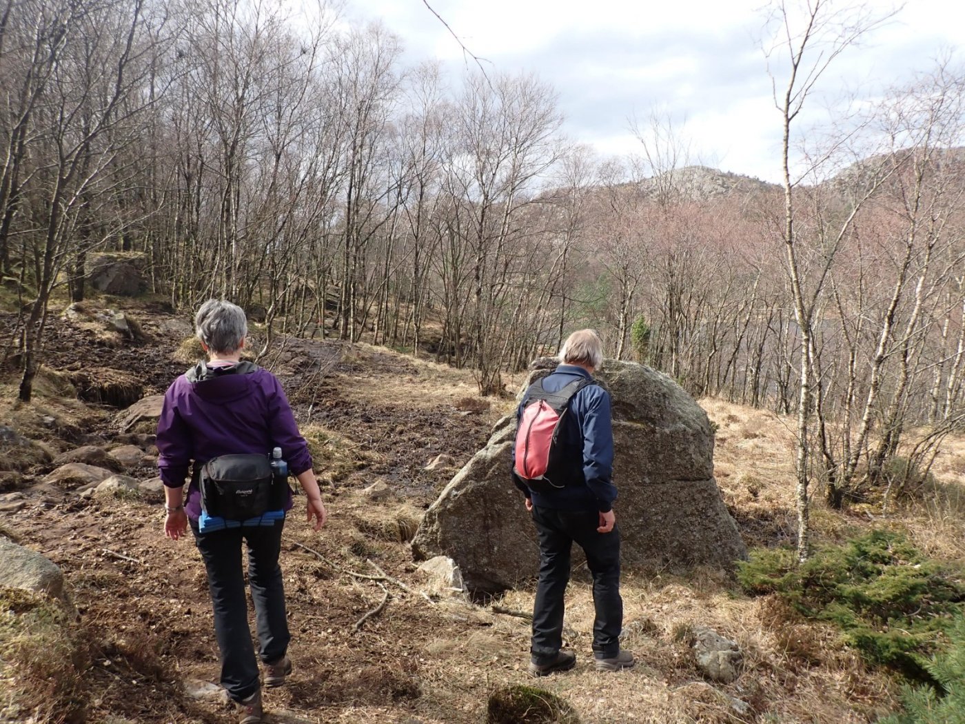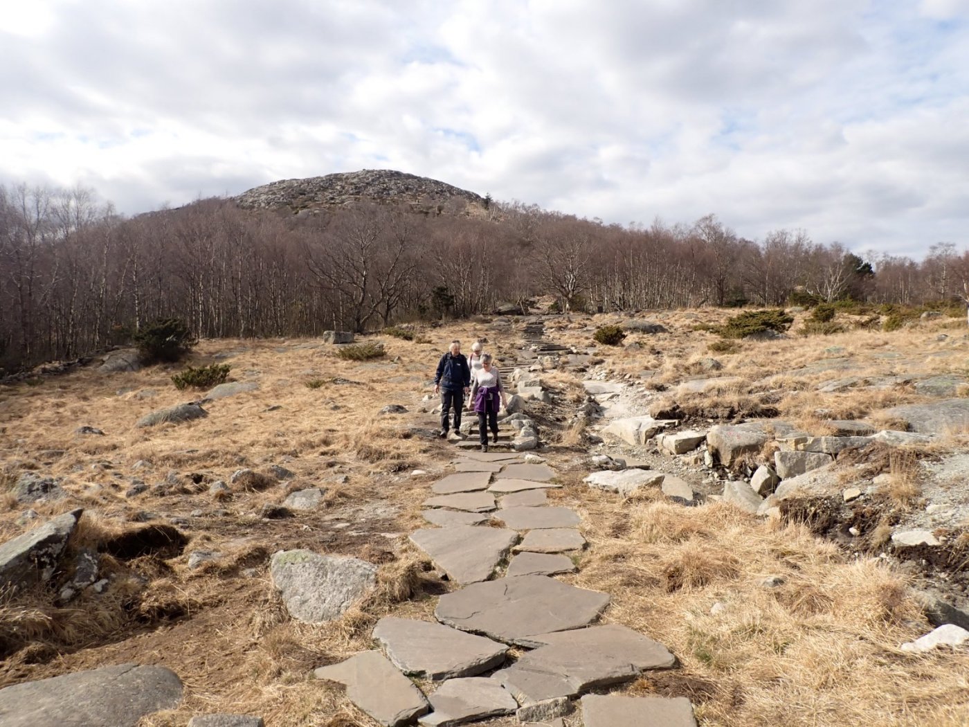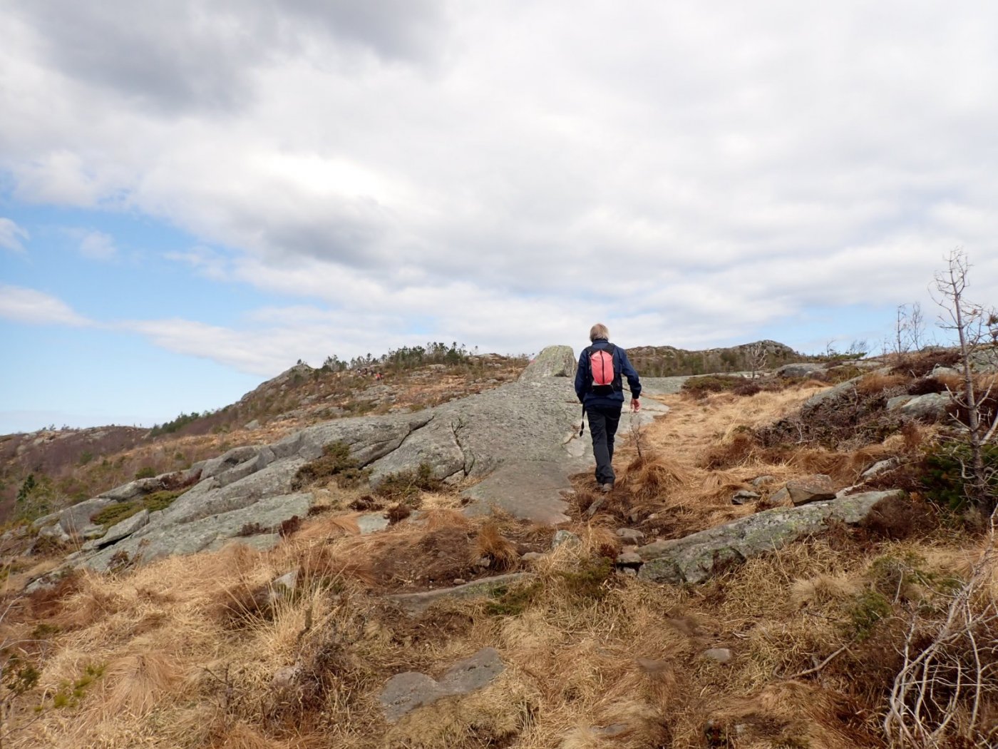 Flott følge på en fin tur. Sigbjørn ville gjerne en tur til Resasteinen. Nå var det ikke lenge siden jeg hadde tatt turen og funnet en ny vei ned fra Skjørestadfjellet. Det kunne muligens passe å kombinere disse tingene. Bestyrerinnen ville også på tur, og på tross av advarsler om tett skog og lang tur, var hun klar for en runde til Resasteinen og Dalevann. Før bakken opp mot Dalsnuten og Revholstjørn. Sigbjørn var like klar, og Anne Lise hev seg også med på turen. Vi ble fire som ville til Gramstad for å gå til Resasteinen og Skjørestadfjellet – og videre, hvor nå det måtte bli... Vi var langt fra alene på Gramstad. Det rant inn med biler og parkeringsplassen var nesten full. Mange ville på tur denne dagen, og det var lett å forstå. De fleste har fri på lørdager, og i flott vær så vil Gramstad lett bli turmålet for mange. Denne lørdagen var det flott vær. Litt skyer og dis, men også en del blå himmel. Det var tørt, og helt greit å gå, og værmeldingen ville ha det til at det heller ikke skulle blåse. Fint vårvær – og turvær. Det ble litt køgåing innover mot Revholstjørn, men så snart vi forlot «den brede sti mot Dalsnuten» var vi nesten alene. Vi kunne se folk på vei mot Resasteinen, men de var et stykke foran oss. Det er lett å huske bare bakkene oppover rett før Resasteinen, men det er også noen kneiker inne i skogen. Vi holdt et greit tempo og kom opp til de siste bratte kneikene oppover mot steinen i god form. Ved Resasteinen var det «stinn brakke», masse folk som satt og spiste, men også en del som gikk forbi, både opp og nedover. Det ble en kjapp pause på oss før vi fortsatte mot toppen av Skjørestadfjellet. Som ikke er langt fra Resasteinen. Vi tok over toppen av Skjørestadfjellet og ned på stien mot Skjørestad. Der traff vi en kar som var i gang med å ytterligere gjøre stien mer fremkommelig. Ett stykke nedover gikk vi inn på traktor veien oppover og parallelt med stien nedover. Vi fulgte «veien» til vi kunne se Dalevannet. Nedover siden mot Dalevann, fant Sigbjørn den nesten usynlige stien, som vi fulgte til STF stien. Det tok ikke lang tid før vi sto på dammen ved Dalevann. Fra der ble det vei ned bakken og bort til Dale. På vei nedover lia fra Dalevannet kunne vi se bort mot dalsiden vi skulle opp. Fra Dale tilbake til stien mot Revholen er det opp, men ikke for bratt, og vi kom opp uten problemer. Stien her har bredt seg ut over, i gamle dager var dette en tydelig stølsvei. Nå er en del av «stølsveien» tråkket i stykker. Vi hadde brukt noen timer på rundturen, og det var mindre folk på vei mot eller fra Dalsnuten enn da vi startet. Siste stykket inn mot Gramstad og bilene gikk kjapt og greit. En flott tur i virkelig godt turvær, med vårstemning – i hvert fall på sørsiden. Omtrent en mil, men med mye opp og ned og noen meter med tett skog uten sti.2 poeng