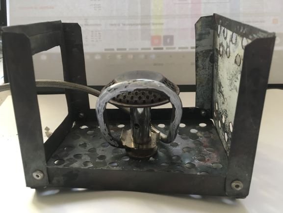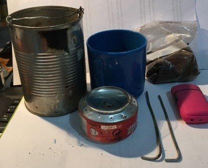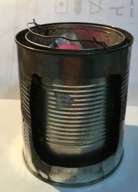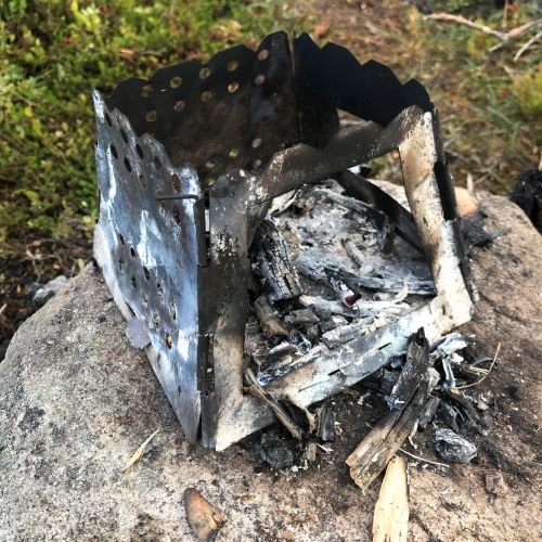 Som en annen skriver, plastbelegget brenner for vekk. Når jeg bruker 2 blikkbokser er primært for å ha et vindskydd ------------- Eller så lager jeg bla disse. Primært fyrer jeg med ved. Men den er også klargjort for Trangias gassbrenner. Her avbildet i en annen av mine ovner. Og skulle du slippe opp for ved er det også bare å sette i Trangias rødspritbrenner Vekten er også lav. 160 gram for den som er avbildet, og en tilsvarende som jeg lager av sprybokser veer 100 gram. Målene er: grunnflate 14 x 14 cm. høyde 10 cm og toppen måler 10 x 10 cm. Og når du skal dra videre bretter du den ut Og slår den sammen, og legger den i transporttrekket.1 poeng