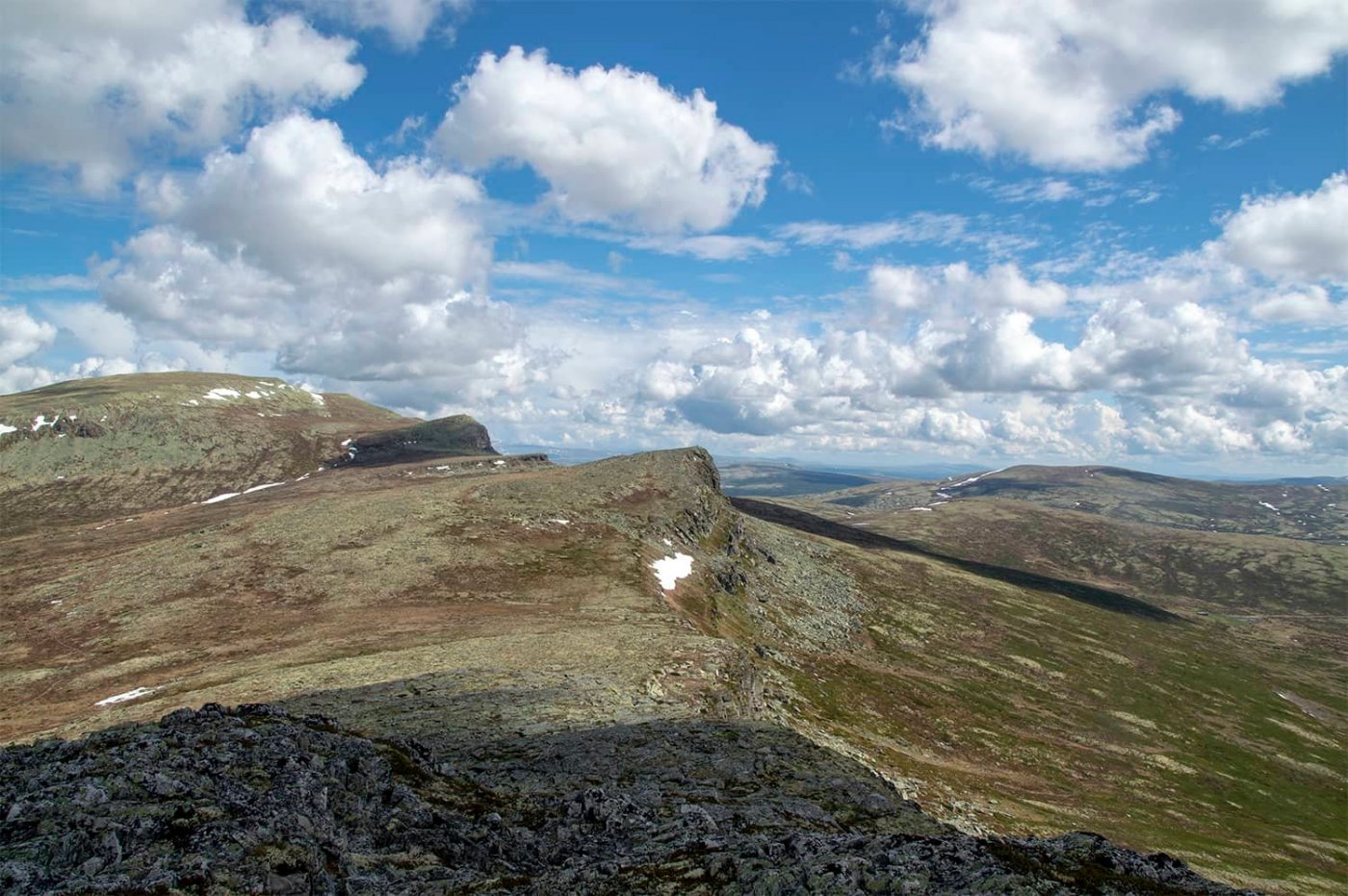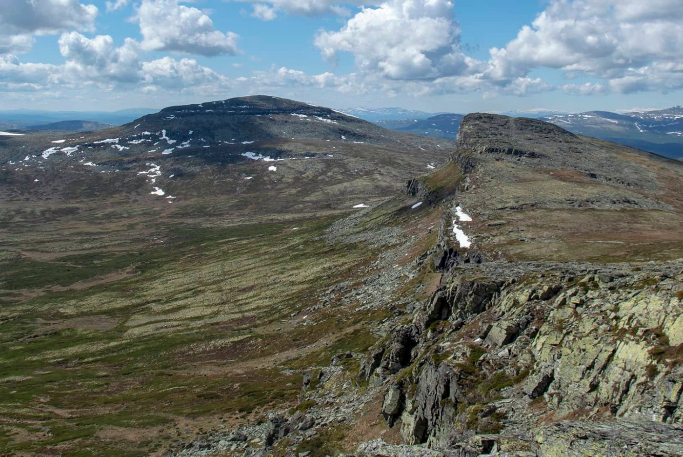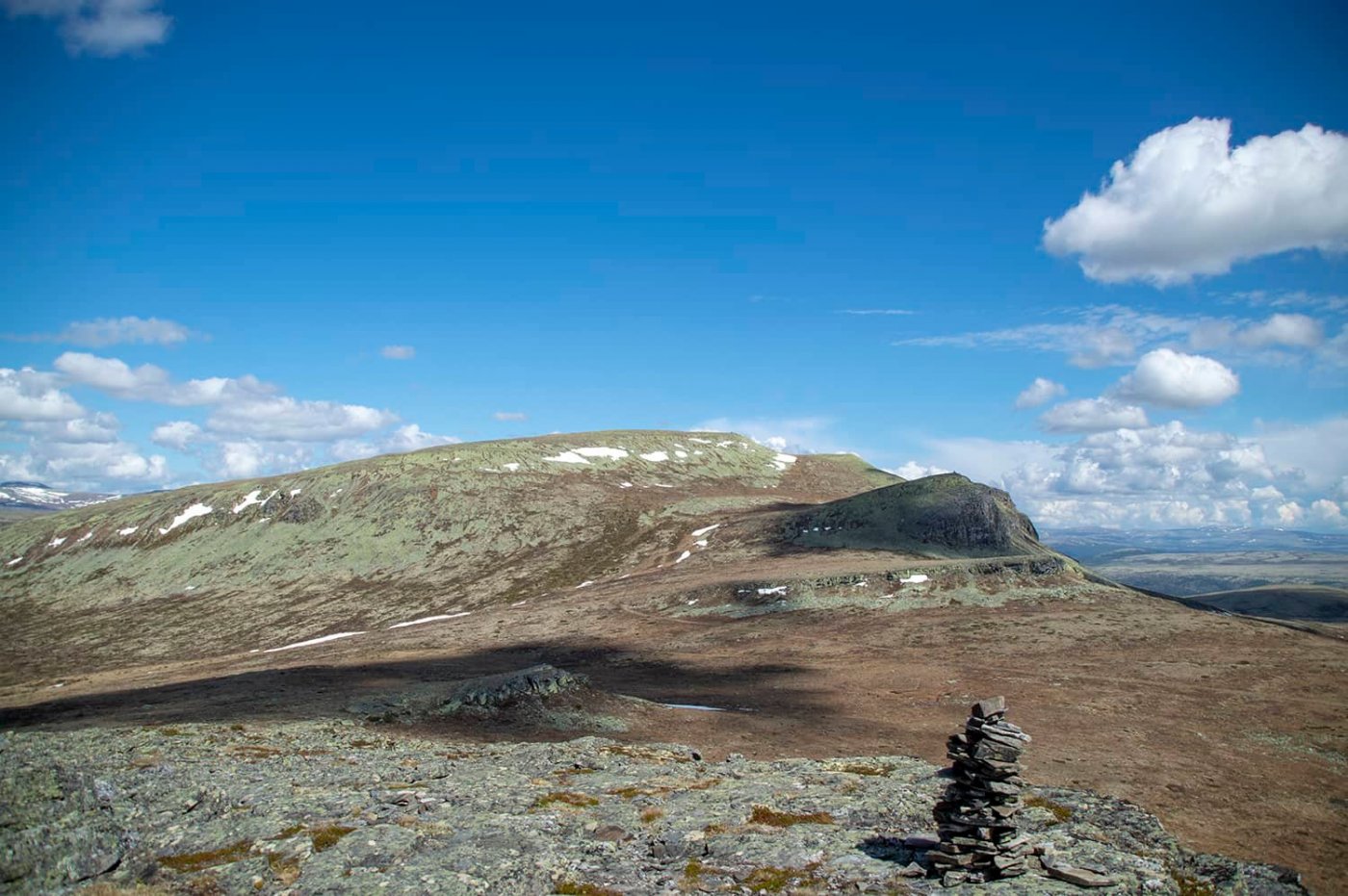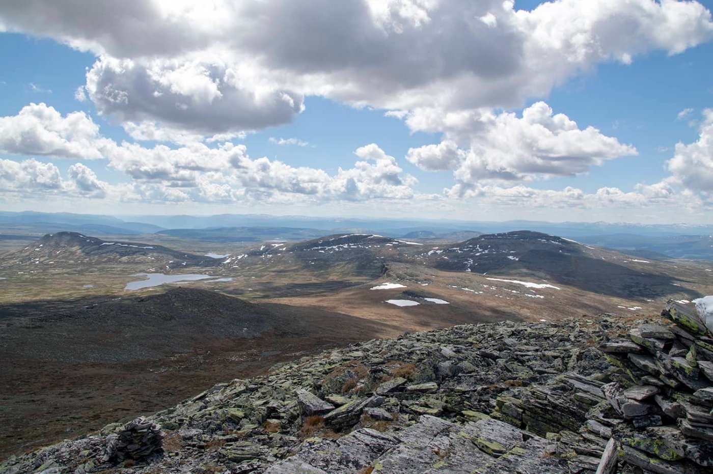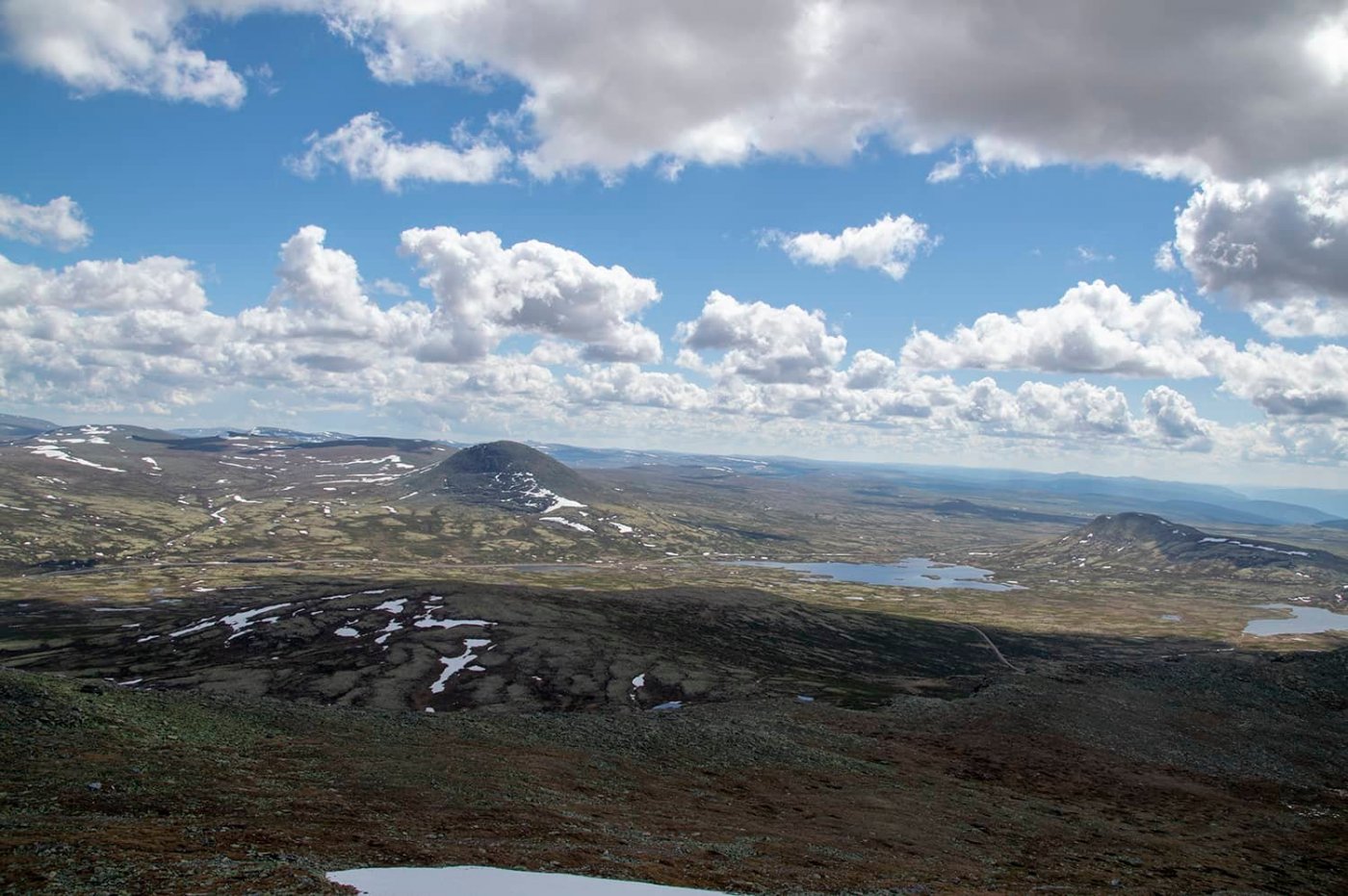 Ankom på kveld. Det ble skikkelig regnvær, glad jeg valgte å overnatte i bilen. Greit med varebil med hjemmebygd seng i de tilfellene det er dårlig vær, eller jeg rett og slett ikke orker å sette opp teltet. Dagen etter var planen en rundtur over mange topper. Blekkstille på Muvatnet. Utsikt tilbake mot Flåtjønnet, Muvatnet og fjelltoppen Muen. På Midtre Bølhøgda innså jeg at jeg måtte kutte litt av planlagt rute, hoppet derfor over Nørdre Bølhøgda, og gikk ned til Flåtjønnglupen. Neste mål var Ramstindan. Det hadde trolig vært lettere å gå til venstre og gå opp "bak", men jeg valgte en mer direkte rute, sånn cirka midt på bildet. Ser flatere ut på bildet enn det faktisk var. Her ble det fryktelig til pusting og pesing for en person i dårlig fysisk form. Men kom meg etter hvert opp. Utsikt mot Rondane. Veien videre, og hovedmålet Store Ramshøgda. Venstre kne begynte å bli litt ubehagelig på dette tidspunktet. Viktig å se tilbake også. Og fremover igjen. Kom meg etter hvert på toppen av Store Ramshøgda. Dette tror jeg er utsikt mot Sølen, mulig jeg tar feil. Rondane (igjen) Ser tilbake på store deler av ruten som allerede er gått. Muen som største topp. Muvatnet til høyre for den. Og der borte står bilen parkert, på høyresiden av vannet... Det ble slitsom tur tilbake, med et kne som gjorde vondt på vei ned, men OK på flaten fra Ramshytta bort til bilen. Men kjente også ut som det var litt problemer med hoftene(?), måtte stoppe noen ganger og vente litt før jeg kunne gå videre. En forsiktig beregning viser at jeg brukte ca. 6 timer og 15 min (inkl. pauser) på turen som var ca. 15 km. Spiste ingen mat før turen, og svært lite på turen, da jeg for tiden har mistet all matlyst etter siste dose coronavaksine. Det gjorde nok turen ekstra slitsom. Kjempegod følelse å komme tilbake til bilen, ta av sko og sokker, sitte i god stol og drikke en kald brus.4 poeng