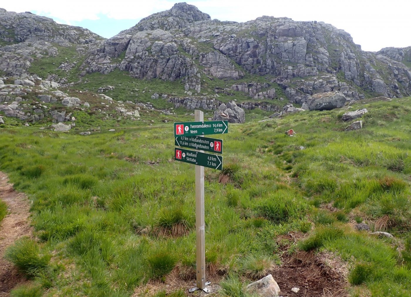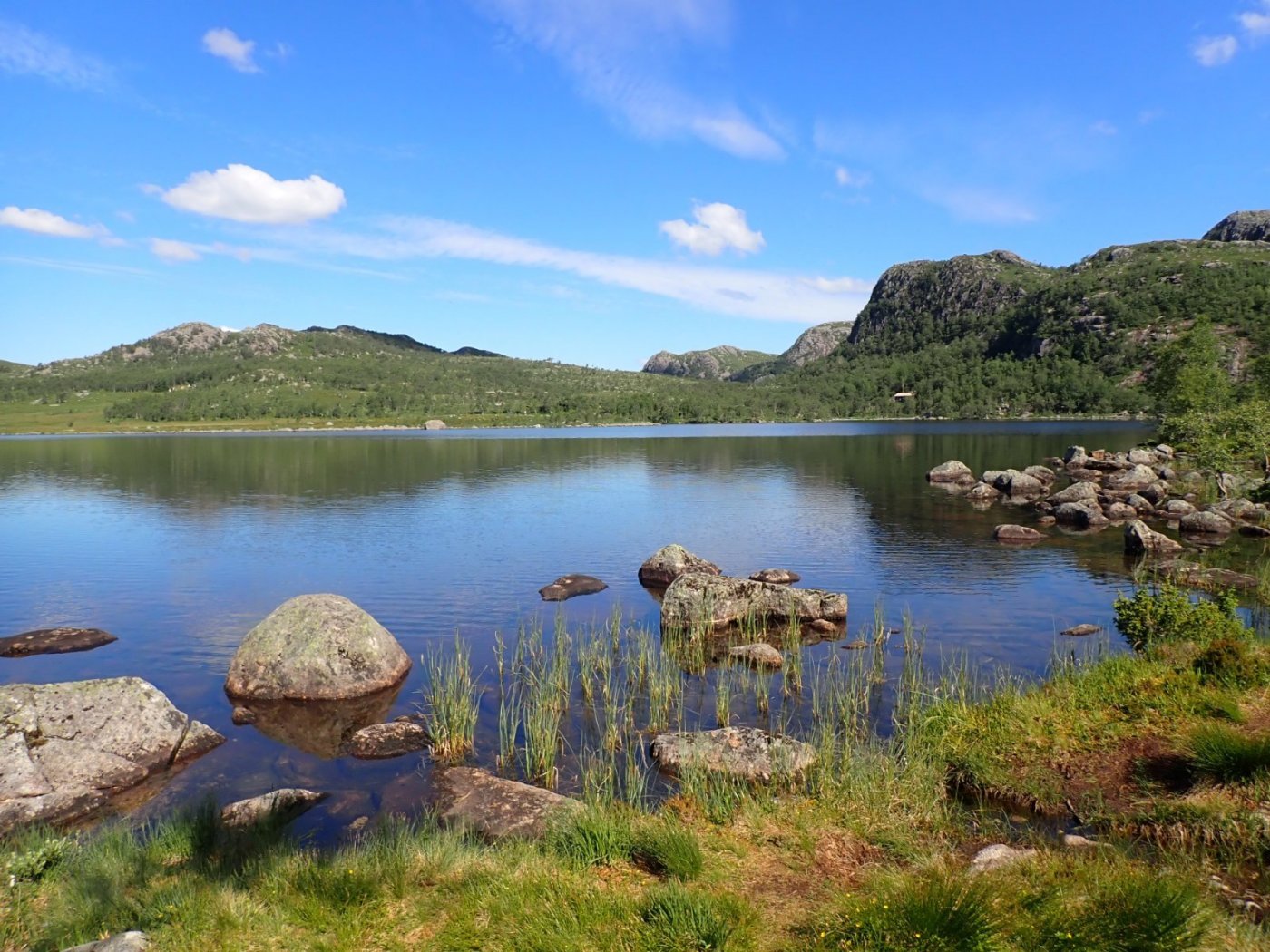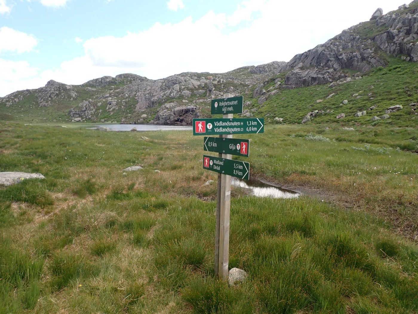 Endelig den tradisjonelle turen. En rundtur i Madland hadde stått på ønskelisten ganske lenge. Selv med virkelig bra turvær hadde det ikke blitt anledning til denne spesielle turen. Mange turer kom før, og en dag i uka må liksom være turfri. Rundturen i Madland er egentlig en klassiker. Jeg har gått denne turen i noen år, men da Fisketjønnbu hadde sin storhetstid var dette søndagsturen for mange Stavangerfolk. Fiskefjønnbu er vekk og stien var nesten overgrodd da jeg gikk her for noen år siden, tilbake i 2014. Det var lett å følge stien nå. Ikke skikkelig oppgått, men markert. Fortsatt er det vanskelig å finne en god vei over to steinurer som sperrer veien. Bare varden med rød T på andre siden viser vei. Jeg velger å gå opp fra nederste parkeringsplass og over Sirdalsloen og videre ned til Fisketjønnene. Veien langs indre Fisketjønn er grei, det blir litt verre oppe mot Høylandsskaret. Der er det stein og hull om hverandre, og det skal lite til før en fot plasseres der den ikke bør være. Denne gangen gikk det bra, og jeg kom helskinnet, men med et sår på skinneleggen, opp til flaten over Høylansskaret. Med mange dager på tur den siste tiden, kunne jeg kjenne at beina ikke var like samarbeidsvillige som vanlig. Det gikk greit, men det var tungt å holde farten opp. Den siste bakken opp mot Vådlandnuten var tung å komme opp, og pulsen gikk for fullt. Fra nesten øverst mot toppen, er det mulig å se langt nedover Rolighetsdalen. Den veien jeg hadde tenkt meg. Det var ikke et menneske å se, bare en del sau.... Nettopp nedover mot Rolighetsvannet, er det greit om bakken er noen lunde tørr. Det var den denne dagen. Det tok ikke lang tid før jeg sto ved stidelet ved Rolighetsvannet. Da var jeg litt over halvveis, og hadde bare 5,5 kilometer igjen til bilene. Jeg har alltid innbilt meg at det går nedover fra stidelet og mot Maribakken. En sjekk på kartet viser at det faktisk ikke går så mye ned men noen få høydemeter blir det. Jeg har gått denne turen noen ganger, og alltid synes turen langs drifteveien fra Rolighetsvannet til Maribakken er virkelig flott. Stien går over myrer, bakker og langs småvann. Virkelig flott. Denne gangen ble det litt tungt, og jeg hadde nok med å komme meg fram. Det ble lite tid til kikking på naturen rundt. I bunn av Maribakken var det som vanlig tid for en liten pause. Denne gangen ble det en kjapp drikkepause, før jeg fortsatte. Fra Maribakken og tilbake til bilen er det omtrent 2,5 kilometer, og ganske flatt. Stien er fortsatt grei, men nå er det mer stein og det blir noen lange steg inne i mellom. Siste stykket ned går på opparbeidet driftevei, omtrent som i Viglesdalen. Helt greit å gå på, men også her blir det noen lange steg fra stein til stein. Enkelt å gå, så lenge det er tørt. Nede ved bilen kunne jeg se at det hadde gått noenlunde greit. Jeg hadde ikke brukt mer enn omtrent tre og en halv time på de 11- 12 kilometerne. En grei fart og en flott tur.1 poeng