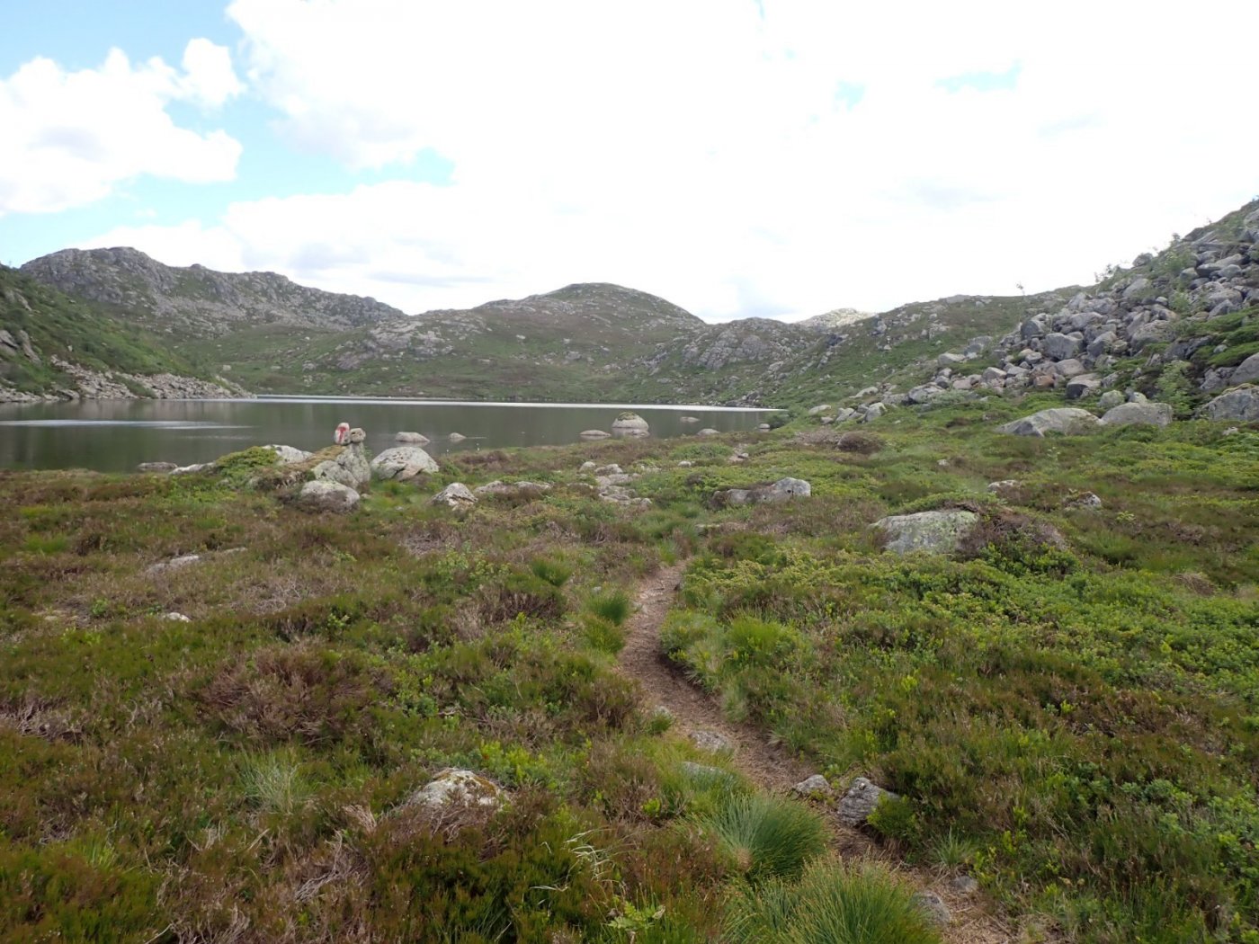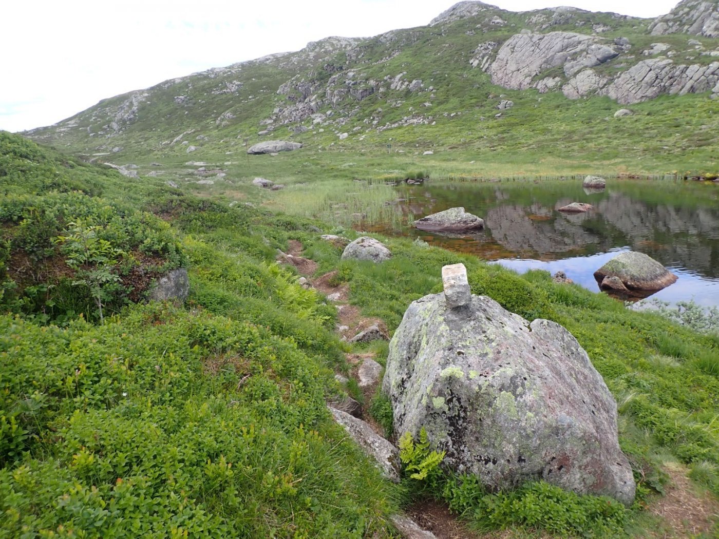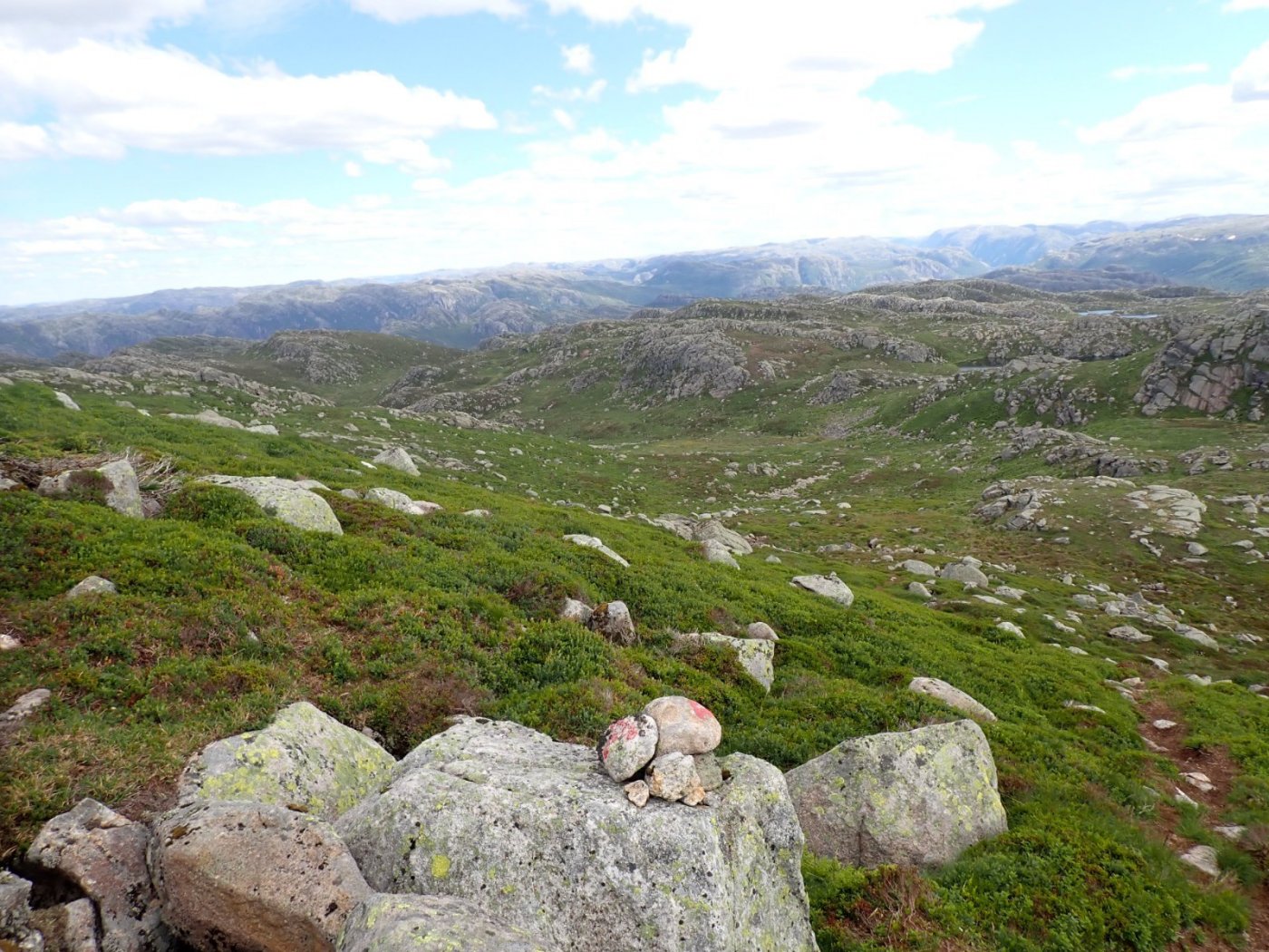 Endelig den tradisjonelle turen. En rundtur i Madland hadde stått på ønskelisten ganske lenge. Selv med virkelig bra turvær hadde det ikke blitt anledning til denne spesielle turen. Mange turer kom før, og en dag i uka må liksom være turfri. Rundturen i Madland er egentlig en klassiker. Jeg har gått denne turen i noen år, men da Fisketjønnbu hadde sin storhetstid var dette søndagsturen for mange Stavangerfolk. Fiskefjønnbu er vekk og stien var nesten overgrodd da jeg gikk her for noen år siden, tilbake i 2014. Det var lett å følge stien nå. Ikke skikkelig oppgått, men markert. Fortsatt er det vanskelig å finne en god vei over to steinurer som sperrer veien. Bare varden med rød T på andre siden viser vei. Jeg velger å gå opp fra nederste parkeringsplass og over Sirdalsloen og videre ned til Fisketjønnene. Veien langs indre Fisketjønn er grei, det blir litt verre oppe mot Høylandsskaret. Der er det stein og hull om hverandre, og det skal lite til før en fot plasseres der den ikke bør være. Denne gangen gikk det bra, og jeg kom helskinnet, men med et sår på skinneleggen, opp til flaten over Høylansskaret. Med mange dager på tur den siste tiden, kunne jeg kjenne at beina ikke var like samarbeidsvillige som vanlig. Det gikk greit, men det var tungt å holde farten opp. Den siste bakken opp mot Vådlandnuten var tung å komme opp, og pulsen gikk for fullt. Fra nesten øverst mot toppen, er det mulig å se langt nedover Rolighetsdalen. Den veien jeg hadde tenkt meg. Det var ikke et menneske å se, bare en del sau.... Nettopp nedover mot Rolighetsvannet, er det greit om bakken er noen lunde tørr. Det var den denne dagen. Det tok ikke lang tid før jeg sto ved stidelet ved Rolighetsvannet. Da var jeg litt over halvveis, og hadde bare 5,5 kilometer igjen til bilene. Jeg har alltid innbilt meg at det går nedover fra stidelet og mot Maribakken. En sjekk på kartet viser at det faktisk ikke går så mye ned men noen få høydemeter blir det. Jeg har gått denne turen noen ganger, og alltid synes turen langs drifteveien fra Rolighetsvannet til Maribakken er virkelig flott. Stien går over myrer, bakker og langs småvann. Virkelig flott. Denne gangen ble det litt tungt, og jeg hadde nok med å komme meg fram. Det ble lite tid til kikking på naturen rundt. I bunn av Maribakken var det som vanlig tid for en liten pause. Denne gangen ble det en kjapp drikkepause, før jeg fortsatte. Fra Maribakken og tilbake til bilen er det omtrent 2,5 kilometer, og ganske flatt. Stien er fortsatt grei, men nå er det mer stein og det blir noen lange steg inne i mellom. Siste stykket ned går på opparbeidet driftevei, omtrent som i Viglesdalen. Helt greit å gå på, men også her blir det noen lange steg fra stein til stein. Enkelt å gå, så lenge det er tørt. Nede ved bilen kunne jeg se at det hadde gått noenlunde greit. Jeg hadde ikke brukt mer enn omtrent tre og en halv time på de 11- 12 kilometerne. En grei fart og en flott tur.1 poeng