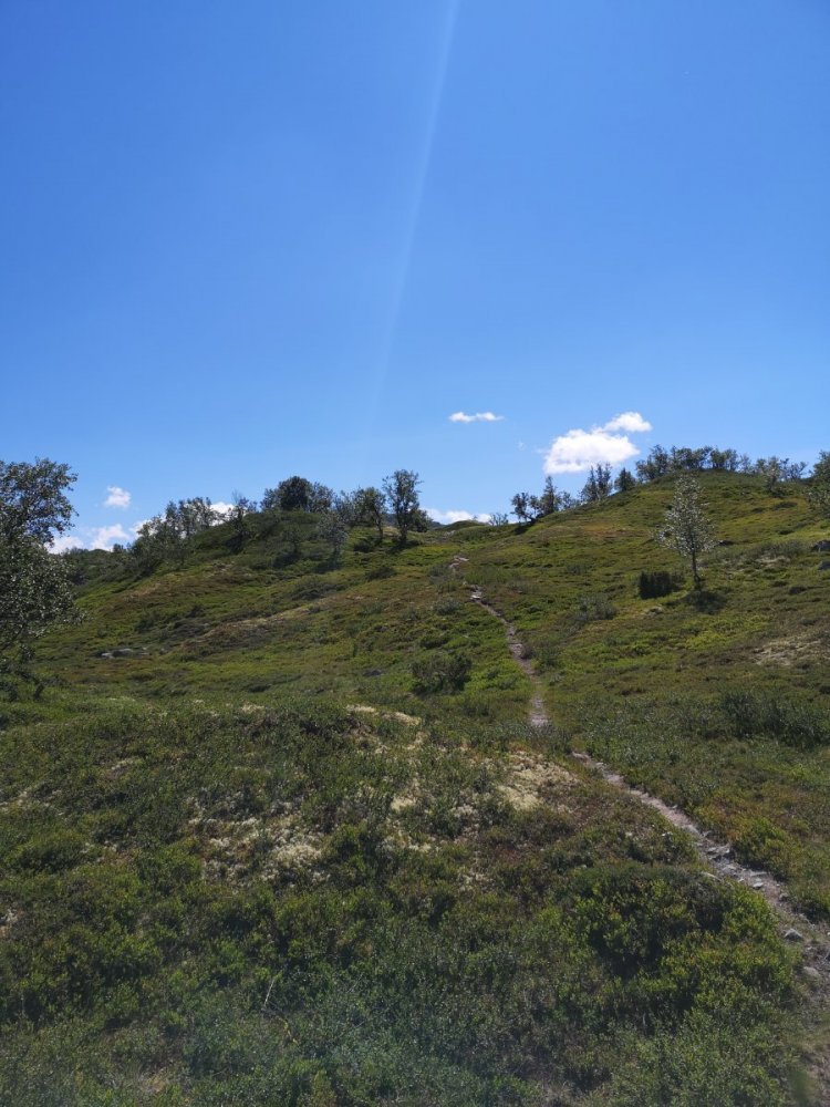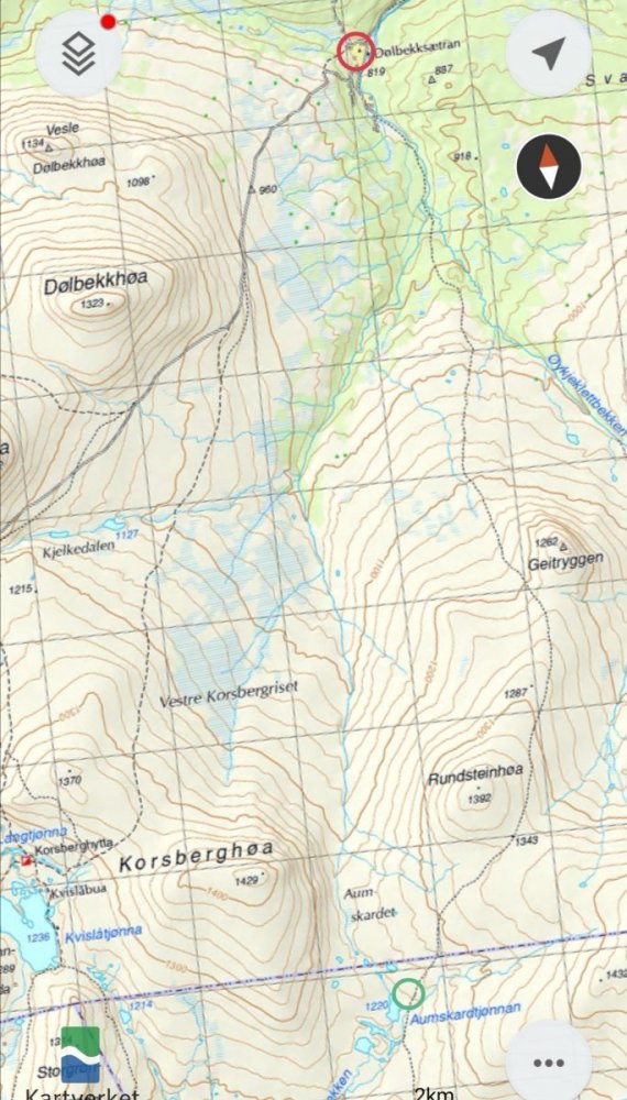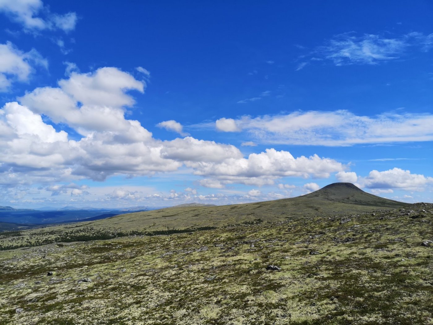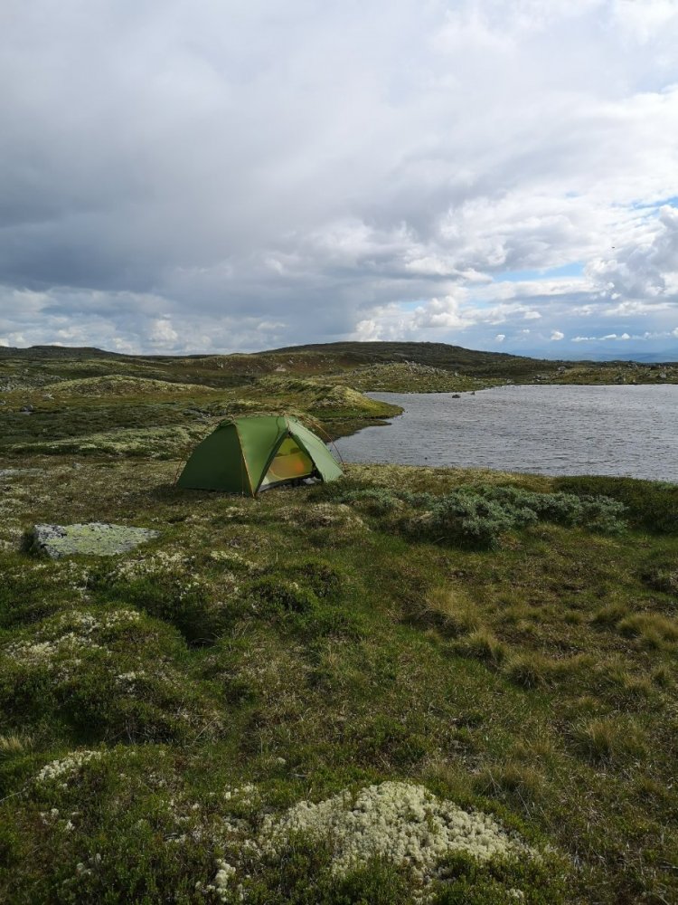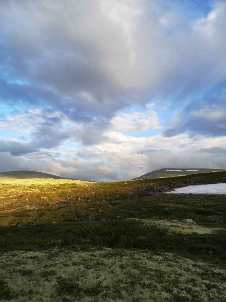 7/7 klokka 19:30 starter jeg sammen med min eldste og yngste datter en liten tur i Alvdalfjellene. De er 18 og 13 år og har vært med på turer før, men ønsket seg rolige og korte dagsetapper denne gangen. Planen er 2 overnattinger i telt med start og retur fra Dølbekksætran. De første 2 kilometerne går langs grusvei. Været vet ikke helt hvilken vei det skal gå, med vekselvis sol og mørke, truende skyer. Det er et påfallende og karakteristisk grønt lav som ligger som et pledd over de myke bølgende fjellene. Etter en stund tar vi av grusveien og inn på T-merket sti, og holder øynene åpne etter leirplass. Det er en stor og god bekk i Kjelkedalen med snøfonner som fortsatt klorer seg fast. Her slår vi leir. Neste dag fortsetter vi sørvestover mot Korsberghytta og Kvislåtjønn. Været er lettere enn i går med frisk vind som holder alt av fluer og annen faenskap unna. Deilig landskap å vandre i. Humøret er i øvre register. Ved sørenden av Kvislåtjønn blir det lunsjpause. Bak nærmeste åskam kikker Storsølnkletten hodet opp. Herifra skal vi over på umerkede stier. Vi skal følge østsiden av Storgrønhøgda før vi skjærer over elva og opp til Aumskardtjønnan. I begynnelsen ser vi rester av utviskede røde T-er. Her har det nok gått en merket løype før. Stien blir etterhvert ganske utydelig. Og plutselig, uten å tenke noe særlig over det, har vi en god stund fulgt noen sauetråkk. Alt for langt oppe. Tror vi. Vi roter oss nedover. Det er mye blaut myr her som vi må gå rundt i store buer. Tilslutt må kompasset og kartet fram. Jeg skulle nok satt en kurs før vi gikk over på umerket sti. Min erfaring er at umerket sti på kartet kan være alt fra UTmerket sti til ingen sti. Det er utrolig som tiden flyr når man surrer og knoter. Nå tar vi ingen sjanser. Kompasskurs settes rett mot Aumskardtjønnan der teltet reises i en fei. Far koker middag, jentene graver latrine. Det blir potetmos og kjøttboller. Etter middag blir det litt kryssord etterfulgt av en episode med nedlastet havfrueserie. Da er jeg oppdatert på hva minstejenta følger med på. Torsdagsgodteri blir det også: Bounty og saltsild. Ahhhh. Og så sniker skumringen seg over øvre Aumskardtjønn. Neste dag setter jeg Kompasskurs ved avmarsj. Finleser kartet. Men oppe ved Rundsteinhøa er stien selvsagt veldig tydelig med varder hver femte meter. Deilig og lettgått terreng med fantastisk utsikt. Geiteryggen ser ut som en rykende vulkan i det fjerne: Før vi kommer ned til tregrensa tar vi lunsj med makaroni i ostesaus toppet med salami. Det er fortsatt godt drag i lufta som holder klegg og fluer unna. Så lenge det varer i alle fall. Nede i bjørkeskogen er det lunt. Og der er det bare å holde jevnt trav for å riste av seg bevingede gjester. Da vi kommer ned til Dølbekksætran blir det en kattevask på noen og et bad i bekken på andre. Alvdal vestfjell er et nytt bekjentskap for meg, men her frister det å komme tilbake for en lengre tur.2 poeng