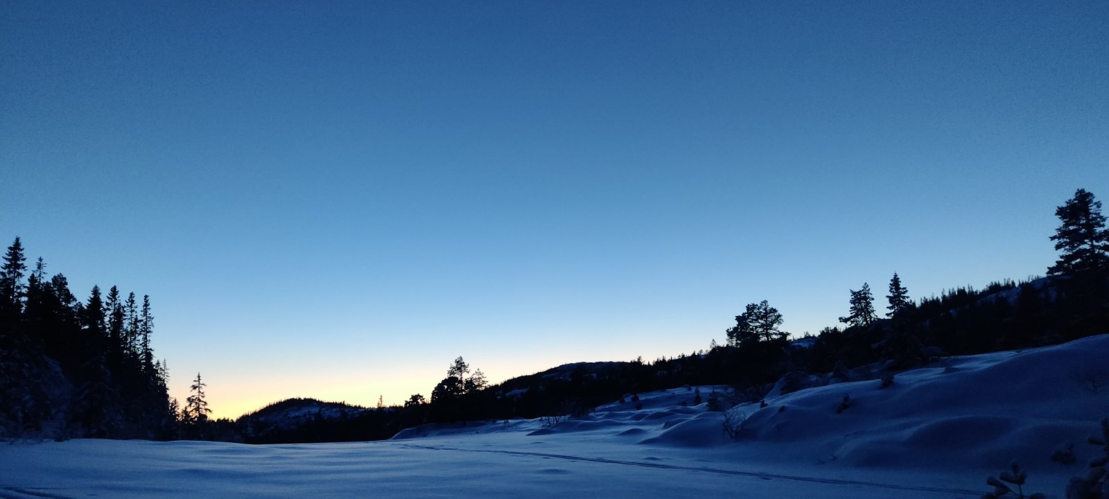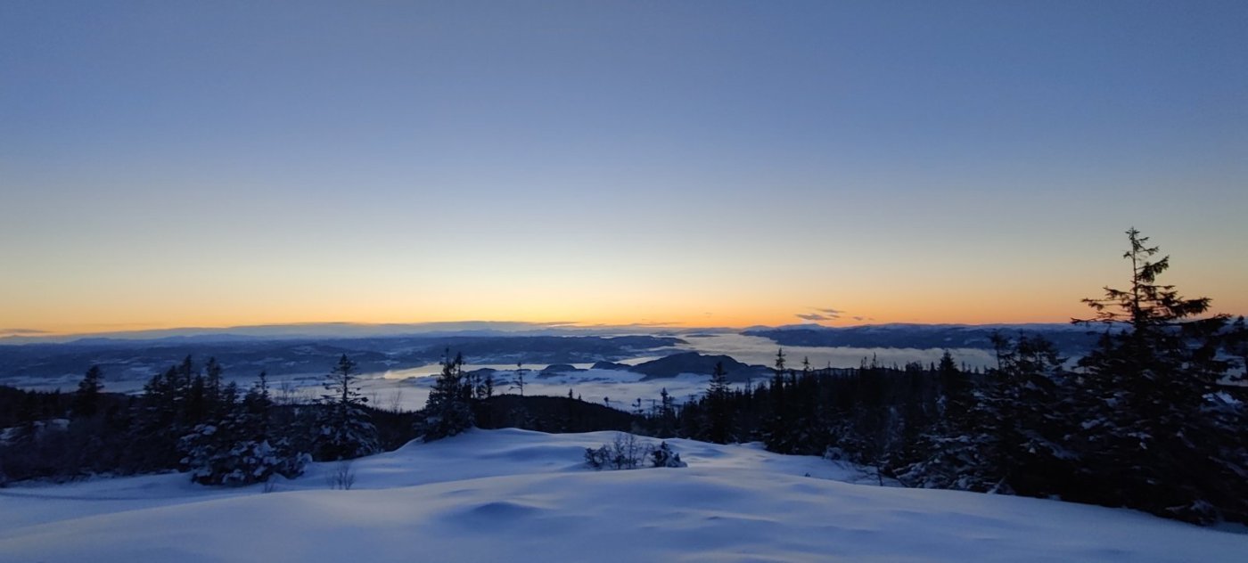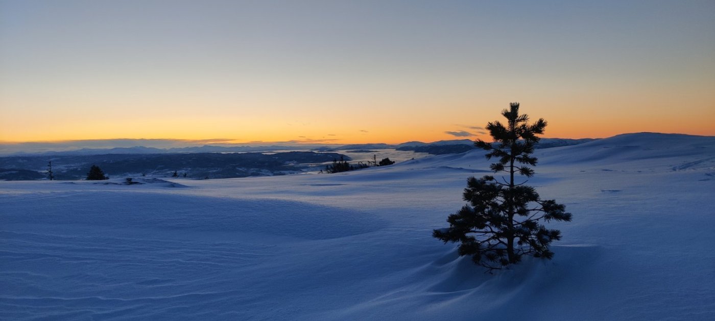 Bilde 1: Idyll ved Hansbuflåten i kaldt norsk vintervær Her følger en turrapport fra tur alene over vidda fra Finse til Rjukan i perioden 2.2.18 til 11.2.18. Jeg har valgt å inkludere en del detaljer og erfaringer rundt rutevalg osv som kanskje kan være til nytte for andre som planlegger å gjennomføre denne turen Hilsen Haavard Haaskjold Dag 1: Finse 1222 - Hansbuflåten Etter å ha tatt nattoget fra Tronhdiem til Oslo S fikk jeg en flott togtur mot Finse i strålende solskinn. Etter en liten halvtime med forberedelser på Finse startet turen i to-tida fredag ettermiddag. På Finse hadde det snødd mye de siste dagene så det var relativt tungt å gå i dyp nysnø, men været var helt fantastisk. Blå himmel, nesten vindstille. Teltet ble satt opp ved Hansbuflåten noen kilometer sør for Finse. På perrongen i Oslo hadde jeg blitt kjent med en annen fjellvandrer med pulk som skulle til Finse og vi slo følge denne dagen før han returnerte dagen etter. Soveposen som jeg bruker er en helt ok vintersovepose, ikke en veldig dyr en. Men selv i netter med 30 minus hadde jeg det komfortabelt. Til liggeunderlag bruker jeg reinsdyrskinn og et «vanlig» enkelt liggeunderlag. Det duger fint. Både reindsdyrskinn, liggeunderlag og sovepose var pakket i en «arctic bedding» som er utrolig kjekk på slike turer. I denne kan en pakke mye av det en trenger inne i teltet. Beddingen ligger oppå pulken og dras bare rett inn i teltet. Da er det bare å åpne den og vips så ligger både underlag og sovepose ferdig utrullet. Inne i soveposen bruker jeg en hjemmelaget dampsperre av søppelposer. Jeg sover da med tynt ull på kroppen inne i denne plastposen. Dermed blir all fuktigheten fra kroppen fanget i denne posen og gjør ikke soveposen fuktig. Det blir litt klamt inne i plastposen, men det venner en seg fort til. Dette har jeg brukt på vinterturer tidligere (bla i fjor når jeg gikk en uke i Sylan) og det fungerer utmerket. Jeg hadde ikke problemer med kulde selv om det var flere netter i minus 30. Soveposen holdt seg tørr og fin. En liten varmeflaske med varmt vann puttet jeg nederst i posen for å gi litt ekstra varme på bena. Jeg hater å fryse på bena, så da er det skikkelig god komfort med varmen fra varmeflaska. Inne i teltet har jeg laget meg en hjemmelaget «ekstra bunn» av tynn enkel bobleplast som lå løst inne inne i teltet når jeg rullet det sammen. Denne fungerte greit og ga et ekstra isolasjonslag mot bakken inne i teltet. Vottesystemet jeg bruker er ullvott innerst, deretter en fleecevott utenpå og så en vindvott ytterst. Tanken her er at fuktigheten går gjennom ullvotten ut i fleecvotten. Dermed blir fleecevotten fuktig, men ikke ulla. Fleecevotten tørker jeg også på kroppen. Selve vindvotten rensens for ispartikler hver kveld (både innside og utside). Dampsperre bruker jeg også i skoene. En tynn ullsokk innerst, en rema1000 plastpose og så en tykk ullsokk. Dermed holdes den tykke ullsokken og selve skoen seg tør mens den innerste tynne ullsokken blir «søkk våt». Denne sokken tørker jeg hver natt på kroppen (i lysken). Utenpå skiskoene har jeg tredd en gammel ullsokk, det gir også ekstra isolasjon. Mange av disse detaljene har jeg lært fra boka til Børge Ousland (Ekspedisjonshåndboka). Her deler han av sine erfaringer om hvordan håndtere problemet med kondens og fuktighet i kulda. En bok som absolutt kan anbefales. Dag 2: Hansbuflåten - Finsbergvannet (1190) En god natt i teltet , selv med temperatur på ned mot -30 var det godt og varmt i posen. Klarte faktisk å forsove meg til klokka 8.30! Først klokken 10.30 var jeg klar til å gå. Fra nå av ble vekkerklokka satt til 05.20 sånn at jeg er klar til å sette avgårde når det lysner i halvåttetida hver morgen. I dag var det skikkelig kaldt og da tar ting tid. I tillegg var det mye dyp snø så jeg sneglet meg videre sørover med utallige pulkvelt i den dype snøen. Det var klar blå himmel og lett å navigere etter kartet. Vinterruta mot Krækkja er ikke kvistet så tidlig på året, men jeg gikk en trase tilnærmet lik der denne vanligvis går. Brattefonnsvatnet (1381)-Midnutevatnet (1323) deretter ned til Finsbergvannet (1190). Opp fra Finsbergvannet er det en bratt stigning på seksti høydemeter. Jeg har blitt fortalt at denne bakken visstnok omtales som «Wiesel bakken» ettersom det en gang i tiden var et femtitalls personer som måtte til for å trekke opp en Wiesel beltevogn som hadde kjørt seg fast her. Uansett. Klokka var 16.30 og mørket falt på så jeg bestemte meg for å slå leir i bunn av denne Wiesel-bakken og heller starte på den neste morgen når jeg var uthvilt. Bilde 2: Tining av Japp i sprengkulda Dag 3: Finsbergvannet (1190) - RV7 ved Fagerheim Frisk og rask etter en ny god natt i teltet gikk det greit å komme seg opp Wiesel-bakken. Det tok en liten time i gode spor etter to sporty jenter som hadde forsert bakken dagen før og snudd på toppen. Nå fortsatte turen i kupert terreng sørøst over vannene 1239 og 1210 før jeg dreidde sør og gikk rett vest av Andersbunuten og krysset Drageidfjorden (1176). Dreide øst mellom høyde 1206 og 1216 og satt deretter kursen sørøst ned mot Storekrækkja (1151). Her kunne en lett se Fagerheim Fjellstove og Rv7 i horisonten så det var bare å gå rett på over vannet. Også her var det mye dyp nysnø, så spesielt fort gikk det ikke! Her fikk jeg også besøk av kjentfolk. Min far og kona var på hytta på Maurset og gikk en liten søndagstur fra Fagerheim for å gå meg i møte. Her fikk jeg servert en kald cola og litt sjokolade. Topp service. Etter å ha krysset Rv7 ved Fagerheim vinket jeg farvel og satt opp teltet så i si brøytekanten. Kanskje ikke den mest idylliske teltplassen men pyttsann. Inne i teltet var det uansett trivelig og jeg sovnet til lyden av et og annet vogntog som krysset Hardangervidda i vintermørket. Bilde 3: Utsikt ned mot Finnsbergvannet (1190) Dag 4: Fagerheim - Vest for Heinsæther I løpet a