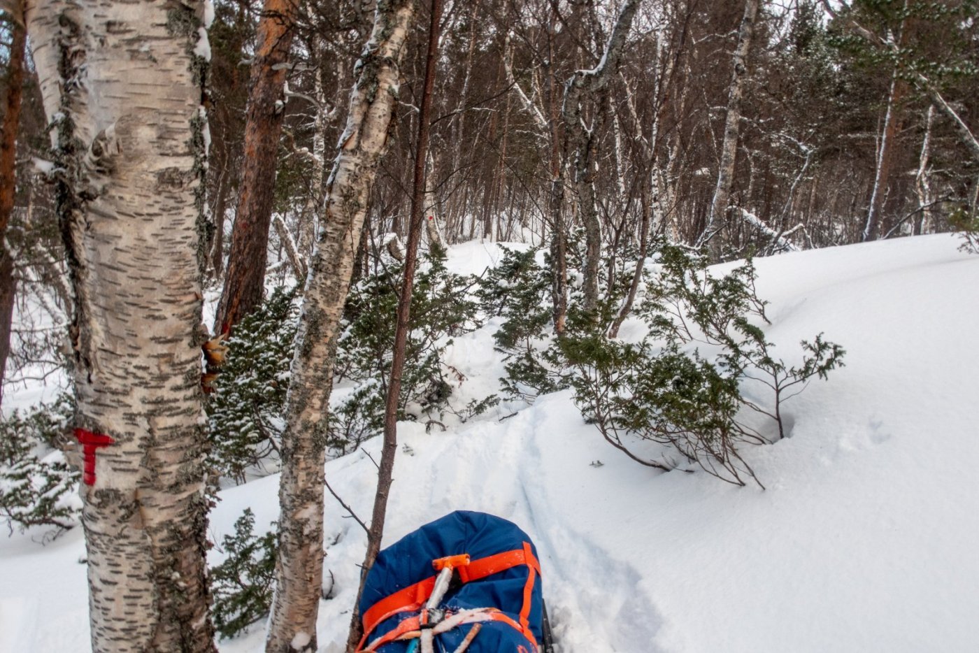 ✔️Januar Da var månedens "gå-til-jobben"-aksjon gjennomført. Fra torsdag til fredag forrige uke. Januar måned har vært preget av enorme snømengder, regn, og mer snø. Det toppet seg med covid-utbrudd i barnehagen, flom på gårdsplassen, hjemmekontor, og jeg trodde ei lita stund at prosjektet skulle ryke allerede før det hadde begynt. Nuvel.. Værmeldinga helga før meldte en liten åpning med opphold mellom torsdag og fredag 27. - 28. januar. Minstejenta måtte være hjemme fra barnehagen og madammen hostet sammenhengende. Det gikk hardt ut over hurtigtestene forrige uke. Torsdagen kom og jeg hadde ingen symptomer eller utslag på hurtigtester og øvrige familiemedlemmer var på bedringens vei, så da var det bare å spenne på seg skiene og dra. Pulken har jo vært klar i flere uker allerede.. Nå var jeg endelig på tur! Barnepulk og 40 cm nysnø skulle vise seg å bli krevende. I tillegg til at det var djupt spilte heller ikke føret helt på lag: -2°C og regn gjorde at fellene fort ble ubrukelige. Etter en liten kilometer var disse så nediset at jeg ikke hadde noe feste. Jeg hadde så vidt begynt på stigningene før jeg måtte bytte fra feller til festesmuring. Nydelig vinterføre, men dette skulle bli i tyngste laget. De første fire timene var et salig slit i djupsnøen, og jeg skjønte at denne turen ble krevende, mye mer krevede enn først tenkt. Jeg hadde som mål å komme meg til fjells før det mørknet ut, men det var bare å glemme. Når jeg kom så høyt at jeg kunne se huset hjemme, tok jeg på meg hodelykt, ringte familien og sa at jeg hadde det bra tross lavt tempo. Da hadde jeg såvidt kommet meg over tregrensa. Eller 3,5 km på 3,5 time.. Fredagen uka før gikk jeg til samme høydedrag, for å lage "løype", da brukte jeg 1 time og 20 minutter, inkludert ei brødskive og en appelsin. Løypa var forresten ikke i nærheten av å være synlig. Det lå minst en meter snø oppå løypa. Når jeg hadde passert første fjelltopp (Båtfjellknausen) kom jeg på litt mer vindpåvirket snø, og det ble litt enklere føre. Dessverre hadde den lilla festesmurninga som jeg brukte tidligere, alt for godt feste mot den kalde snøen i fjellet. På baksiden av Båtfjellknausen tok det seg også opp med vind og snø. Det var med andre ord null sikt. Jeg gikk kun på GPS, men i kjent og flatt terreng gikk dette nokså greit. Planen var å komme forbi "vannskillet" slik at jeg bare hadde nedoverbakker på dag 2 på tur til jobb. Jeg gikk hele turen med pulsklokke. Torsdagen gikk jeg 9,26 km og brukte 6 timer og 27 minutter, en snittfart på 1,24 km/t og en gjennomsnittspuls på 153 bpm. Til slutt måtte jeg bare kapitulere for manglende krefter, samt at klokka begynte å bli mye med tanke på at jeg hadde en morgentur jeg skulle rekke. Halv ti bestemte jeg meg for å slå leir og sette opp telt. Vel fremme i teltet tok jeg til å koke vann og nyte ei iskald Coca-Cola. Jeg prøvde meg på en pose Real Turmat, men etter tre skjeer var det stopp. Bikkja var ikke helt sikker på hva hun skulle mene om denne turen. Hun har aldri vært med på noe som har vært i nærheten av dette. Hun var også veldig sliten, og lå hele natta på samme plass inne i innerteltet på jervenduken. Hun fikk mange rypesituasjoner å jobbe med, men som den unghunden hun er ble det bare støkking. Siden hun også er blandingsrase er det jo heller ikke 100 % sikkert at hun noen gang vil ta stand. Jeg har jo hatt hjemmekontor hele januar.. Så kontorutstyret måtte være med over fjell. Jeg prøvde meg på å jobbe litt i teltet, men pcen slo seg av, antakeligvis på grunn av lav temperatur? Jeg har fått mange gode tips her på forumet om telting på vinteren. Jeg endte til slutt med å lage meg egne snøplugger av strø, og så kjøpte jeg tre pakker med snøplugger på thansen. Og jeg supplerte med både ski og staver. Utpå natta tok det til å blåse, og ut fra meldingen vil jeg tro det var en plass mellom stiv kuling og liten storm i vindstyrke. Teltet sto fjellstøtt! Jeg slet litt med å sove til å begynne med. Kroppen min verket, det vil si krampetendenser, og jeg hadde ikke fått i meg særlig næring. Jeg våkna flere ganger mellom 23 og 01:30. Da bestemte jeg meg for å stå opp å spise resten av Real Turmaten, drikke mer vann og gå ut på do, før jeg gjorde et nytt forsøk på å krype ned i posen. Da sov jeg uavbrutt til vekkerklokka ringte 07:30. Deilig! På morgenen tok jeg meg endelig bryet med å ta det klassiske "utenfor-teltet-bildet". Her hadde jeg som smått begynt å pakke sammen tingene for å rekke jobb klokka 09:00....(!) Etter et times gåing begynte det å lysne og fjellene kom til syne. Den toppen man ser bakerst på bildet er Solvågtind. For oss lokale er dette et kjent fjell langs denne ruta, men de fleste kjenner det nok best igjen fra øst. Etter å ha gått stort sett hele torsdagen i mørket, var det deilig at dagslyset kom mer og mer frem utover fredagen. Men her skjønte jeg at tidsskjemaet kom til å ryke så det holdt. Ølfjell i Saltfjellet-Svartisen nasjonalpark. Her var det rart å forestille seg at Saltdal skulle ligge mellom meg og fjellet, for det syntes så nært. Etter hvert bar det nedover mot jobb. Rundt 700 høydemeter skulle forseres, noe som heller ikke var bare bare med pulk. Nå var jeg faktisk litt glad for den dype snøen. Terrenget er formet som terrasser. Der man går en terrasse 500 meter, slipper seg ned 50 meter, før man går neste terrasse 500 meter (se kart under så skjønner dere). Disse terrassene var ikke akkurat flate som fotballbaner, men småkupert og skogkledd. Dette var siste bilde jeg orket å ta fra turen. Det viser godt hvordan de siste kilometerne var. Når jeg endelig kom på kjerreveien, som skulle bringe med trygt ned til Storjord, så satte jeg meg i hockey og lot pulken presse meg ned bakkene. Helt til de siste 500 meterne. Der var det nesten ikke snø igjen, og det var stort sett bare is på veien. Nye utfordringer, n