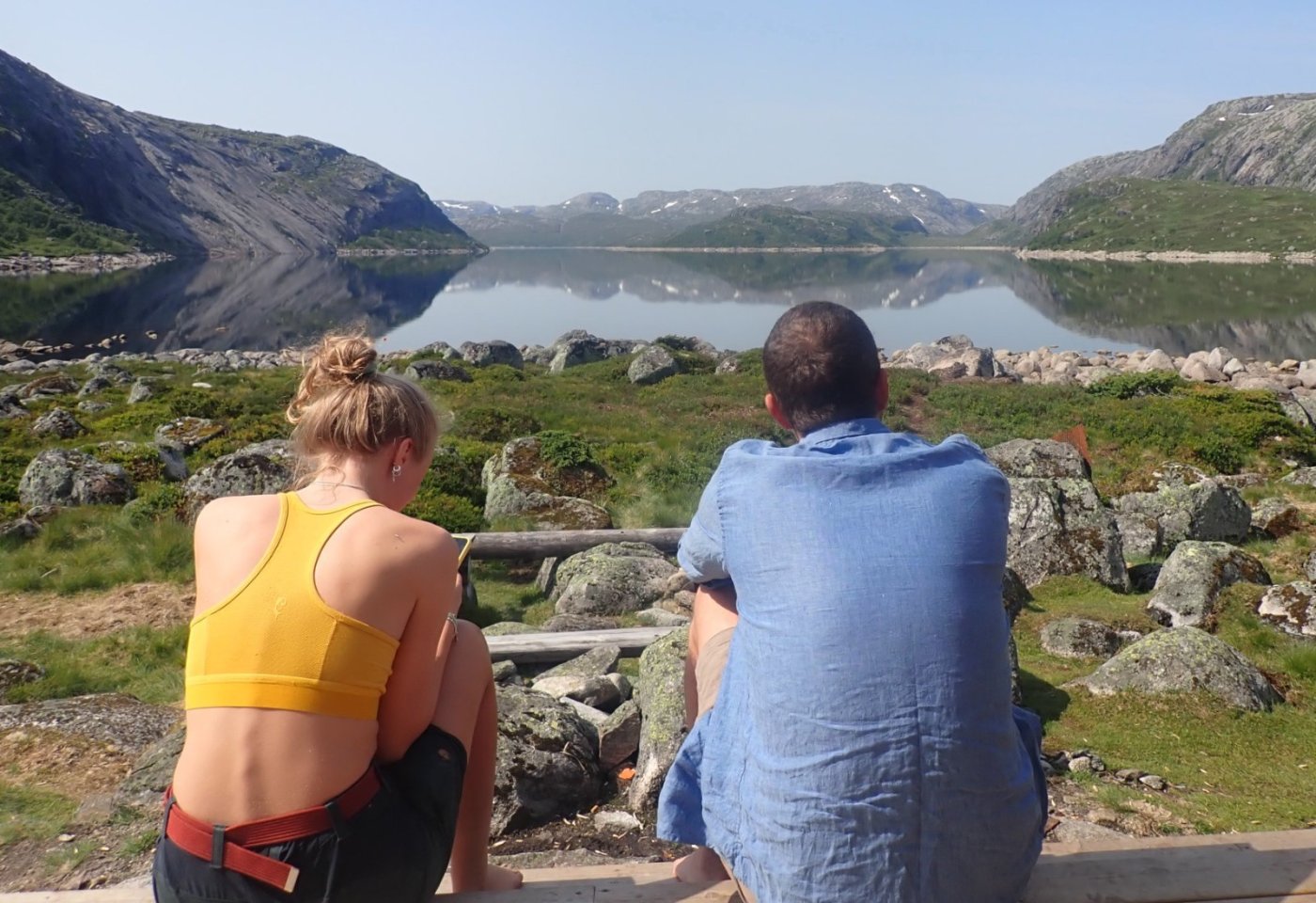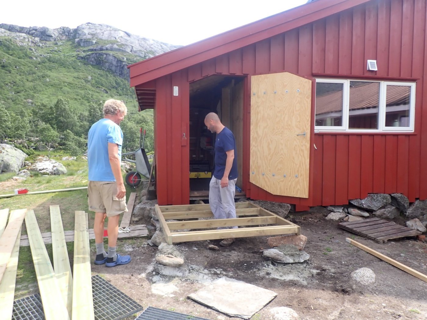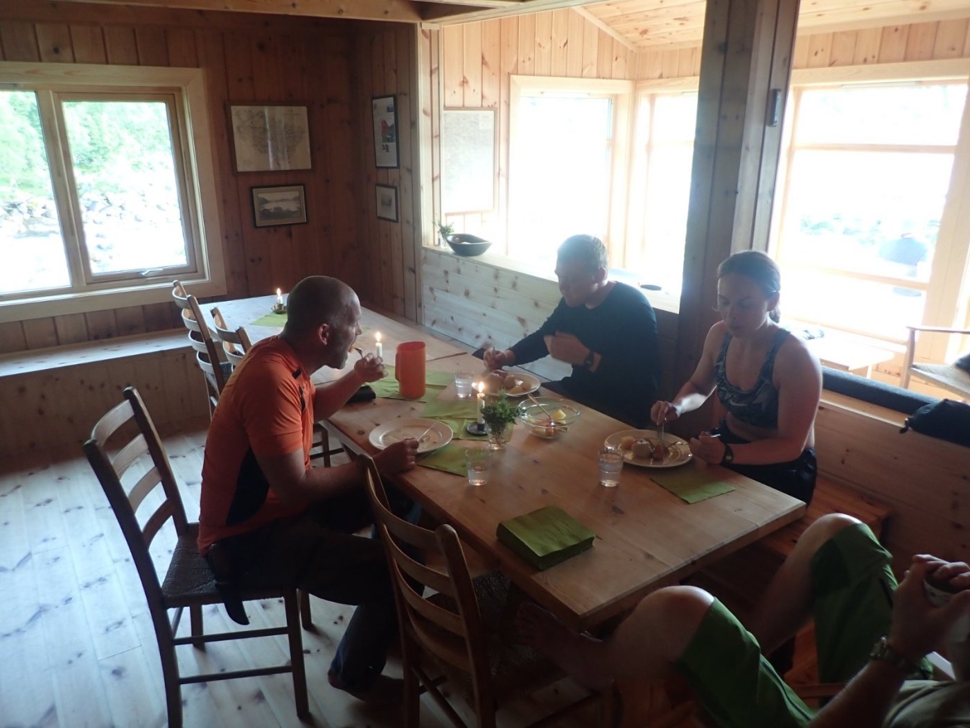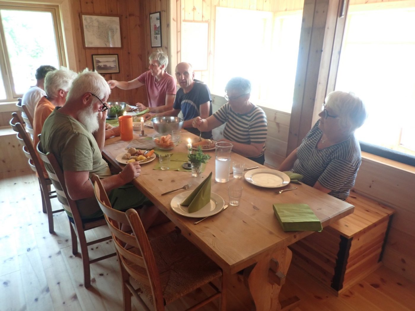 Flott vær og mye folk. Det var endelig mulig å få til en uke som hyttevakt på Nilsebu. De to siste årene har Corona satt en stopper for denne tradisjonelle turen. Dette året ville vi innover. Nå viste det seg at alt ikke var på stell. Båtmotoren, som for en av oss, er nødvendig for å komme inn til hytta, hadde fått hoste og slag. Den stoppet og gikk bare av og til. Ikke helt bra for oss som må ha denne i orden. For et styr det er å få med seg alt som er nødvendig, sammen med en god del unødvendige ting, og en del «kjekt å ha». Tilsammen blir dette et godt lass. Poser, esker og ryggsekker, samt stav, fjellsko (som ikke ble brukt) og en del cola. Nødvendig for meg som, cola-avhengig. Som alltid er det virkelig kjekt å se hytta dukke opp i enden av Nilsebuvatnet, - og vite at det er en del dager før vi trenger å tenke på sivilisasjonen. Nå betyr det å være hyttevakt også en del arbeid, og denne gangen hadde Per tenkt at jeg skulle svinge malerkosten. Nilsebu, opprinnelig fra 1911, men pusset opp et par ganger, har fått en skikkelig opprusting det siste året. Mye av det gamle er behold, og jeg mener hytta har beholdt den hyggelige «stemningen» og stilen. Med en stor oppgradering, følger det også at alt ikke er helt ferdig. Vi fant ikke verktøy, som burde være på hytta, men fikk likevel gjort noen småting, som å kle inn døra inn mot kjøkkenet og det manglet noen planker på et rekkverk. Det ble straks mer orden på sysakene da Odd Steinar ankom. Han fant verktøyskrinet og drillen som var godt gjemt inn under trappa. Med kyndige folk på plass ble det også mulig å montere saga. Tirsdag var det tid for den tradisjonelle komlemiddagen. Gjestene som kommer den dagen kan velge å få servert komler av hyttevakten. For de fleste var dette en stor overraskelse, men ingen sa nei-takk denne gangen. Vi ble 8 som satte oss til bords og det var tre til som kom litt for sent, men som fikk middag likevel. Det er litt rart at noe så enkelt som å spise et måltid sammen, gjør at deltakerne blir en sammensveiset gjeng. Det er alltid kjekt å servere komler. (Denne gangen var det Bestyrerinnen som sto for matlagingen.) Hver gang vi gjør dette på en selvbetjent turistforeningshytte, blir det en skikkelig hyggelig opplevelse. Vi får nesten nye venner og blir god kjent med folk vi bare har snakket med i noen timer. Ut på tirsdag ettermiddag kom det en kar fra Eidavatn. Det var Alexander Rügert-Raustein, leder av MDG sin gruppe på Fylkestinget. Han hadde hatt en lang og varm tur, og bestemte seg for å bli over en dag. Det passet nærmest perfekt for meg, da han fant ut at det var helt bra å ta i et tak. Han syntes det var helt greit å bruke materialer som eller ville blitt kastet, til noe fornuftig. Jeg følger ikke med i politikken på Fylkestinget, men jeg kan skrive under på at han er en dyktig snekker. Det jeg hadde brukt dager på, fikk han unna i løpet av noen timer. Det ble en ny platting utenfor kjøkkeninngangen. Stor takk for den jobben som ble gjort. Ganske ofte går det galt når jeg og maskiner barker i hop. En god del ganger har reserveløsningen ligget klar, og alt har gått greit. På tross av at jeg ikke fikk start på maskinen eller noe annet som gikk galt, så dukker det opp folk med erfaring og kjennskap til problemet. Denne gangen var det motoren som var i ustand. Og når den først stoppet så skjedde det ved dammen. Vi på den ene siden og Sverre med båten på den andre side, Båten var umulig å få gang på. Sverre var på dammen for å hente folk som ville inn til hytta. Odd Steinar og to andre ville på tur – og overnatte på hytta noen dager. Selvsagt hadde Odd Steinar krok på bilen, og like selvsagt kunne han starte og manøvre den store båten. Som sto godt plassert på land, og ikke til vanlig bruk for hyttevaktene. Etter en stund – en lang stund, kunne vi se en båt komme i mot oss. De dagene vi var på besøk på Nilsebu, traff vi mange kjekke mennesker. Det var familier, Far og datter og gamle kamerater på tur. Nilsebu tok vel i mot alle som kom, selv om det ble trangt på loftet da 12 tyske unger skulle finne seg plass. De var på en riktig langtur opp i høgheia, noe jeg synes er modig gjort. Så slo Coronaen til. Torsdag hadde Odd Sigve meldt at han måtte tilbake til bilen, og alle som var på hytta slo følger. Etter en flott frokost laget av Bestyrerinnen.2 poeng