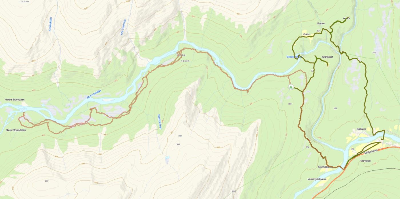 ✔️ Juni Da jeg bestemte meg for å gjennomføre dette "gå-til-jobben" prosjektet i vinter, hadde jeg allerede pekt meg ut junituren. Gjennom jobben hadde vi allerede datofestet en befaring til fjellgårdene ved Bredek i Saltfjellet-Svartisen nasjonalpark (Bredekrunden), og jeg skulle dagen i forveien dra opp i Stormdalen, til fjellgården "Nordre Stormdalen". Juni i nord har vært ganske hustrig (kald og våt), med flere frostnetter og lave temperaturer. Uka før jeg skulle av gårde steg temperaturene, og det samme gjorde vannstanden i elver og bekker. Flere dager på rad hadde vi over 30°C her hjemme i Saltdal, og "vår" elv passerte femårsflom (hadde heldigvis en smelteperiode i slutten av mai som hindret riktig storflom). Jeg begynte å tvile på om det i hele tatt var mulig å gjennomføre den planlagte turen i Stormdalen. For de som kjenner dalen, så vet man at det fort fylles med vann innenfor Skarpnesen. Elva snevrer inn her, og klarer ikke å ta unna når det smelter mye snø, eller når det regner kraftig, og den flate dalbunden ovenfor oversvømmes. I tillegg går det ofte skred som demmer opp elva. Derfor er det ofte flom i Stormdalen. Jeg ringte til flere ansatte i Statskog Fjelltjenesten (først og fremst i forbindelse med befaringa til Bredek) og fikk like mange svar som personer jeg ringte til. Jeg bestemte meg for å gjennomføre turen, til tross for flomstore elver! Jeg var likevel fast bestemt på at jeg ikke skulle ta noen sjanser med tanke på sikkerhet, og var egentlig ganske innstilt på å måtte snu ved Sløybekken. Turen opp og inn mot Stormdalen, starter langs med Bredekrunden. Ovenfor Stormdalshei kommer man inn i Saltfjellet-Svartisen nasjonalpark, og akkurat på vernegrensa får man en flott utsikt ned mot Tespa. Den uregulerte elva, som i sin tid skulle overføres til Bjøllådalen, bruste godt der den utemmet slynget seg ned fra nasjonalparken. Etter stidelet mot Stormdalen fikk jeg betrakte elva Stormdalsåga på nært hold. Da føltes det godt å stø seg til denne kjempegrana (som en av de nordligste, i det naturlige utbredelsesområde for gran i Norge) som sikkert har stått gjennom både én og to flommer tidligere. Jo lengre inn jeg kom, jo mer tydet det på at jeg var det første mennesket til å besøke Stormdalen i 2022. Dette er ikke en dal man går inn i vinterstid, da den er forbundet med særdeles stor snøskredfare. Skarpnese kan sees som en "inngang" til Stormdalen. Her åpner dalen seg opp og vier seg ut, og det flotte landskapet kommer mer til syne. Stien går egentlig rett frem, og til venstre i bildet kan man skimte en klopp i vannet. Hele dalen er godt klopplagt, men disse lå nå og fløyt i vannet. Disse er forankret i steiner og røtter, slik at man slipper å hente de ute i Ranfjorden vær vår. Nå ligger de sånn høvelig der de skal være. På dette punktet lå stien under to meter vann. Små sildrebekker hadde blitt til store fosser, som kastet seg ned fra fjellsidene. Etter å ha sloss med kratt og vann, kom jeg inn på stien igjen lengre inn i dalen. Her skimter jeg Nordre Stormdalen-fjellgård i det fjerne. Dette var det nærmeste jeg kom fjellgården. En 200 meter bred elv gjorde det umulig å komme seg til andre siden. Ved normal vannstand kan man trekke seg over med trekkbåt. Slik det var nå var det umulig å komme seg dit trekkbåtsystemet startet, og wiren til trekkbåten lå under vannet. Det ble derfor ikke anledning til å besøke fjellgården. Fjellgården er åpen for alle, og eies av Statskog. Det er brukt betraktelige midler og ressurser på å holde den i stand. På vei innover dalen gikk jeg mest mulig parallelt med stien i lavlandet, men terrenget var bløtt og skogen tett. Tilbake valgte jeg å gå en litt annen rute høyere oppi fjellesiden (se GPX-spor på nederste kart. En fjellside som bar preg av mange ras, og der rasene som hadde gått i vinter lå det fremdeles et tykt lag snø. Langs sidene lå skogen flat flere plasser. Dette var skog som var tatt av et av fjorårets ras. Tre ras fra årets vinter måtte forseres. Det var enklere å gå her enn nede på flata, så da kan dere forestille dere hvordan dét var. Her er eneste bilde fra flatene som viser "jungelen", men dette lyger litt for det viser ikke alt vannet man samtidig måtte forsere. Slik så i alle fall sporloggen ut etter å ha kommet inn i den verste krattskogen. Elva hadde pressa seg opp i myra øverst i kartet. Tre plasser måtte jeg forsere nye ras. Her ser jeg nedover i nydelige Stormdalen. Skarpnesen, som jeg har referert til et par ganger, er den ryggen som kommer ned fra høyre lengst bort i bildet. Her kan man også se de flotte fossefallene som kaster seg utfor fjellsidene. Det var fire-fem mektige fosser på motsatt bredd. På min side av dalen var det bare to bekker som måtte forseres. Jeg var som sagt innstilt på å kapitulere ved Sløybekken, men med vandrestaver og leting etter egnete plasser å krysse, gikk dette problemfritt uten noen risiko (utenom å bli våt på beina da..). Vel ute av selve Stormdalen slo jeg leir og fikk testet noe av det "nye" ultralett-utstyret. "Nye" fordi jeg har kjøpt det inn over flere år, men har ikke hatt så mange anledninger til å bruke det. Her koker jeg vann med MSR PocketRocket II, i en Snønix-titankjele. Jeg ble imponert, og vannet kokte raskere enn jeg hadde forestilt meg. Usikker på tiden, men jeg skulle bare bort til teltet og hente bestikk, og på den korte stunda jeg var borte begynte vannet å koke. Riktignok bare 4 dl. Jeg fikk også testet Helsport Ringstind 1 som jeg kjøpte i fjor sommer på XXL-reward-tilbud (3999,-), til akkurat denne typen turer. Det er et telt man kler på seg, men jeg sov godt gjennom hele natta. Litt vanskelig å få det stramt i hodeenden, men det kommer seg sikkert med litt øvelse. Nå skal det sies at været ikke satte teltet på en eneste prøve, med verken vind, sol eller regn... Dagen etter gikk jeg ned til Storvollen igjen for å mø