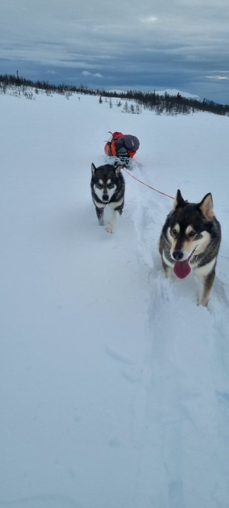 Utvalg av bilder fra denne vinteren! Skaffet meg en til hund i slutten av høsten 2021 og min erfaring med polarhund er nokså fersk (siden 2019). Var veldig spent og brukte langtid før jeg kom skikkelig i gang med hundene foran pulken. Turene frem til slutten av februar har i hovedsak vært i å ha med bikkja (ene) på tur, til nå å være på tur med bikkjene. Det vil si forflytning fra A til B og tilbake med bikkjene som drar pulken hele veien. Som har vært en viktig milepæl og grunnen til at jeg ønsket å få meg polarhund 🐕🦺 Samtidig få en skikkelig kul tur. Vært veldig usikker på alt. Alt fra hvor langt kan jeg dra, hvordan er terrenget der jeg skal gå, hvor mye kan pulken veie, hvor mye tåler de, hvordan er føre, blir de lei av å trekke, har jeg god nok kontroll osv osv. Hadde hjerte i halsen første gang, har litt erfaring med en hund i fastdrag, men to stk halv ville i line er anna "ball game" Spesielt med en halvrufset hannhund i front på 3-4 metersline + pulk + 3,5 snøre fra pulk til meg. Men det har vært ekstremt morro og ekstremt lærerikt. Alt fra full fres i skogen og i ny spora løyper (tidlig på morgen kvisten, før hytteadelen våkner), hvor jeg har hatt nok med å holde meg fast meg begge henda i snøre og styre pulk. Bånngass ned skogen på vei ned fra fjellet, med håp om at bikkjene må bli slitne snart?? og sette ned tempoet! En episode med fullstendig kaos med pulkvelt, trynings på ski og to bikkjer som forsetter fremover med en langflat mann og velta pulk på slep uten å stoppe. Resultat: at jeg desperat holder meg fast i tre og prøver å få kontroll på bikkjene som desperat skal hilse på en premiesetter (som selvfølgelig er løs). Fikk kontroll, ingen skade skjedd og de fikk så vidt snust på hverandre Men fikk en sur kommentar fra hyttemannen med premiesetteren om jeg må ha bedre kustus på bikkjene mine. Uansett var det morro læll og god erfaring Kjøpt meg et anker som brukes til hundekjøring. Tenkte det var en god ide, beste kjøpet jeg har gjort det siste året... Fikk siste turen denne vinteren i helga, 1000 høydemeter opp og ned og rundt 3 mil +. Drit fin avslutning på vinteren, mange erfaring og tanker som er blitt gjort for denne vinteren. Glede meg til neste vinter allerede nå, selv om kløvsessongen er rundt hjørnet.1 poeng