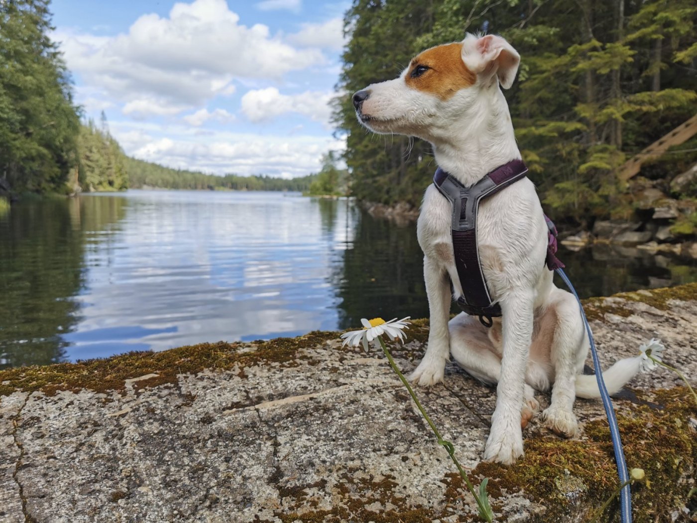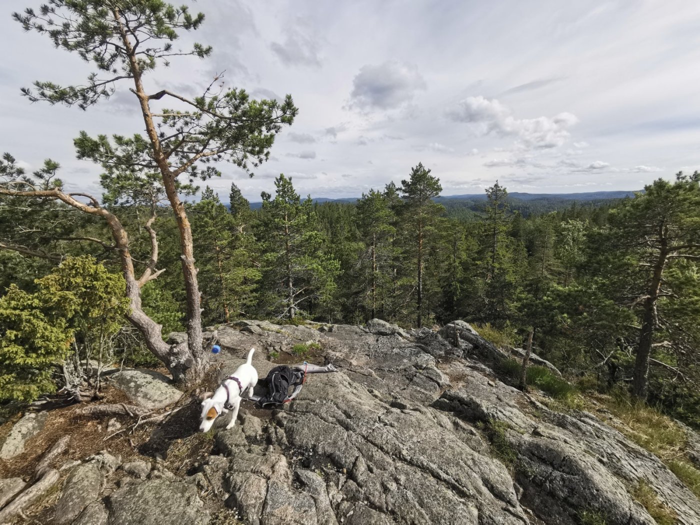 Spot er ikke min hund, men broder's sin. Spot er en Parson rusell terrier og han har passert året med en måned. Jeg passer ham i to uker og vi går masse turer sammen. I går ble det en 14 kilometer lang rundtur i Østmarka. Her er vi helt vest i Ramstadsjøen. Her ble det bading på meg. Spot har ikke turt å legge på svøm enda, så på ham ble det bare vassing. Fin vanntemperatur da, 15-20 grader minst. Og her er vi på toppen av Ramstadslottet. Ramstadslottet er med sine 394 meter over havet Østmarkas tredje høyeste topp etter Barlindåsen (398) og Bjønnåsen (396). Når det gjelder utsikt synes jeg de alle tre bytter plass seg i mellom (men andre kan være enda bedre): Ramstadslottet på 1. plass, Bjønnåsen på 2. plass og Barlindåsen på 3. plass.1 poeng