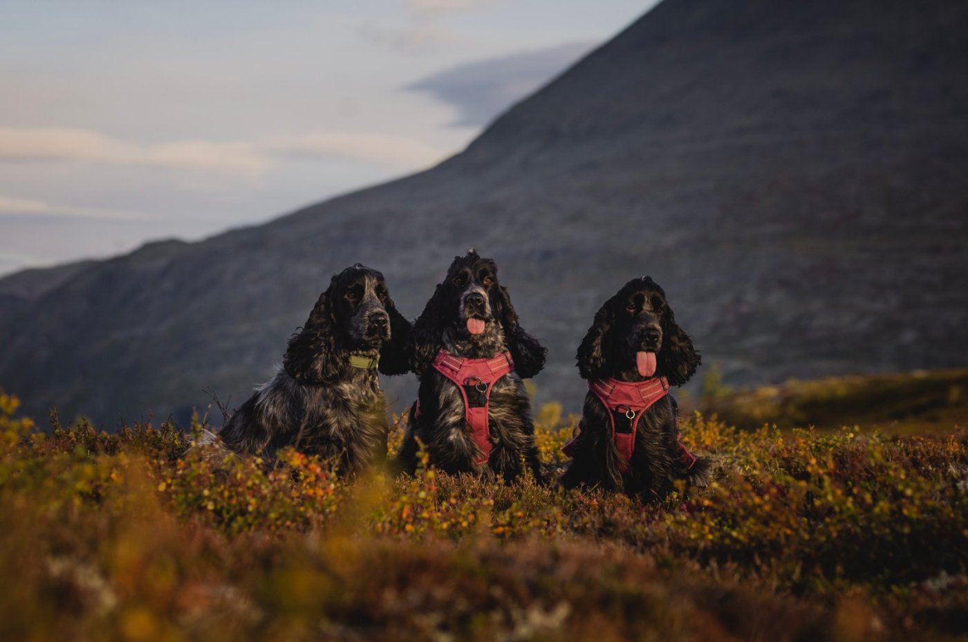 Tre av våre totalt fem cockere. Da spaniel av typen engelsk. Benytter anledningen til å si at engelsk cocker spaniel er en fantastisk allsidig rase med veldig mye kapasitet. Dette er solide turkompiser selv om de er langhåret. Våre er med på alt fra fisketurer, fjellturer, bading, turer i myr og turer godt utenfor sti. Med riktig pelsstell kommer man langt og med riktig pelsstell mener jeg alt annet enn barbering. Å barbere denne rasen, som jeg ser altfor ofte, er en latmanns løsning som er ren idioti.1 poeng