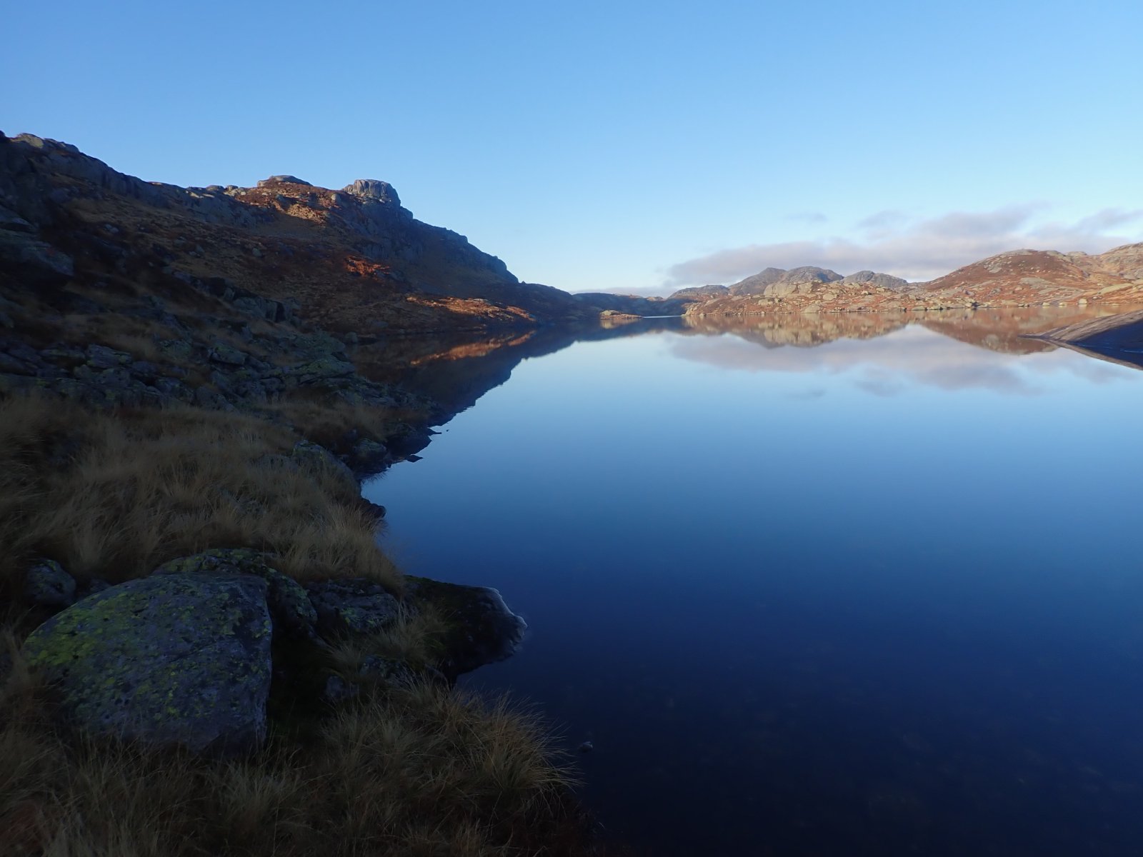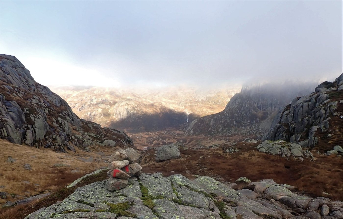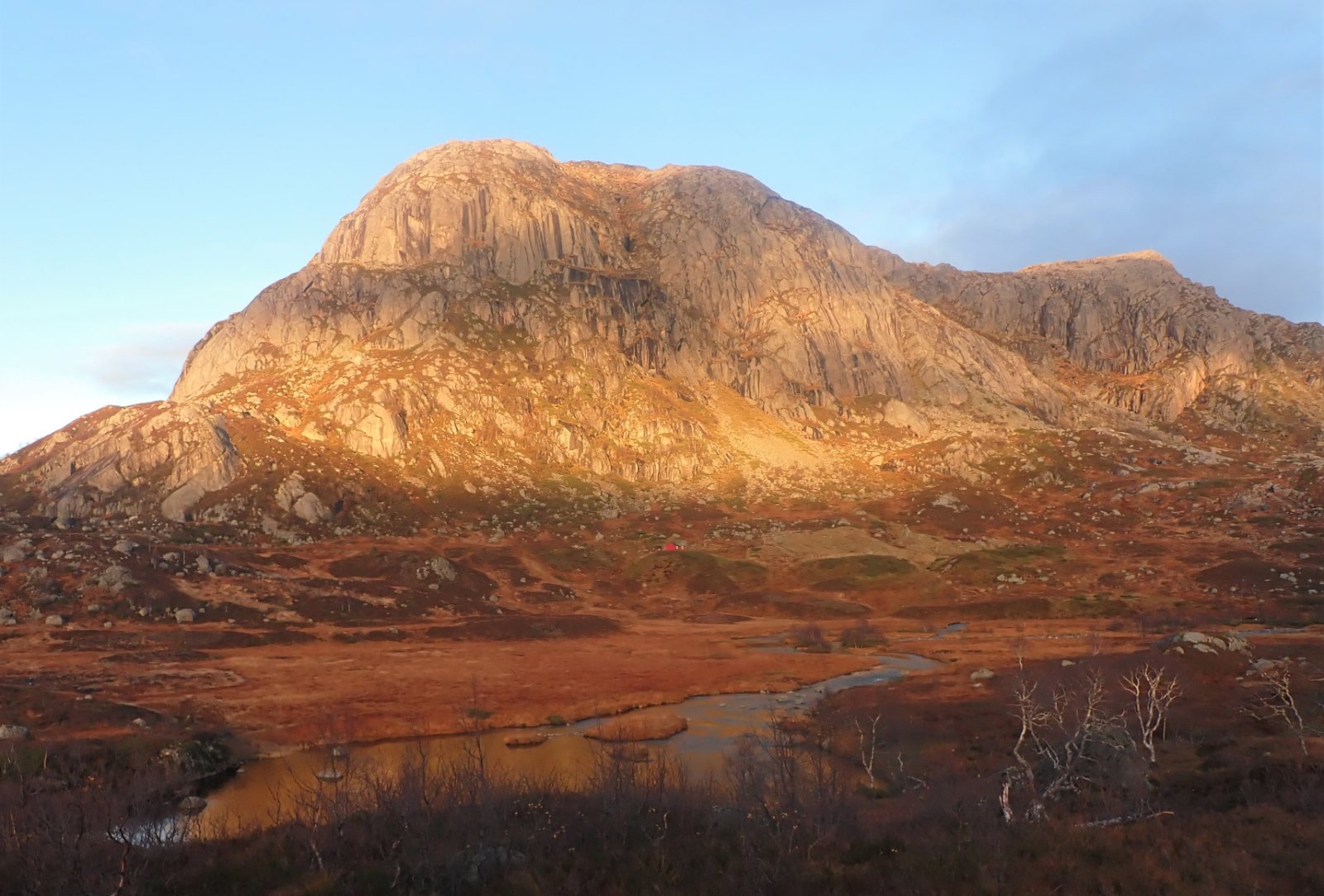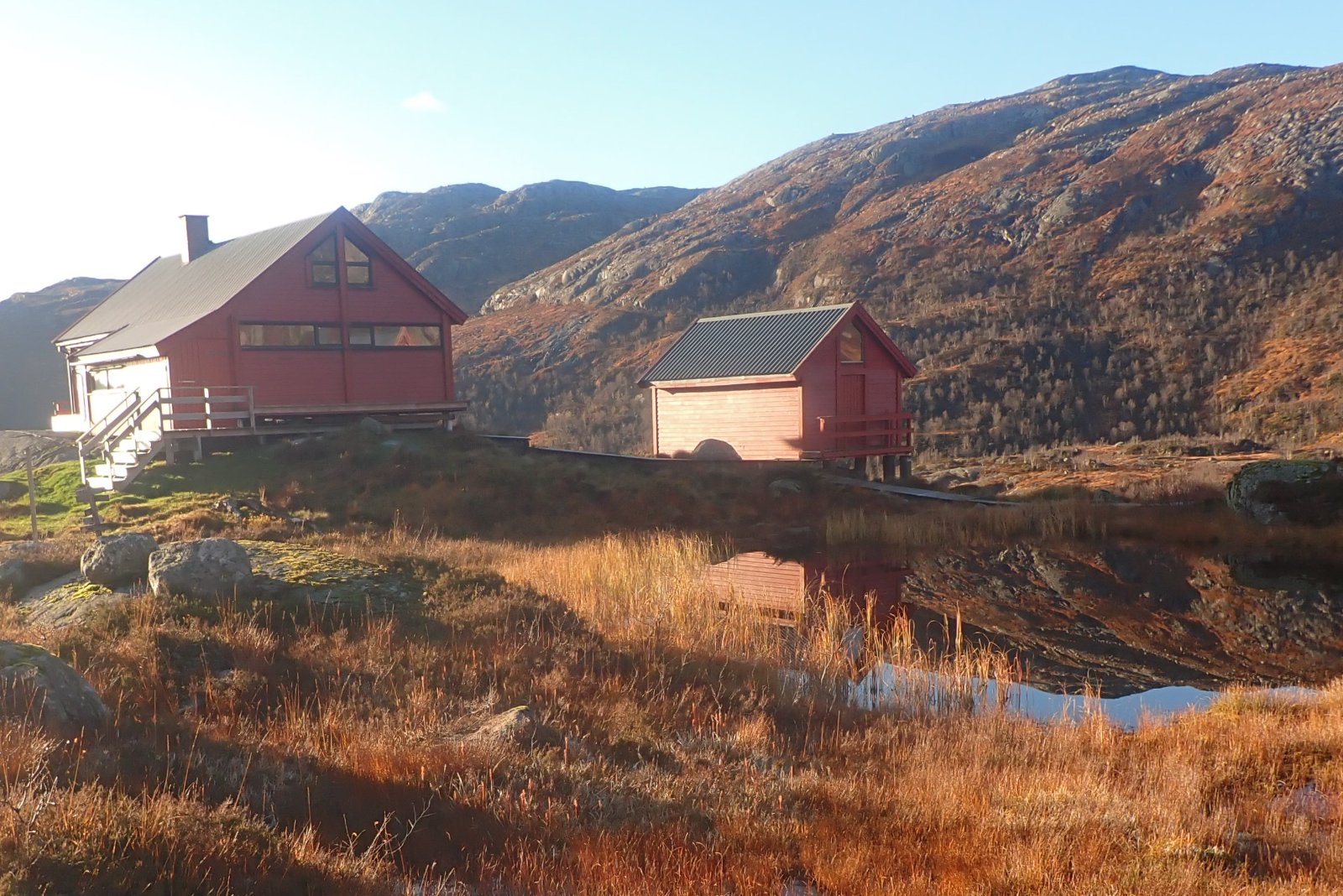 I forrige uke kom jeg meg ikke til Blåfjellenden. Det har egentlig blitt litt for mange uker uten at jeg har kommet meg innover til hytta denne sesongen. Noen ganger på grunn av tur til «syden» eller andre fjellturer, men denne gangen var det "sosiale forpliktelser". En riktig dårlig grunn for å holde meg vekk fra Blåfjellenden. Denne uka ble alt så meget bedre. Så sent på året som i slutten av oktober, avgjør været når jeg tar innover i heia. Yr mente onsdag til torsdag ville være greit. Lite nedbør og lite vind, men kaldt. Etter som onsdagen nærmet seg, ble varselet «bedre» med sol inne i mellom. Sekken ble pakket og jeg gjorde meg klar for tur. Det er virkelig kjekt å kunne gå innover heia så pass sent. Naturen er ganske annerledes enn tidligere på året – og på vinteren for den saks skyld. Det er fortsatt farger, men grønnfargen fra tidligere på året mangler. Det er dype rødfarger og brunt som dominerer med litt gule strå. Flott farger det også, men lengre nede er bjørka gylden gul og skikkelig flott. Oppe i heia har bladene på trærne forsvunnet og de står stort sett nakne igjen. Mot normalt er rognbærtreet utenfor stuevinduet på hovedhytta uten røde bær. Det treet pleier å ha store mengder bær, dette året er det ingen. Jeg lurer på om det betyr lite eller mye snø senere på vinteren? Da jeg startet fra parkeringsplassen i Hunnedalen, var det overskyet. Det tok ikke lang tid før sola tittet frem, og rett etter forsvant skyene og det ble blå himmel. Et virkelig flott turvær, nettopp slik vær som gjør turen til en opplevelse. Det tok ikke lang tid før de første spor av vinter dukket opp. Bak en stein, var en pytt isdekket. Det var bare et tynt islag, men likevel vinteren første. Nå var det ikke store problemet om det var litt is enkelte plasser. Stor sett var det tørt og isfritt, jeg hadde i hvert fall ikke problemer med å gå innover. Noe jeg ikke var helt sikker på da jeg pakket for turen. For meg som har tråkket denne stien i noen år, så legger jeg selvsagt merke til de «vanlige» forberedelsene for vinteren. Porten til Olav står åpen og det er ikke nødvendig å bruke gjerdeklyveren. (Det la jeg selvsagt ikke merke til på vei inn, og klatret over gjerdeklyveren – helt unødvendig.) Lengre oppe i lia, ligger sauegjerdet nede. Noe som blir gjort for at snøen ikke skal ta hele gjerdet. Jeg kom ned til Blåfjellenden i et virkelig flott vær. Sola sto lavt og lyste opp heia i gyldne farger. Virkelig flott. Det var langt fra sommertemperatur, så sola, og ikke minst solnedgangen ble beundret gjennom vinduet. Det ble en kveld med lesing og litt kikking ut vinduet for å se om det skulle komme andre. Jeg ble alene. Morgenen ble også flott, men i løpet av natten blåste det opp og vinden tok bra ved hytta. Temperaturen den natten var like rundt null, med vind, så ble det en sur start oppover bakken. Det tok ikke lang tid (bakken er bratt) før jeg var varm og svett. Det var mer is og frost enn dagen før, og jeg kunne ikke gå på ganglemmene ved hytta. De var islagt. Over heia fikk jeg en grei tur. Været var ikke så bra som dagen før, med mer skyer, men så lenge regnet eller snø holdt seg vekk, så er det ikke grunn til lå klage – i slutten av oktober. Sola skinte på fjellene bak meg mot Lysefjorden, men over meg lå det skyer. De hang på toppene, og gjorde det ganske mørkt. I Hunnedalen var det tid for en liten oppsummering. Får jeg flere turer innover i år, eller var dette siste turen. Og om jeg går innover, får jeg godt eller dårlig vær. Vi får se...2 poeng