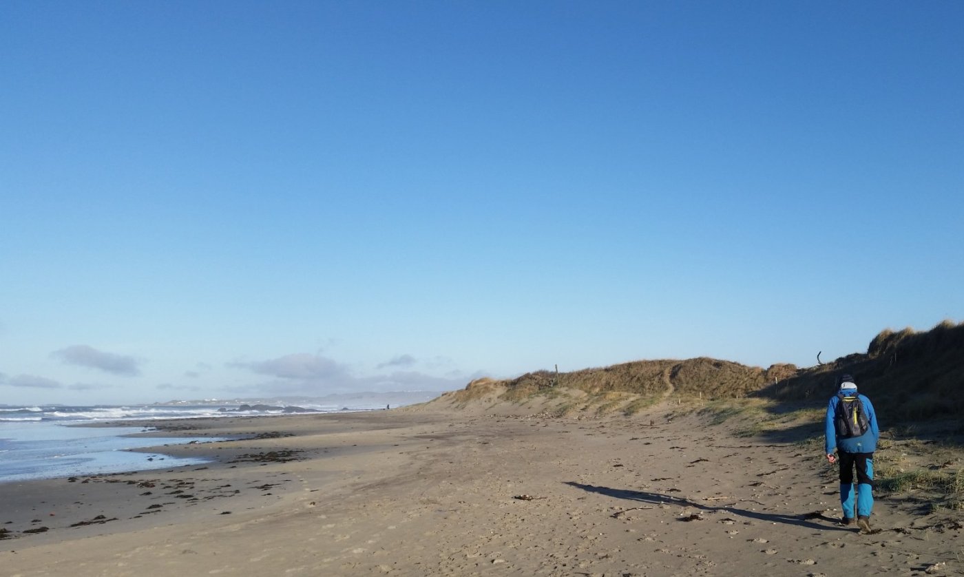 Planen var å gå i bakker, det ble stranden. Det har blitt mange turer uten følge den siste tiden. Broderen har hatt problemer med akillessenen, og så kom det en smell i ankelen i tillegg. Det har blitt mange små og korte turer på den karen – uten meg. Bestyrerinnen mener jeg burde ta det mer med ro, og er svært godt fornøyd med litt kortere turer. De lengre turene, blir litt ensomme. Bortsett fra et det kan være mange folk på de samme stiene som meg. Spesielt om det blir tur fra Gramstad. Det er vel heller ikke til å stikke under en stol at mange av mine jevngamle, synes det er litt «ekstremt» å ta ut på to-tre timers tur med sekk og i terrenget, tre fire ganger i uka. Bestyrerinnen mener nok at jeg – muligens -burde ta det litt mer med ro – etter tretti år med tur. Så dukker det opp folk som har noen flere år enn meg på baken, og gjerne vil være med på en utflukt – eller to. Om ikke de lengste og tyngste med en gang, men gjerne med litt utfordringer. Einar, en kar fra nabolaget, med mange turer bak seg, kunne tenke seg å bli med. Siden det fortsatt er vinterforhold, foreslo jeg å ta tur fra Sælandsskogen til Bjødnali. Den turen er er omtrent 7 kilometer, og det ville vi antakelig bruke to timer på. En passe tur og en grei «innkjøring». Vi ble enige om at jeg skulle kjøre og at vi skulle starte klokka elleve. Einar sto på trappa nøyaktig på tiden, men kunne opplyse at det var spinnglatt på veien. Det ble fort en omlegging av planene. Vi satset heller på en strandtur fra Bore mot Reve Havn og tilbake. Det er en litt lengre tur enn den planlagte, men nok en del «lettere». Det er temmelig flatt langs sjøen. En grunn til at jeg valgte å foreslå denne turen, er at det er en virkelig flott tur. Det er mulig å gå sørover på selve Borestranden, men det er et vel så flott landskap innenfor sanddynene. Flatt men flott. Fra enden av Boresanden og videre er det et helt annet terreng enn det som eller ofte finnes her ute i sjøkanten. Det er gressvoller under brinken, med beitende dyr – om sommeren. Stien følge sjøkanten, men gå noen meter fra vannet. Einar hadde vært på tur her en gang før, men var likevel glad for å kunne ta denne turen en gang til. Det gikk kjapt sørover til Reve Havn. Vi hadde vinden – ganske svak – bakfra og sola i øynene, på en flott turdag. Vi fant livd bak noen stor steiner ved havna, hvor termosen kom fram og det ble en kort pause før vi tok fatt på turen tilbake., fortsatt med høy himmel og sol. Telefonen sier at vi brukte litt lengre tid tilbake – et minutt – en sørover, men det føltes ikke sånn. Vi gikk i greit tempo og det virket som det gikk kjappere. Det er ofte slik når vær og selskap er bra. Det sto en kjent bil foran min da vi kom til parkeringsplassen. Wenche og Leif dukket opp. De hadde gått nordover til Sele havn, og hadde også hatt en flott tur. En flott turdag med fint følge.1 poeng