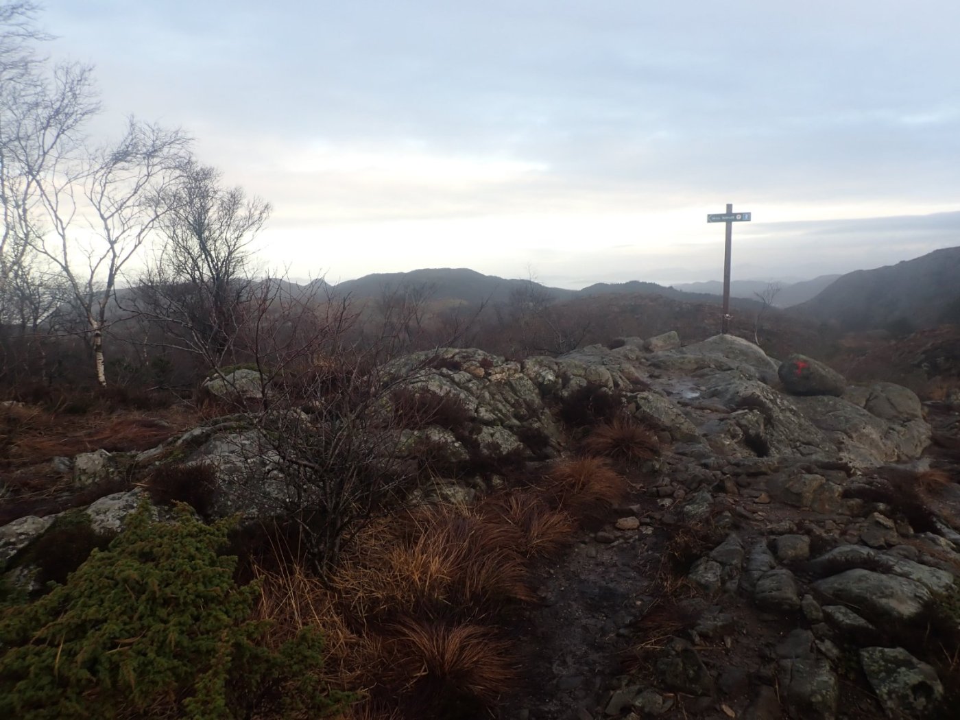 Vått, men flott. Det har vært opp og ned med temperaturen i slutten av januar. En liten periode med kulde og litt snø, har blitt avløst av litt varmere vær og inne i mellom opphold. Kulde og nedbør gir forhold som jeg ikke liker, og som gjør at sjøkanten er å foretrekke som turområde. Inne i mellom ser det likevel dager med så pass høy temperatur ar det burde være mulig å få til en tur fra Gramstad. Det har jo hendt at jeg har «kravlet» meg oppover – og nedover med is og snø i stien, men mer og mer blir det heller tur på flate Jæren med slike forhold. Jeg leste en plass at det hadde vært 28 regndager i Januar, og det kan jeg skjønne. Alt er vått. Pyttene har vokst til små tjern, småvatnene renner over, og bekkene går hvite. Vann over alt. Yr kom med varsel om lite eller ikke regn, og mulighet for litt sol, samtidig med lite vind. Her var det bare å pakke sekken og finne fram turklærene. Tanken var å ta til Gramstad og gå mot Mattisrudlå, Bjørndalsfjellet og Fjogstadnuten. Jeg så ikke for meg å ta med Dalsnuten denne gangen. En kjapp og grei tur på omtrent to timer. Det burde være tur nok en grå dag i slutten av januar. Det var andre enn meg som hadde fått med seg at denne dagen ville det være forhold for tur. Det var alt en del biler på Gramstad og en god del folk på vei. Jeg hadde tenkt meg til Mattisrudlå. Det er (minst) to veier opp til den toppen. Den vanligste veien er innover mot Paradisskaret og opp «Rindå» mot toppen. En bratt, og for meg ganske utsatt vei, som jeg kan bruke, men jeg finner det enklest å gå opp stien mot Bjørndalsfjellet og inn Bjørndalsmyra og til toppen. Det var vått oppover bakkene mot Bjørndalmyra, og enda våtere innover myra. Med noen lange steg kom jeg meg over myra uten å bli våt i skoene. Nok en gang kunne jeg takke en eller annen for å ha funnet på å bruke Gore-Tex i fjellsko. Mine Alfa Impact holder meg tørr på beina. Oppe i stien rett under toppen, kom det folk opp fra Paradisskaret. De var også på vei mot Bjørndalsfjellet. Vi tok følge et lite stykke, men folkene tok det rolig i bakkene. Andre var mer iherdige, og jogget forbi, oppover småbakkene. Fra Bjørndalsfjellet kunne jeg se at det var lysning i sørvest. Det kunne lett bli bedre være utover dagen. Muligens kunne det bli en tur oppom Dalsnuten? Selvsagt kom det en kar forbi oppover bakkene mot Fjogstadnuten. Han var sikkert 10-15 år yngre enn meg (eller muligens 5?), og uten sekk på ryggen. Det ble høy puls og tung pust – uten at jeg klarte å henge på.. Det ble til at jeg satte kursen mot Dalsnuten. I følge med mange andre. Selv om det var en lørdag, var det mye folk på tur. Det minnet mer om en søndag. Solskinnet ute i vest hadde nok for folk til å ta ut. For meg ble det bare en kjapp tur rundt varden på toppen, før jeg kom meg nedover bakkene – og trappene, mot Revholen og veien til Gramstad. Denne dagen ble det «bare» de fire vanlige toppene, og med Dalsnuten som avslutning ble turen noe under tre timer totalt. En flott men med mye vann og sorpe. Det var likevel en tur med både bakker og topper, noe mer en skikkelig fjelltur enn alle turene på flate stranden.3 poeng