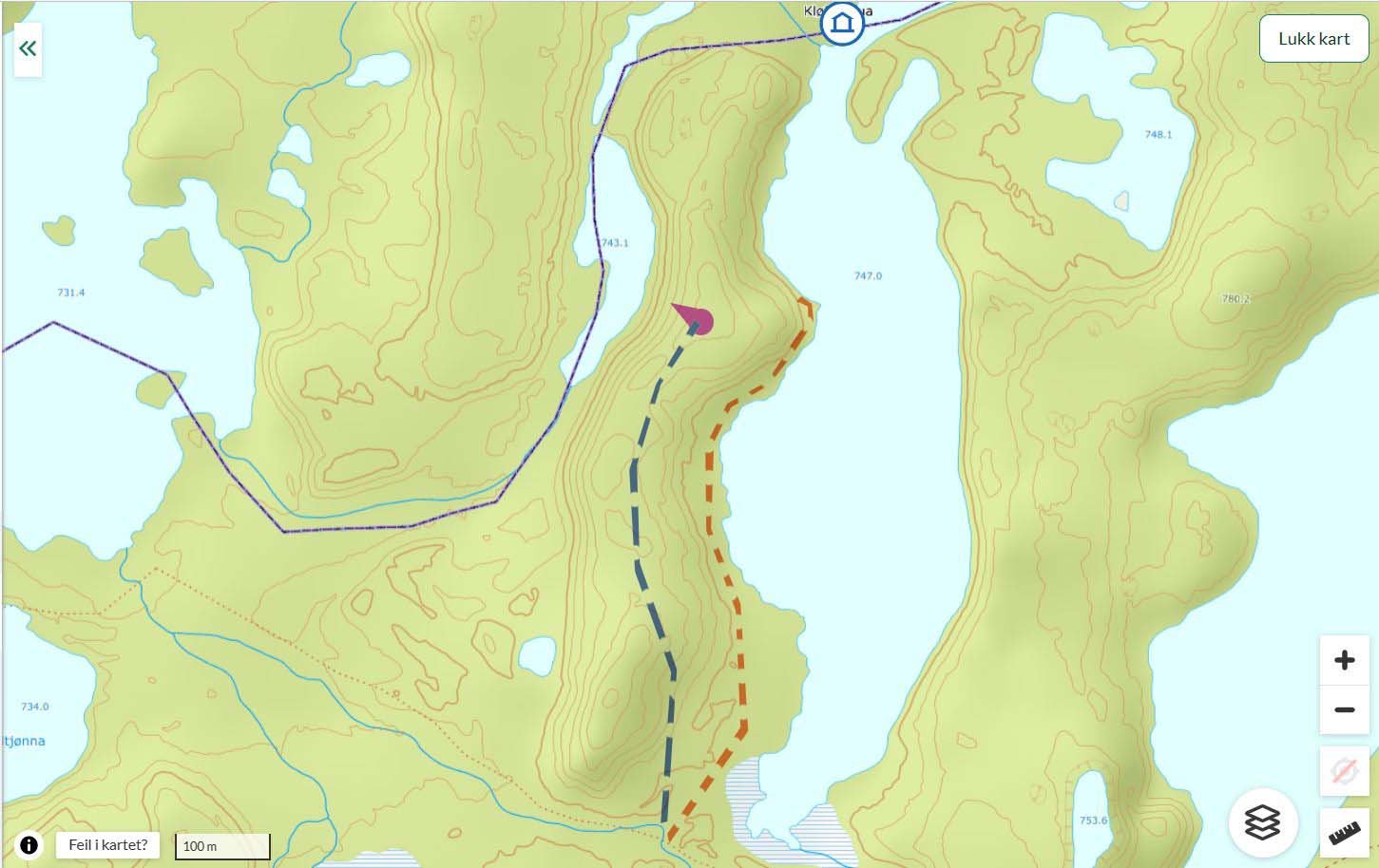 Har ikke vært ved bua, men vet at det på vestsiden av Kløfthåa, går en sti fra sørenden(fra stiplet stimerke, her vist som stiplet rør linje) av vannet og opp til odden før bua...nede langs vannkanten. Antar at det går sti videre til bua. Går an å passere på toppen på vestsiden og, men går ikke fort, da det hele er en haug av storstein( blå stiplet linje, der sti kan skimtes stedvis). Lilla retningsmarkør, viser terreng, der Kløfthåbua vil ligge utenfor høyre billedkant.1 poeng