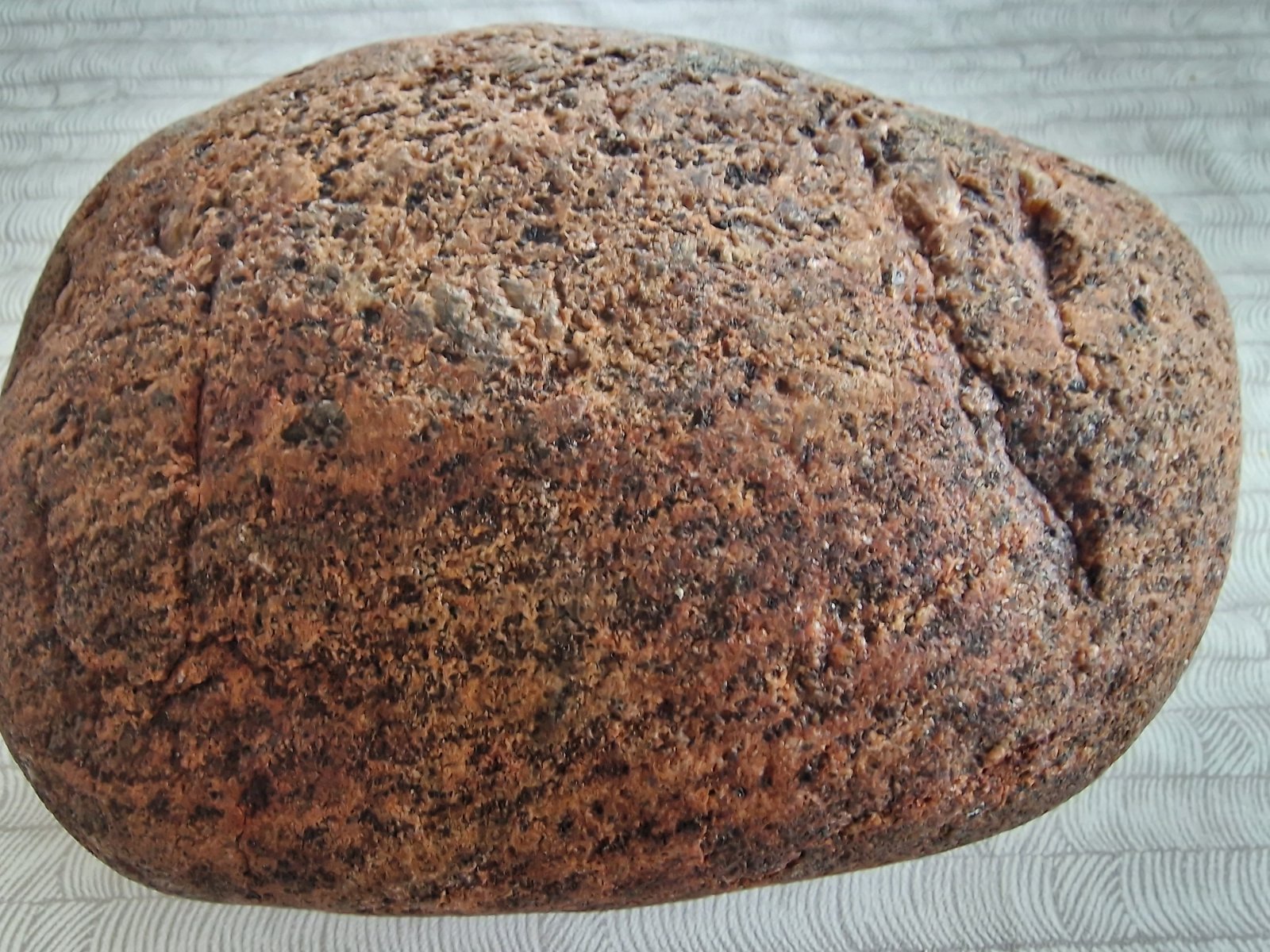Stein har jeg overhode ikke greie på, men jeg ville gjettet på granitt (rød granitt). Ser ut som en rullestein (altså stein fra elv eller havstrand). Bare rene gjetninger fra min side da.1 poeng