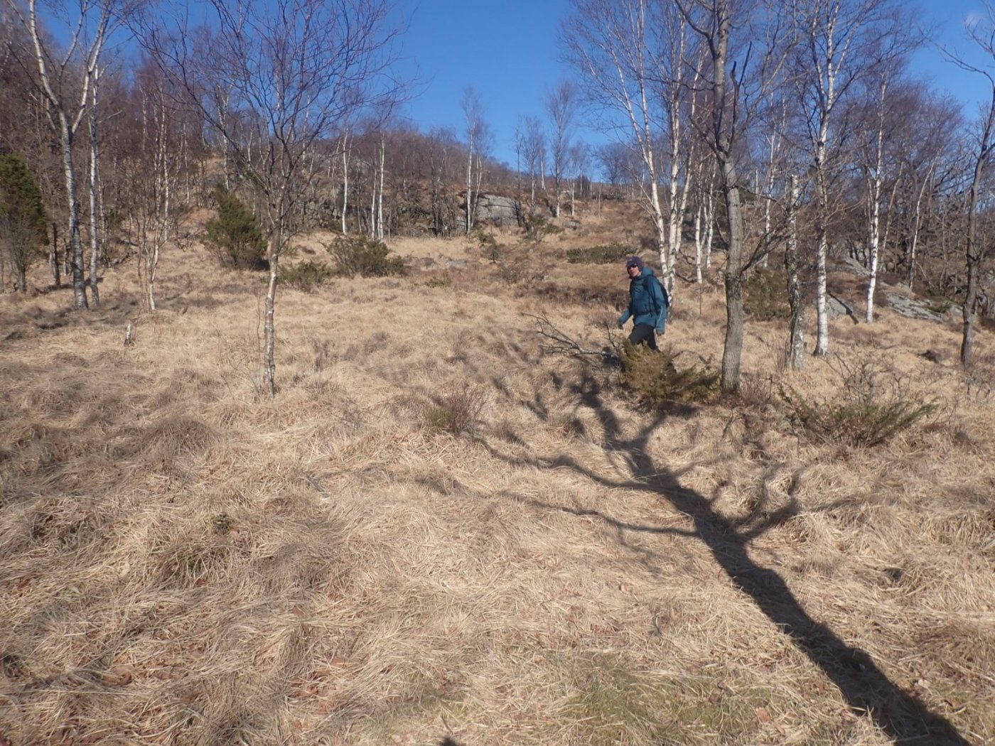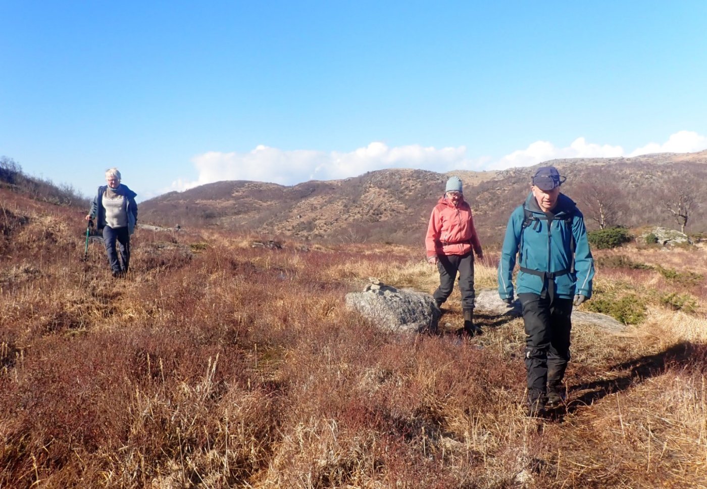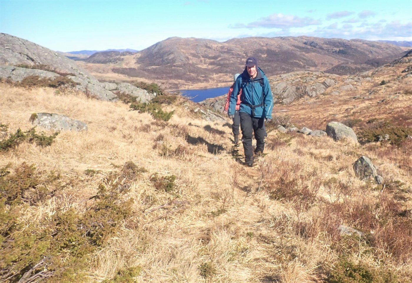 En langtur fra Sælandsskogen Bestyrerinnen ville på søndagstur, men jeg hadde tenkt meg på en litt lengre tur. Jeg så for meg å gå innom fire støler og gårder fra Sælandsskogen. Turen til Bjødnali, Ristøl, Lauvlia og «Skogen», er omtrent 13-14 kilometer og det er en del bakker opp - og ned. Da jeg nevnte dette for Bestyrerinnen, var hun straks med på planene, og vi ble enige om å ta kontakt med Sigbjørn og Anne Lise. Det hadde ikke blitt noe av den samme turen, som de skulle ha gått tidligere i uka. De ville gjerne vare med på denne søndagsturen. Vi ble enige om å ta ut tidlig, og det morgenen etter at vi hadde stilt til sommertid. Sekken ble pakket ganske kjapt på søndagsmorgen. Hjemme var det så vidt varmegrader. Vi skulle ikke langt inn i Sælandsskogen før det ble kaldt og litt frost i bakken. Nå var værmeldingen god, med sol og lite skyer, men det skulle bli litt vind. Det ville uansett være bra turvær. Sigbjørn mente vi burde ta direkte opp mot Håfjell denne gangen, og ikke gå om Stølsletta og Ragnhildsstølen. Stien rett mot toppen starter bak orienteringsskiltet. Denne stien er brattere og antakelig ikke mye kortere enn den andre. Det er en lang bakke mot toppen. Litt spesielt er det at denne stien går forbi – rett under – den egentlige toppen på Blåfjell. Øverste toppen heter Håfjell, selv om det på skiltet står Blåfjell. Selv om det var litt is i stien, kom vi oss greit opp mot toppen. Det ble noen stopp for å beundre utsikten. Det er mulig å se store deler av Jæren fra toppen av Håfjell. (men bakken opp den veien var bratt og tung.) Denne gangen tok vi ikke oppom garden på Bjødnali. Vi gikk rett opp bakkene mot Ristølnuten. Bestyrerinnen samler fortsatt poeng, og satte pris på å få med seg selve toppen – og poengene, selv om det betydde en ekstra tur på 600 meter. Det blåste på toppen, og det var skikkelig kaldt i vinden, vi var glade for å kunne ta en pause i le av huset nede ved Ristøl. Denne gangen la vi turen rett over myrene mot Lauvlia, Vi fant til og med en god plass å komme oss over piggtråden mellom Lauvlia og Ristøl. Det tok egentlig ikke lange stunden å gå fra Ristøl til Lauvlia. Oppe på heie, ble det stopp. Midt i stien lå det en stålorm. Nå hender det at huggormer kan være uten «tegning» på ryggen, men denne var mindre og hadde mørk metallisk farge. Det var ellers en grei plass å stoppe opp. Terrenget og naturen her opp i heia, er flott, og denne dagen, med sol og blå himmel, var det kjekt å se heia igjen etter en lang vinter. Denne gangen ble det tid til en liten pause ved «Skogen», før vi forsatte rundt Engjavatnet og opp mot Jærbuskaret. Det er litt kjedelig å gå veien ned mot Sjelset og videre langs ånå mot Sælandsskogen. Fra Sjelset er det to kilometer til parkeringsplassen. På god vei og sti går det kjapt. Vi brukte omtrent fem timer på turen, i et ganske bra tempo, men med noen flotte og kjekke pauser. Denne turen er virkelig en perle, og jeg vil nok ta med meg denne flere ganger i år.1 poeng