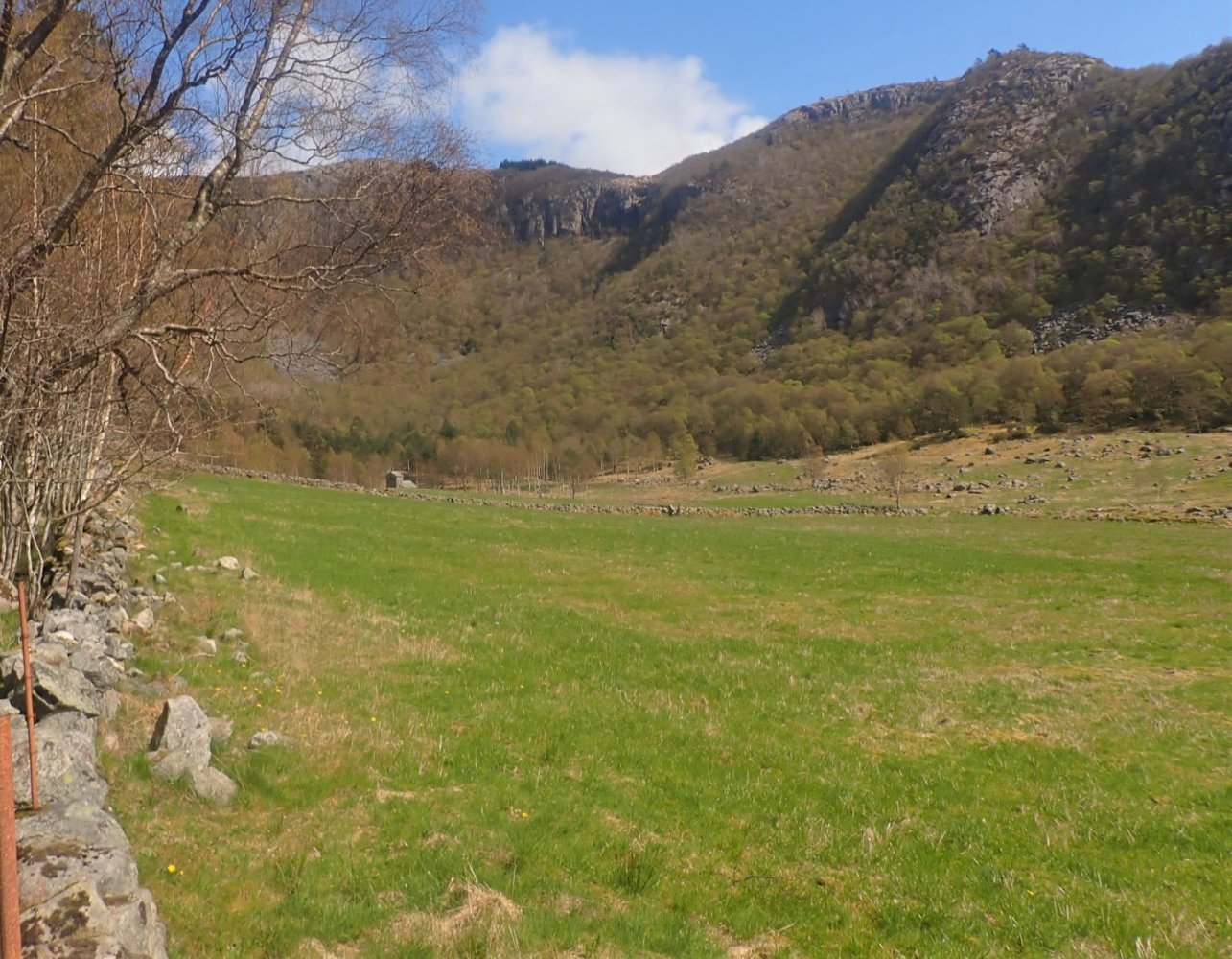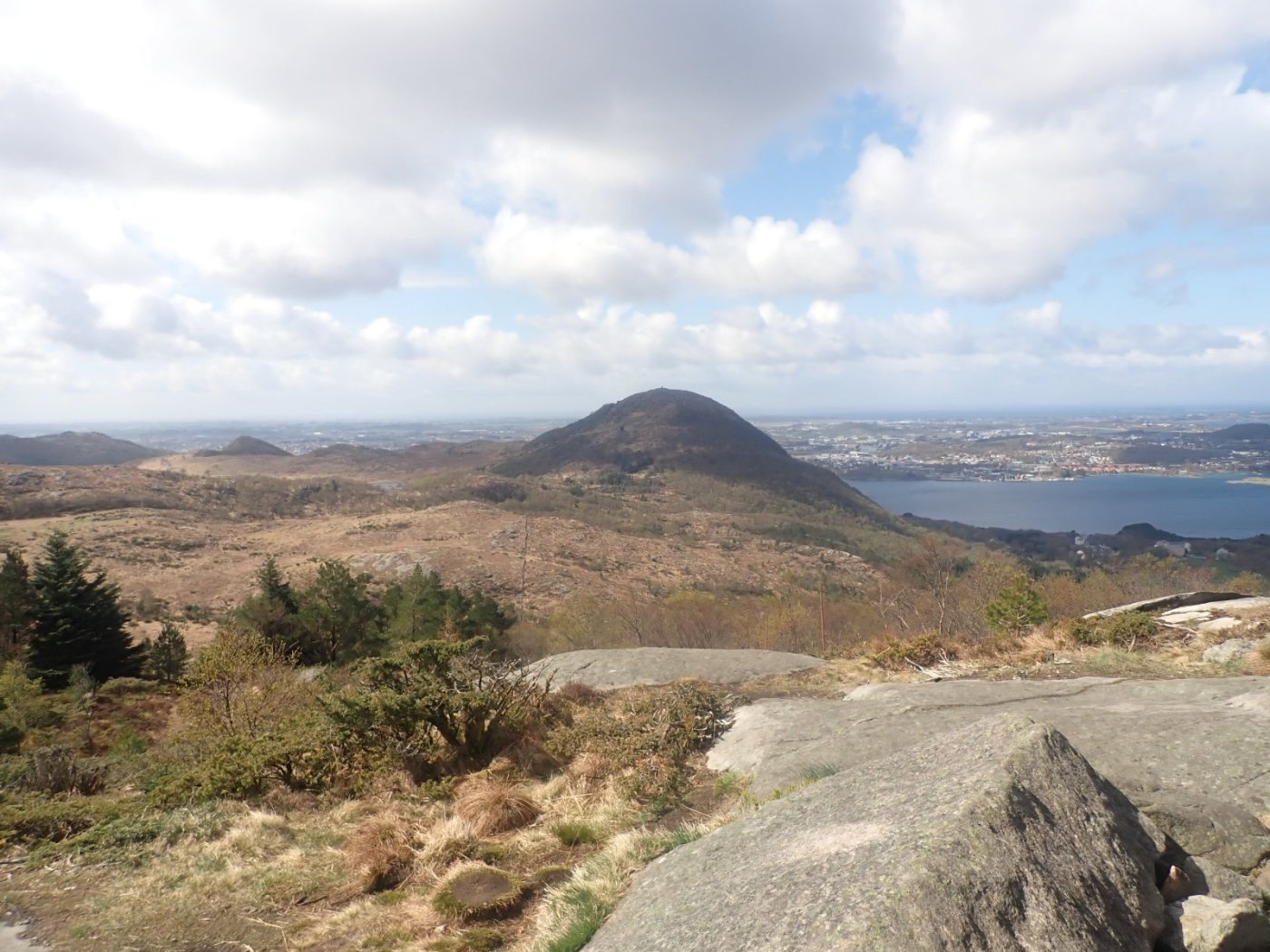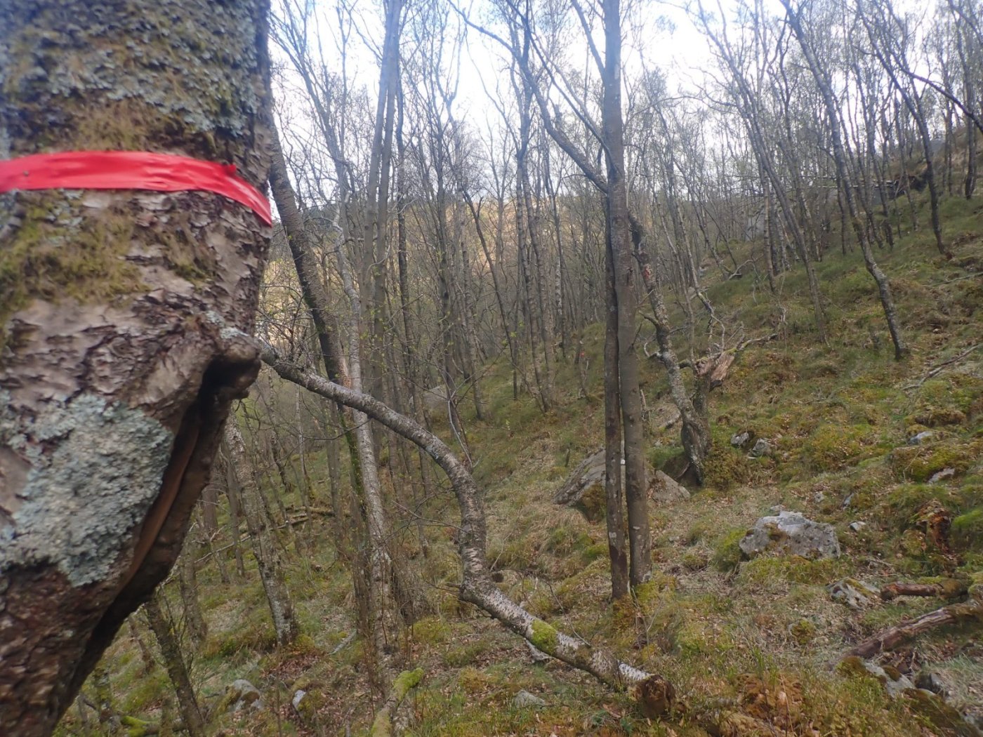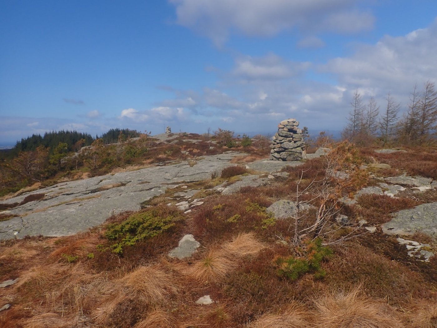 Denne gang med merketape i lomma. Det var ikke så lenge siden jeg hadde gått den lange runden fra Gramstad, om Mattisrudlå, Bjørndalsfjellet og Fjogstadnuten, videre til Resasteinen og Skjørestadfjellet til Dalevatn og til slutt Dalsnuten og tilbake til Gramstad. En ganske drøy runde på 14 kilometer. Jeg mente jeg endelig hadde funnet den enkleste veien fra Skjørestadfjellet og ned til Dalevatn – uten å klatre over Kjerdalsfjellet (Jødestadsfjellet som STF kaller det.). Denne bakken er for meg litt bratt og spesielt på vinterføre velger jeg å gå om Jupemyr og skaret mot Jødestad. Det var muligens på tide å merke de 5-600 meterne mellom veien og til den T-merkede stien. Nå tar denne «omveien» muligens et par, kanskje tre minutter mer en den merkede stien, men det er i hvert fall mye enklere å komme til Dalevatn den veien. Yr hadde ikke værmeldingen helt på stell. De mente det skulle bli en tør og ganske solrik dag. Værgudene var ikke enige, og serverte noe regn og litt vind på morgenen. Nå gjorde ikke det så mye, bakken var tørr og det kom ikke mer regn enn at stien ble bare så vidt våt. Som vanlig tok jeg mot Bjørndalsfjellet, og innover Bjørndalsmyra og opp til Mattisrudlå. Det var folk i bakken oppover, men så snart jeg stakk ansiktet innover myra ble jeg ganske alene. Selv oppe mot Mattisrudlå traff jeg ikke folk. Her pleier det som regel å være noen på vei opp bakken fra Paradisskaret, eller på vei ned, denne gang var det ingen andre. På toppen av Bjørndalsfjellet traff jeg på noen av de samme jeg hadde gått forbi på vei oppover. Nede på Fjogstadveien igjen tok jeg direkte mot Fjogstadnuten og fortsatte videre nedover mot Løemyr og Sørdalsbakken, og videre opp til Resasteinen. Det så ikke ut som om det var folk ved steinen da jeg klatret oppover, men da jeg kom opp, satt det et par i le av steinen. Oppover bakken mot Skjørestadfjellet og flyvraket, mente jeg å kunne kjenne at beina ikke var helt gode, og lurte på om ikke bakken opp fra Dale mot Revholstjørn ville bli for drøyt. Dalsnuten kunne jeg jo hoppe over denne gangen. Bortover småtoppene på østsiden, med gode og store varder som viser vei mot skogsveien på andre siden av Djupemyr, gikk alt så meget bedre. Nedover mot Dalevatn glemte jeg hele greia. Etter jeg kom meg over grøfta i bunn av veien og over gjerdet og ned til skogen, begynte jeg å merke «stien» - et litt utydelig dyretråkk nedover den ganske bratte bakken. Jeg merket bare med noe rød elektrikertape, og med gode mellomrom. Lett å fjerne. Et stykke nede i bakken dukker det opp en gammel vei, og denne går over i sti, som ender ut ved den T-merkede stien. Nede ved Dalevatn, ble det denne gang en stopp for både saft og noe kjeks. Skulle jeg oppom Dalsnuten var det nok helt greit med påfyll. Jeg kom opp på Dalsnuten. Bakken ned til Kjerdal er grei og det er lett å gå veien bort til Dale. Opp bakken mot Dalsnuten, er ikke like enkelt. For min del går det «sakte i bakken» - oppover i et jevnt tempo, helst uten for mange lange og høye steg, men jeg kommer jo opp. Som vanlig fusket jeg, og gikk over sletta og til stien i sør oppover mot toppen. Det er enklere å komme opp denne veien, og krever ikke noe «klatring». Det ble bare en kjapp runde rundt varden før jeg tok ned mot Revholstjørn. Det var helt greit med vei det siste stykket. Etter fire og en halv time på tur, og med noen ganske drøye oppoverbakker, var det kjekt å se bilen. Telefonen mener turen er på 14 kilometer, og det er for meg en skikkelig langtur, men kjekt var det.1 poeng