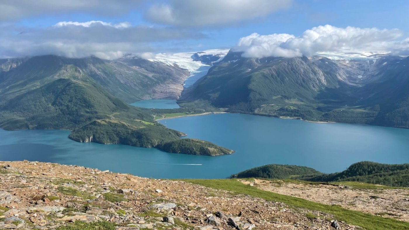 Sitt i skrivende stund på Holandsfjellet 582 i Meløy kommune - Halsa er startstedet. Sto et fjelltrimskilt i veikanten og turmålet var noe uklart - men usedvanlig flott utsikt opp her. Holand og Holandsvika er ellers startstedet for båten som frakter turister over Holandsfjorden til Engabreen og Svartisen. Så et skimt av Snøfjellet i sted - der jeg og Graham var for et pr mnd siden. har kun en Snickers og en flaske vann med - så er vel best å komme seg ed igjen - varmt og fint men tåka kommer fort her ved kysten nå.6 poeng