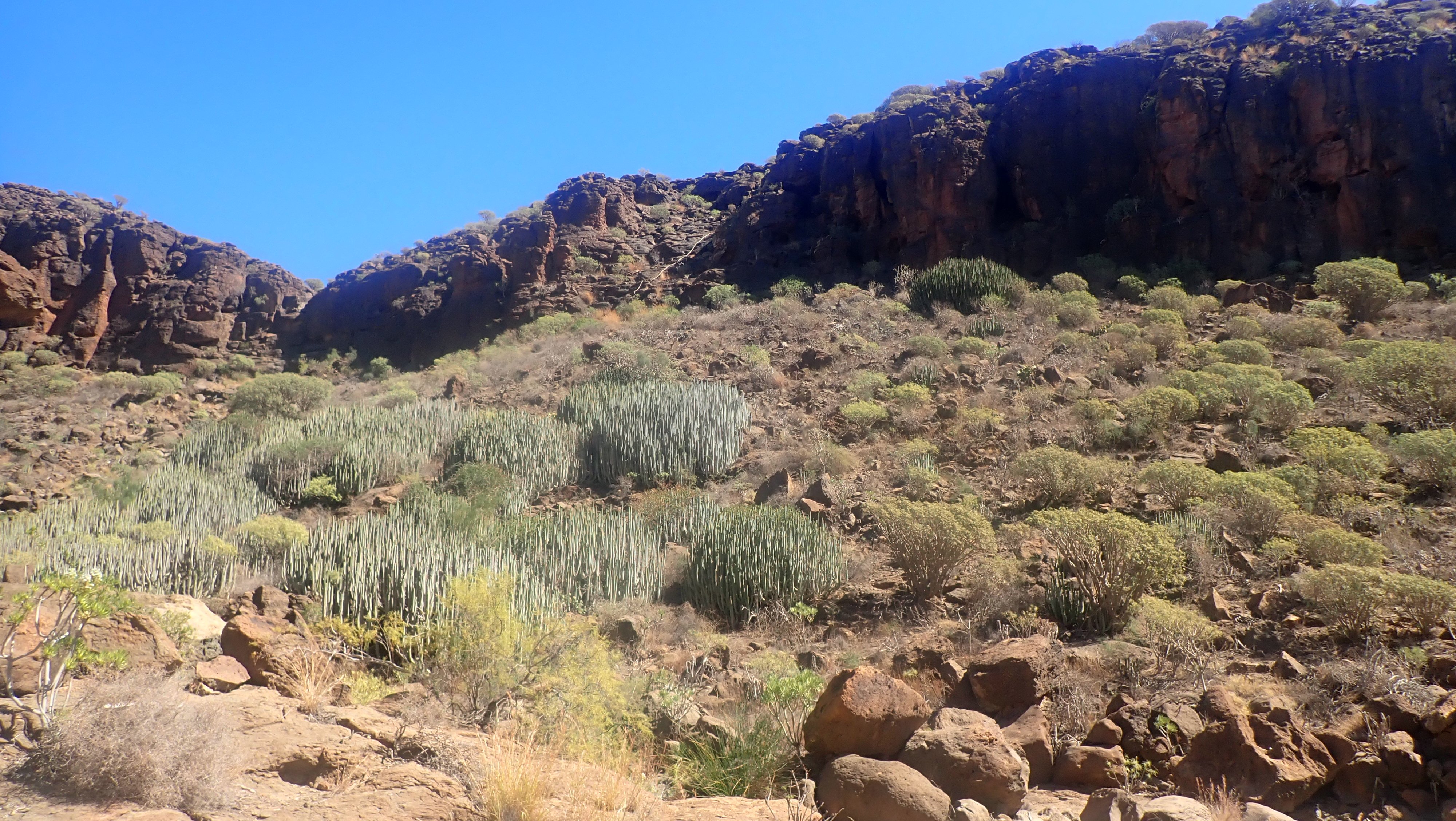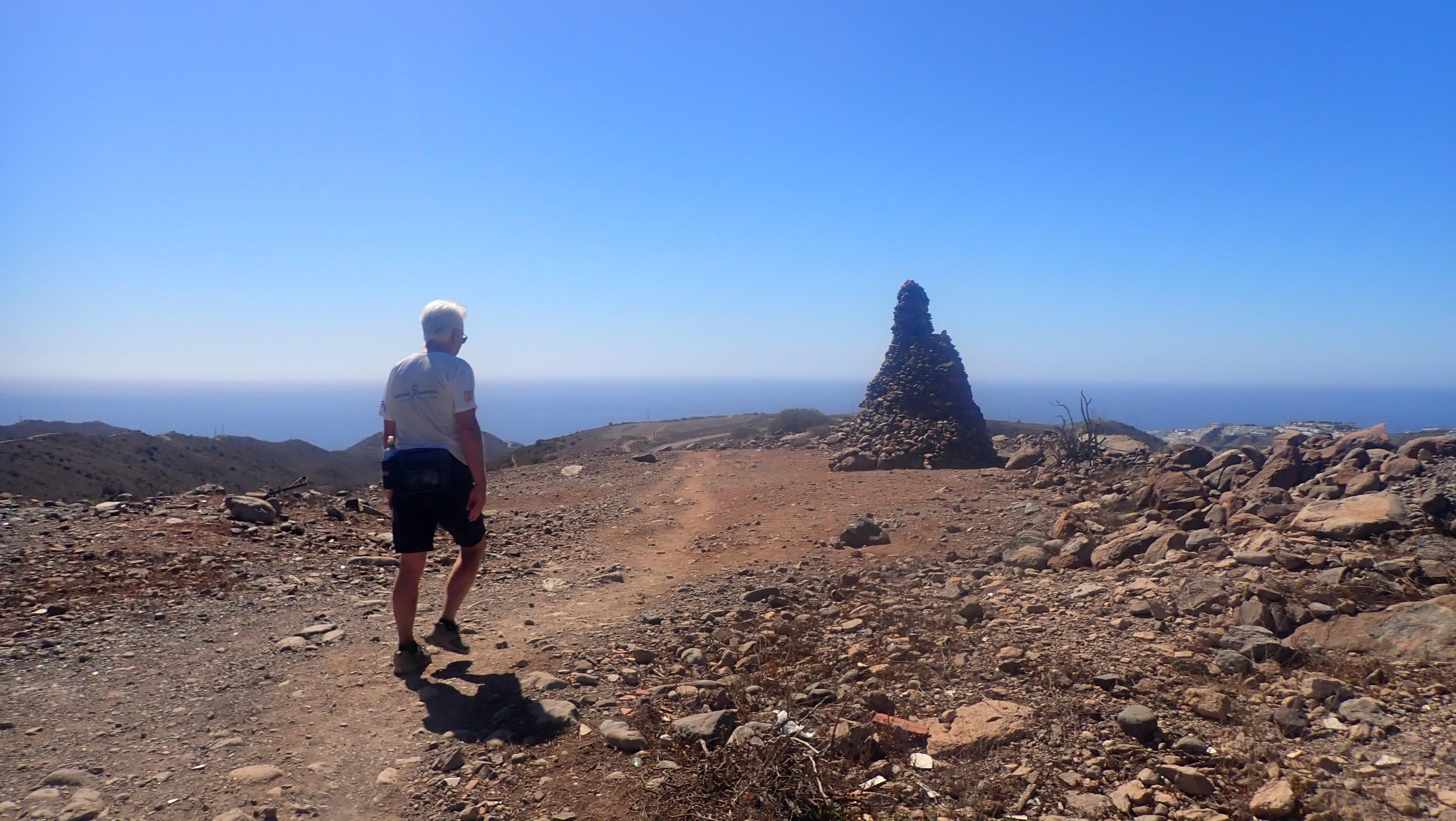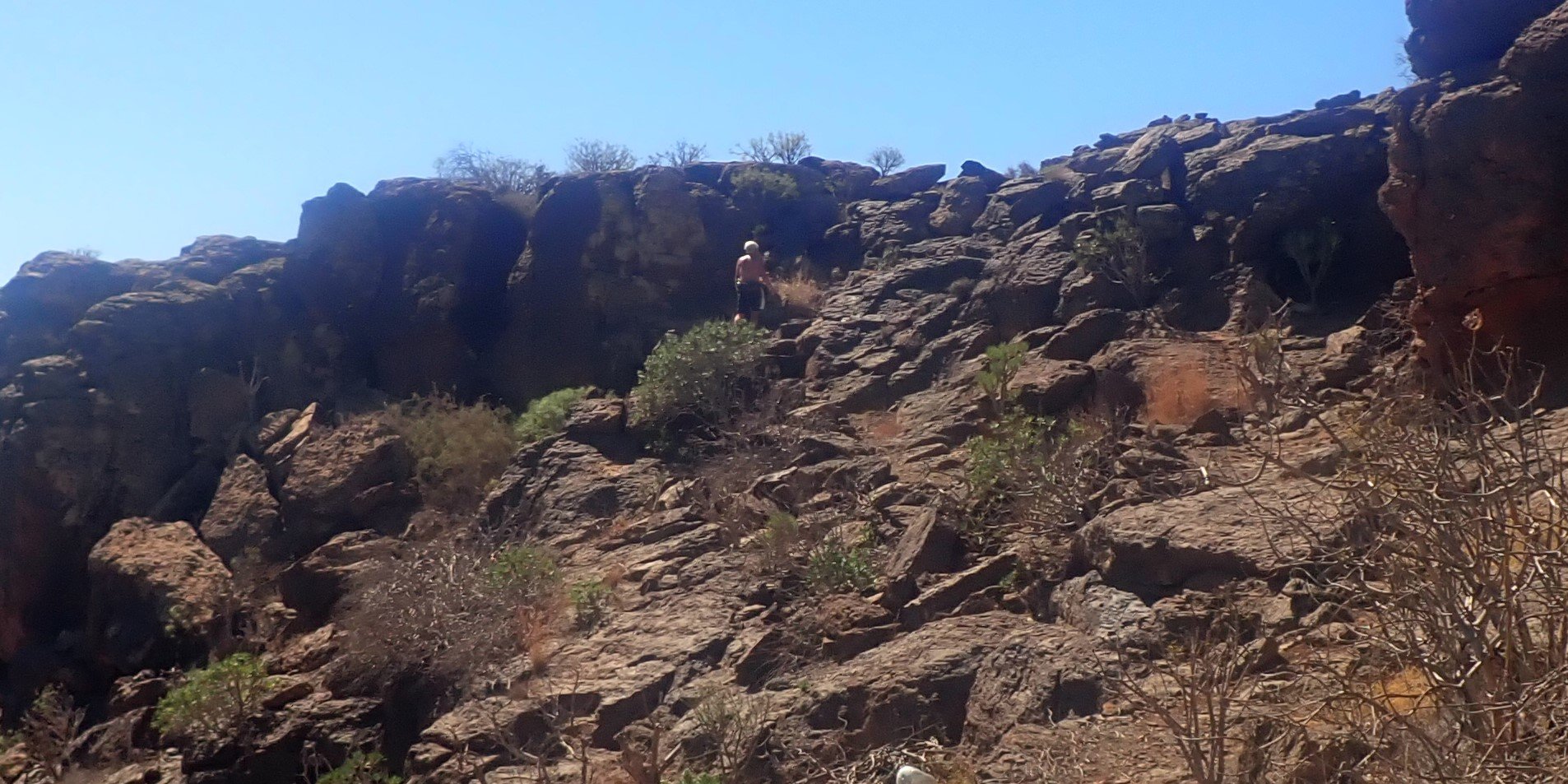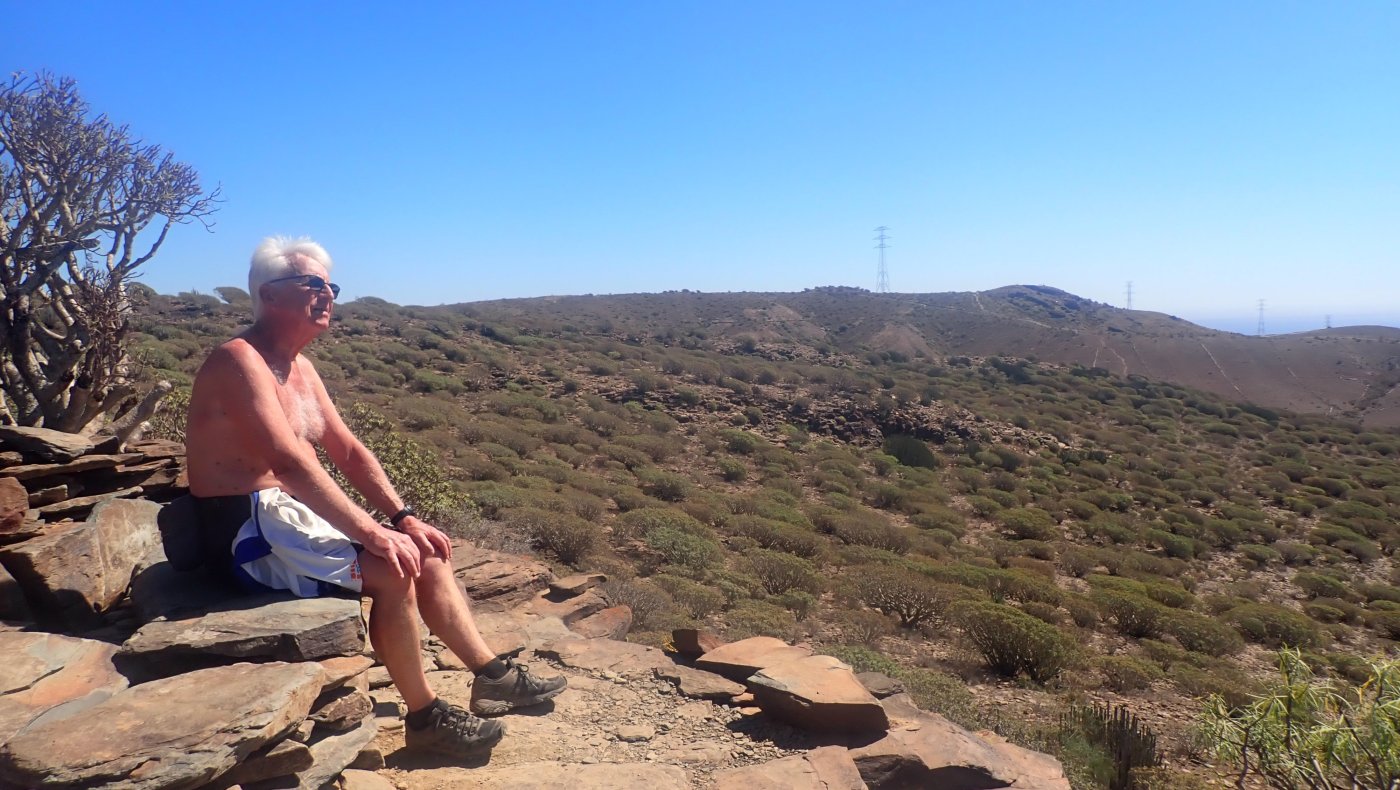 En flott tur med flott følge. For noen år siden fant vi en ny plass å besøke. Hjermandsplass ligger et drøyt stykke opp og inn av Norskeplassen, men det var turen til denne plassen og videre ned til Eivinds plass jeg tenkte på denne dagen. Turleder Edvin var ikke sen om å hive seg på. Det ville bare bli oss to. Sigbjørn kom ned en uke før oss og var nå på vei hjemover – til kulde og is – i hvert fall kuldegrader på natta. Nå var det i utgangspunktet bare et forslag, og vi var begge enige om at vi fikk se på dagsformen litt lengre innover. Først måtte vi i alle tilfeller innom Norskeplassen. Det ble en tur innover i god fart, men uten at vi presset oss. Vi så lite folk og på Norskeplassen var vi alene da vi gikk over for å fortsette videre mot Dusjen og starten på stien mot Hjermandsplass. Nå tar vi vanligvis inn mot «Våres plass» og videre oppover mot Karpedammen, men i stede for å ta ned der, går vi veien mot Dusjen, Denne gangen møtte vi et par, som var litt usikre på hvor stien ned mot Arguineguin tar nedover. Den starter omtrent på samme sted som stien mot Hjermandsplass, bare på andre siden av veien som går mot Cortadores. Vi tok følge oppover veien, og av en eller underlig grunn fant vi ikke stedet der stien mot Dusjen tar av fra veien. Her har Edvin og jeg rotet tidligere, så det er en mulig forklaring – at vi roter... Oppe under Dusjen sa vi takk for følget og tok nedover den ganske bratte bakken, mens paret tok nedover på andre siden. Det var hyggelig med følge, veien oppover kan lett bli litt kjedelig. Stien videre til Hjermandsplass og Eivinds plass, er den kjekke delen av turen. Her går det først nedover og så både opp og ned, over tørre bekker og opp bratte sider der stien henger litt i dalsiden. Rett før Hjermandsplass går stien forbi en «bygning» og her ligger fortsatt «løven» og passer på. Heldigvis var det denne gang vann i kassen på Hjermandsplass. Denne dagen hadde jeg tatt med for lite å drikke, og var glad for å kunne kjøpe en flaske varmt vann. Videre nedover er det lett å gå. Det er temmelig flatt og mye god sti – et stykke. Nedgangen til bunn av dalen, er ikke lett å gå. Her er det bratt og mye løs stein. Tidligere var stien langs dalen mot Eivinds plass nesten skjult. Noen har ryddet og rensket, og gjort det greit å komme fram. Det er igjen en bratt bakke opp til stien som fører direkte nedover til Eivinds plass. Vi kom opp den bakken bare litt andpustne. Nede i dalen hvor vinden ikke fikk tak og sola var midt i mot, var det skikkelig varmt enkelte plasser. Oppe på toppen av åsryggen og med litt vind ble det helt grei, men nå hadde vi vært på beina en stund, så det passet godt med en pause på Eivinds plass. Bakken opp til Sukkertoppen fra Eivinds plass er lang og krever litt krefter. Vi så etterhvert slutten på turen og for bare over Norskeplassen og nedover mot brattebakken til Natural Park. Selv om turen denne gangen hadde noen innslag av «transportetapper», så hadde vi en virkelig flott langtur. Det ble omtrent fire timer og slik vi gikk denne, var den på omtrent 16-17 kilometer. Denne dagen var det akkurat nok. En flott tur og det var kjekt å kunne sjekke ut en skikkelig langtur.1 poeng