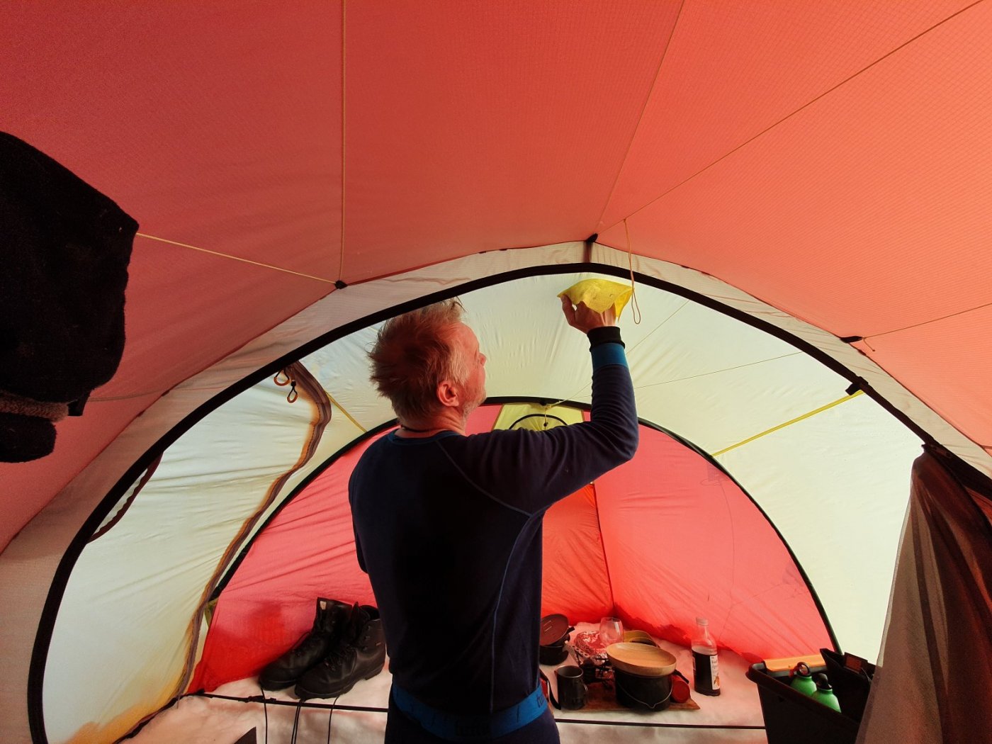 Vår siste praksis. De to siste turene har vi kjørt praksis med lukket innertelt om natta. Åpen ventil på vindside av teltet. Øverst. På yttertelt. Dette har gitt enten rim eller dråper i yttertelttaket, men veldig lunt og varmt i innertelt og ingen kondensfukt i innertelt. Dette i ytterteltet tørker vi bare vekk som første aktivitet til kaffekok om morgenen. Dette ga en solfri morgen ca 10 grader i innertelt ved -5 ute og rundt 0 i fortelt. -2 i kuldegrop. Ved fyring er det åpne ventiler i begge ender. Det hender vi fyrer et boost rett før leggetid så ikke alle synes det er kjølig å komme seg i posen. Ved fyring med kalde kjeler på er det ventilering i begge ender og åpen dør. Ved mye vind litt mindre åpen dør. På tidligere turer der det har vært ned i -20 inne i teltet i løpet av natta så er det typisk rim i taket i innertelt også... Morgentrimmen: Ellers har vi gjerne en regel som er grei for de fleste som er med: Vi rigger for at den som lettest fryser eller har tynneste pose skal få en trivelig natt. Det er så uendelig mye verre å fryse om natta en å bli bittelitt varm. Jeg er pose for idiotikulde så det ender gjerne med at jeg sover med posen halvveis på. Ikke noe problem for meg så lenge ingen andre fryser...1 poeng