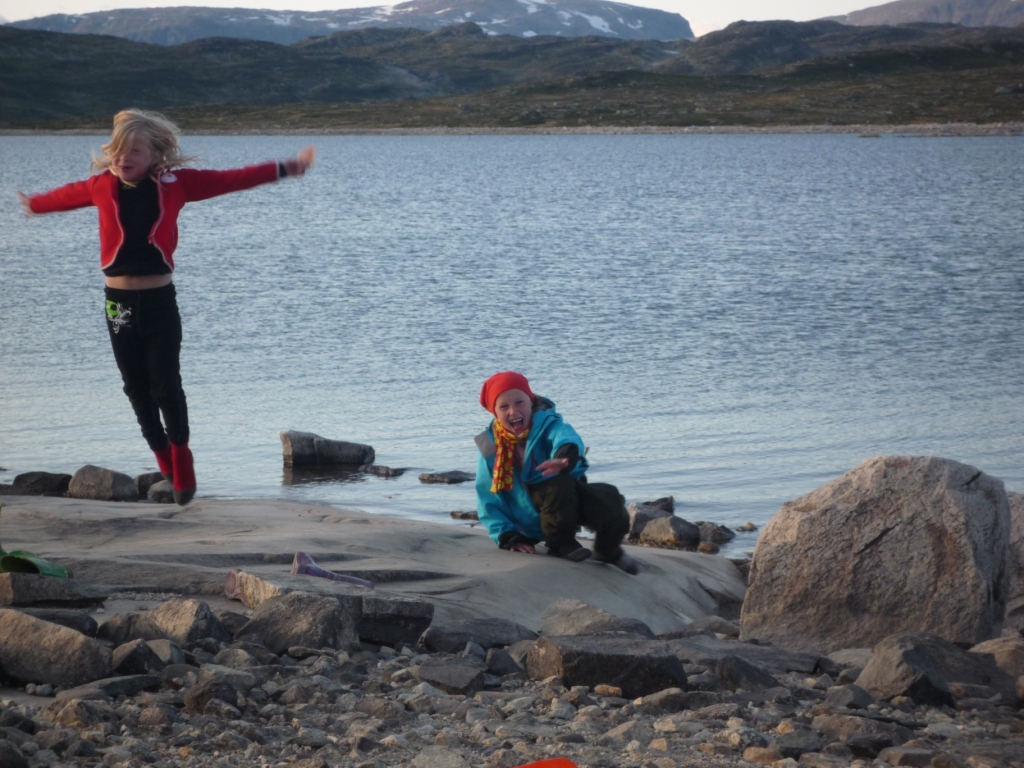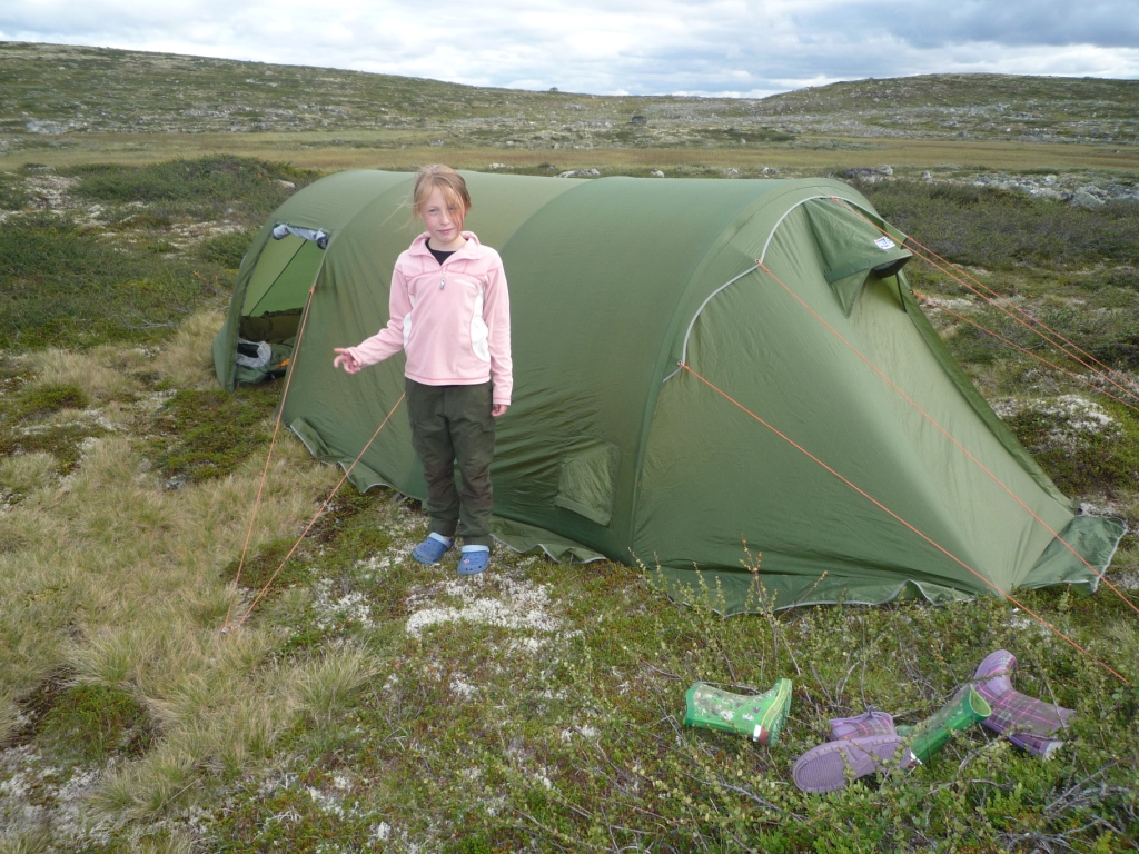 Her er en rapport fra turen vi nettopp har kommet hjem fra. Det ble en fantastisk opplevelse for både voksne og barn som vi gjerne deler! Frem til nå har barna vært med på kortere turer og vi var veldig spente på hvordan de ville oppleve en uke i telt. (edit: ser at bildene kom i feil rekkefølge allikevel - på forhåndsvisningen så det mye bedre ut.... vel,vel) Etappe 1 (merket med svart i kartet): Vi startet dag en med Pizza på Geilo og sen ankomst til Lappesteinen, startpunktet for T merket løype mellom RV7 og Heinseter. Klokken var nærmere 18.00 da vi startet og første leir ble satt etter ca 1,5 km, i en liten bekkedal vest for Langetjørni. Været var betydelig bedre enn det Yr lovte, men det blåste nok til at det var godt å finne en teltplass i le. Mor fikk rullet ut nytt exped-underlag og det er nok ikke tvil om at det blir snarlig innkjøp av flere slike - dette var noe annet enn de "selvopplåsbare" liggeunderlagene som var på markedet sist jeg var ute!! Barna har alltid sovet godt i telt, selv på gammeldags celleskum og det ble snart stille.... Neste dag startet med at undertegnede gikk tilbake til bilen for å legge ut "depot" på Halne fjellstova. Planen var å komme dit dag 4 og dermed kunne noen matrasjoner og litt tørt tøy ligge der og vente på oss. Sekkene ble tunge nok allikevel og de kiloene vi sparte var gull verdt - mors startvekt var 14 kg, far 27 og barna 2 kg (kun sekk + sovepose). Betjeningen på Halne må få skryt for å være imøtekommende i forhold til å ta vare på depotsekken vår:-) Etappe to (rød): Dette ble turens lengste etappe med ca 10 km. Underveis plukket vi hele tre molter som var modne og gleden over å oppdage molter var tydeligvis så stor at kartmappen ble lagt igjen midt i lyngen. Den potensielle fadesen ble heldigvis avverget av to tyskere som var minst like glade i molter som oss - og dermed snubla over kartet umiddelbart! En lengre marsj tilbake for å hente kartet hadde vært et hardt slag for stoltheten til far... Da vi omsider så vindmølla utenfor heinseter slo vi leir, rett under Heinbunten og Tremannshøgdi. Lengselen etter å komme inn i teltet var stor, og ingen gode teltplasser var å se. Dette medførte mange merkelige sovestillinger i løpet av natta, etter at teltet ble reist i grov lyng (noen vil ha det til at lyngen var mer som små trær.....) Jentene hadde vært utrolig flinke denne dagen og vi kom mye lengre enn planlagt - målet for dag tre var Heinseter og vi var allerede kun 1,5 km unna. Etappe tre (grønn): ble derfor forlenget forbi Heinseter og opp på høyden sør for Sleipa (fra sleipa går det båt til Halne). Mor endte opp som tolk for sjokkerte spanske turister som ikke helt kunne tro på prisnivået i den norske fjellheimen. Det som brakte min kone inn i situasjonen var følgende samtale (eller forsøk på samtale) mellom mamma-spanjol (MS) og betjeningen (: MS: "Do you speak English?" B: "Nei" MS: "Do you speak spanish?" B: "Nei!" - "Men, snakkær du norsk da?!" Da vi forlot Heinseter satt de fortsatt og regnet på hva en natt ville koste med to voksne og tre ungdommer........ Stigningen opp fra Heinseter er drøy nok til at det lønner seg med flere pauser for barna. Vel oppe var det imidlertid nydelig utsikt over Hallingskarvet, Hardangerjøkulen, Halnefjorden mm. Med forrige natt friskt i minne gikk jeg og eldstedattera vitenskapelig til verks for å finne en god teltplass. Flere potensielle lokaliseringer ble prøveligget i full teltbredde før vi så mye som tok teltet ut av sekken. Grundigheten betalte seg og alle var skjønt enige om at "sengene" var perfekte! Det skal innrømmes at far kikket litt misunnelig over på den oransje 7 cm tykke madrassen under mor:-) Av alle ting ville vår eldste datter ligge ute - hun hadde mast de andre kveldene også, men det var hele tiden litt småregn som gjorde at vi utsatte det. denne kvelden var det imidlertid fjærskyer og alt så lovende ut. Vi rigget oss til med søppelsekker tredd over posene og lue på hodet. Denne natta skulle det imidlertid bli ordentlig regn - og 05.30 måtte prosjektet avbrytes før posene ble gjennomvåte! Typisk! Etappe fire (blå): Startet med å komme seg ned fra fjellet og til båten. Halnekongen var en staselig farkost med mye motor... noe som skulle vise seg å være nødvendig for å få lagt til brygga i noe mer enn frisk bris.... Vel fremme på Halne øste regnet plutselig ned akkurat idet vi satte benene innenfor, snakk om flaks! Det var betydelig bedre å vente inne med cola og VG enn å være ute og gå. Tiden ble benyttet til å supplere mat fra depotsekken. Hittil hadde vi hatt nærmest "luksusmat" med pizza dag en - pølser, potetstappe og sprøstekt løk dag to - samt bacon, makaroni og carbonarasaus dag tre. De to neste middagene ble pannekaker og tomatsuppe og risengrynsgrøt med spekeskinke og salami. I det hele var vi veldig fornøyde med maten på turen. Frokost spente fra brød de første dagene til honnikorn med tørrmelk (veide ingenting, men litt stort volum...!), samt den obligatoriske havregrynsgrøten med tørrmelk. Lunsj var stort sett det samme, med tillegg av pastarett og nudler. Da regnet ga seg tuslet vi opp mot Krækkja. På toppen fant vi en meget fin teltplass med umiddelbar nærhet til rutsjebane (snøskavl som sommeren ikke hadde klart å knekke) - eneste ulempen med rutsjebanen var at begge klarte å bli våte med påfølgende trusetørk over primus. Gikk vel med noen desiliter bensin der:-) Etappe fem (gul): På vei ned mot Krækkja traff vi et ektepar på henholdsvis 79 og 80 år.... de fløy rundt i fjellet som ungdommer, imponerende! Etter en kort stopp på Krækkja satte vi kursen mot Fagerheim. Målet var å komme ganske langt denne dagen, for værmeldingen på Krækkja lovte mye regn neste dag. Vi ville heller gå litt mer i fint vær nå, enn i regn neste dag. Da vi kom ned Svonuten var det imidlertid ikke tvil om at her skulle vi slå leir. Utsikten var flott, med en sma