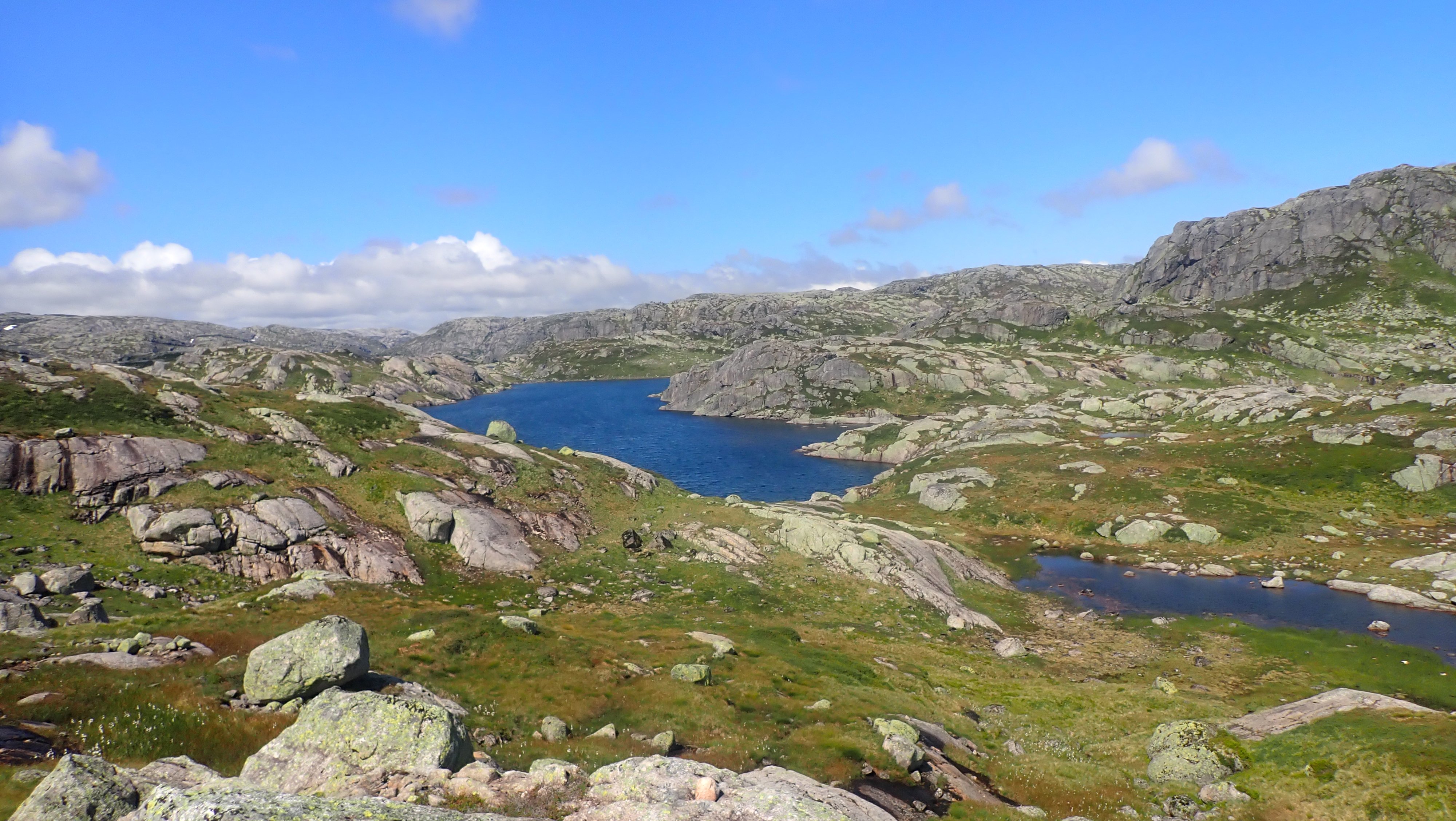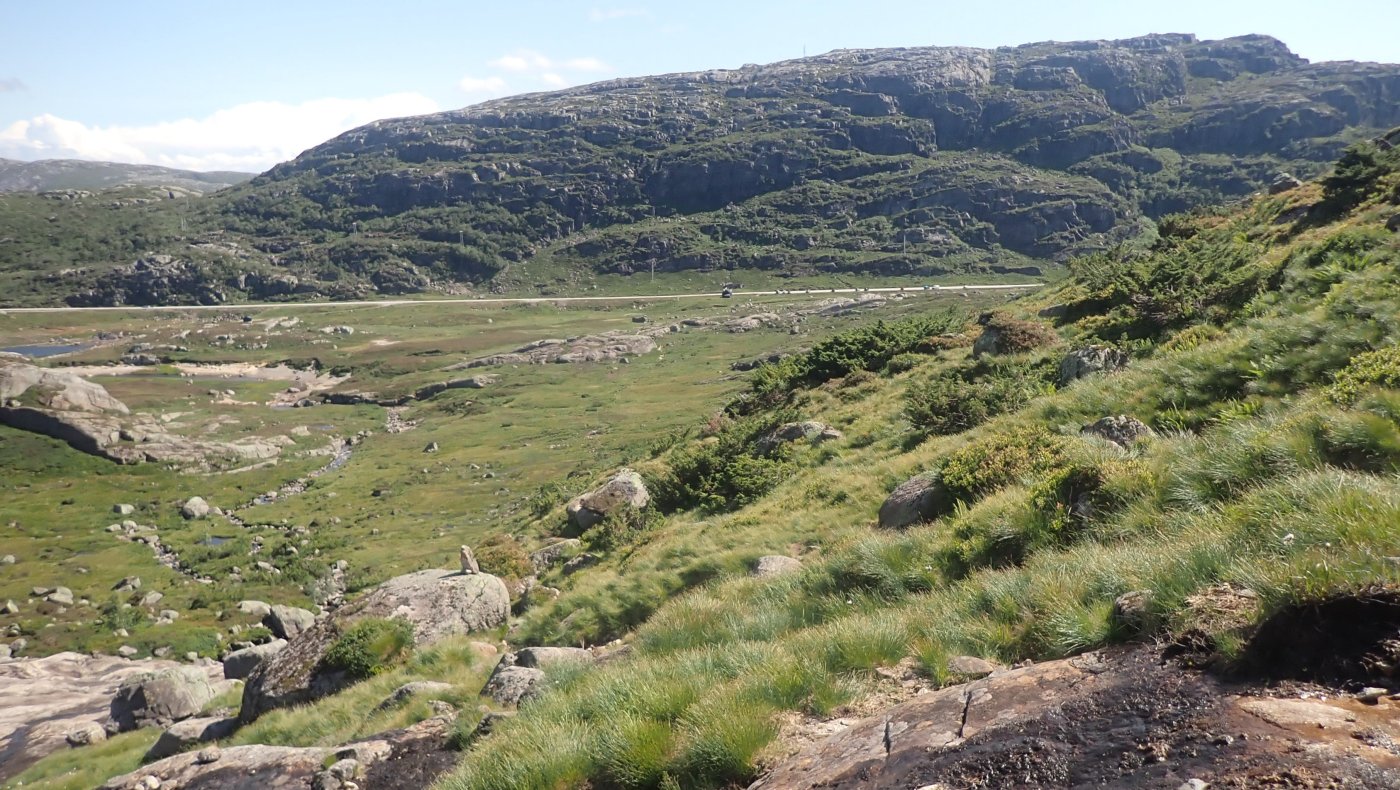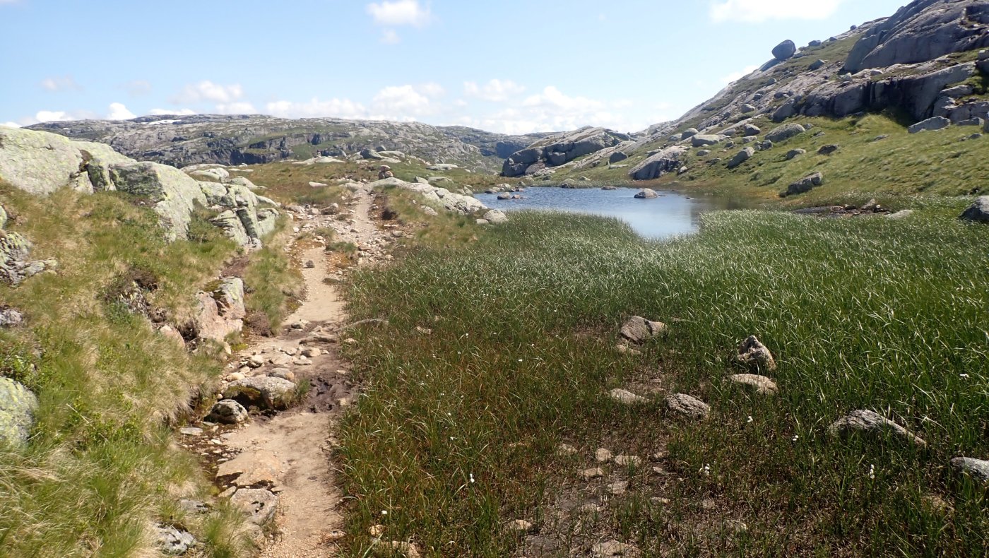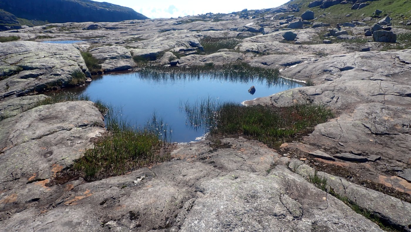 En kjekk tur i høyfjellsterreng. Det var på tide å ta en tur til Sandvatn frem og tilbake på dagen. Jeg har vært på Sandvatn tidligere i år. Da ble det en tur inn og så overnatting før jeg fortsatte mot Langavatn. Med en ganske tung sekk, i forhold til hva jeg vanligvis drar på, så ble det en litt trå tur opp bakkene og inn. Jeg trodde egentlig at jeg er i så pass god form at det ville få greit med en tur fram og tilbake til Lortabu-Sandvatn. Nå er det langt fra så vanlig å ta en slik tur lengre. Tidligere var dette en helt grei og vanlig tur, men årene gjør at det blir tyngre og tyngre. Værmeldingen var med på å avgjøre dagens turmål. Det ble meldt om sol og helst sommer oppe i høyden, og da fristet det med en langtur. Jeg pakket sekken og kom avgårde forholdsvis tidlig. Det er i grunnen greit å ha god tid på denne turen. Med tidlig start kan jeg være hjemme i fem-tiden. Det tar litt mer enn en time å kjøre til Lortabu (og det samme tilbake). Turen innover fra Lortabu til Sandvatn tar omtrent to timer. I tillegg må det bli en pause på hytta, både for å hvile, men også for å se meg litt om. Sandvatn ligger på omtrent 900 moh, og naturen rundt hytta er litt annerledes enn det jeg er vant med fra Blåfjellenden. På Sandvatn er det høyfjellsnatur, med lite grønt og mye stein. Det var ikke mange bilene på parkeringsplassen ved Lortabu, og jeg kunne ikke se noen i Lysebrekka oppover. Det var noen andre som også gjorde seg klar for tur, men jeg traff ingen på veien innover. Det var fem jenter på den andre hytta, som ville på dagstur, antakelig til Mohidler, men jeg snakket bare så vidt med jentene. Det ble et ganske kjekt opphold på hytta, der jeg spiste og satt å så ut over vannet – inne. Selv om det var sol og godt vær, var det en skikkelig kald vind. Innover var det bare så vidt jeg ikke måtte hive på jakken. Tilbake ville jeg få medvind, og sola i ansiktet, og det ville nok bli varmer. Det ble ingen lang pause på hytta. Siden det ikke var andre ble det fort litt ensomt, og jeg pakket sekken og tok mot Hunnedalen og Lortabu. Det ble en grei tur med vinden bakfra. Merkelig nok traff jeg ingen som ville til hytta for å overnatte. Det om et par i mot, men de ville ligge i telt. På vei tilbake fant jeg endelig Fjelltjæreblom, som jeg hadde kikket etter på turen innover. Den sto nesten på den vanlige plassen, men det var bare en enslig litt pjusket blomst. Det er noen drøye bakker opp fra Lortabu og de samme bakkene nedover på tilbakeveien. Nedover de siste kneikene kunne jeg kjenne at det hadde vært noen timer på beine. De hang ikke helt med hele tiden. I bunn av bakken ble det stopp ved den vanlige badekulpen. Den lå i le for vinden, og det passet bra å få en kjapp dypp i kaldt vann før kjøreturen hjem. Jeg kom hjem i rett tid. Bestyrerinnen hadde omtrent middagen klar da jeg kom. Noen ganger treffer jeg ganske bra.4 poeng