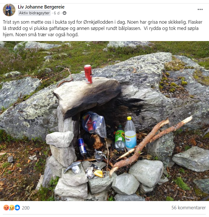 Helt på sin plass etter min mening! Lovverket finnes jf. innlegget til ryback. Mange er flinke til å plukke opp søppel etter seg når de er på tur eller camper. Men ser i løpet av juli og årets turistsessong med mye "norske turister" og hytte turister som ikke gidder å bære sitt eget søppel eller dritt. Er det fulle søppeldunker eller litt langt å gå til neste søppel dunk blir søppelen eller dritt bleia kastet på bakken. Samme med hyttefolk, er det fult i kontaineren så blir det kasta i grøfta. Dette ble posta på fjasebok og Femundsmarkas venner for få dager siden https://www.facebook.com/groups/23451097723 poeng