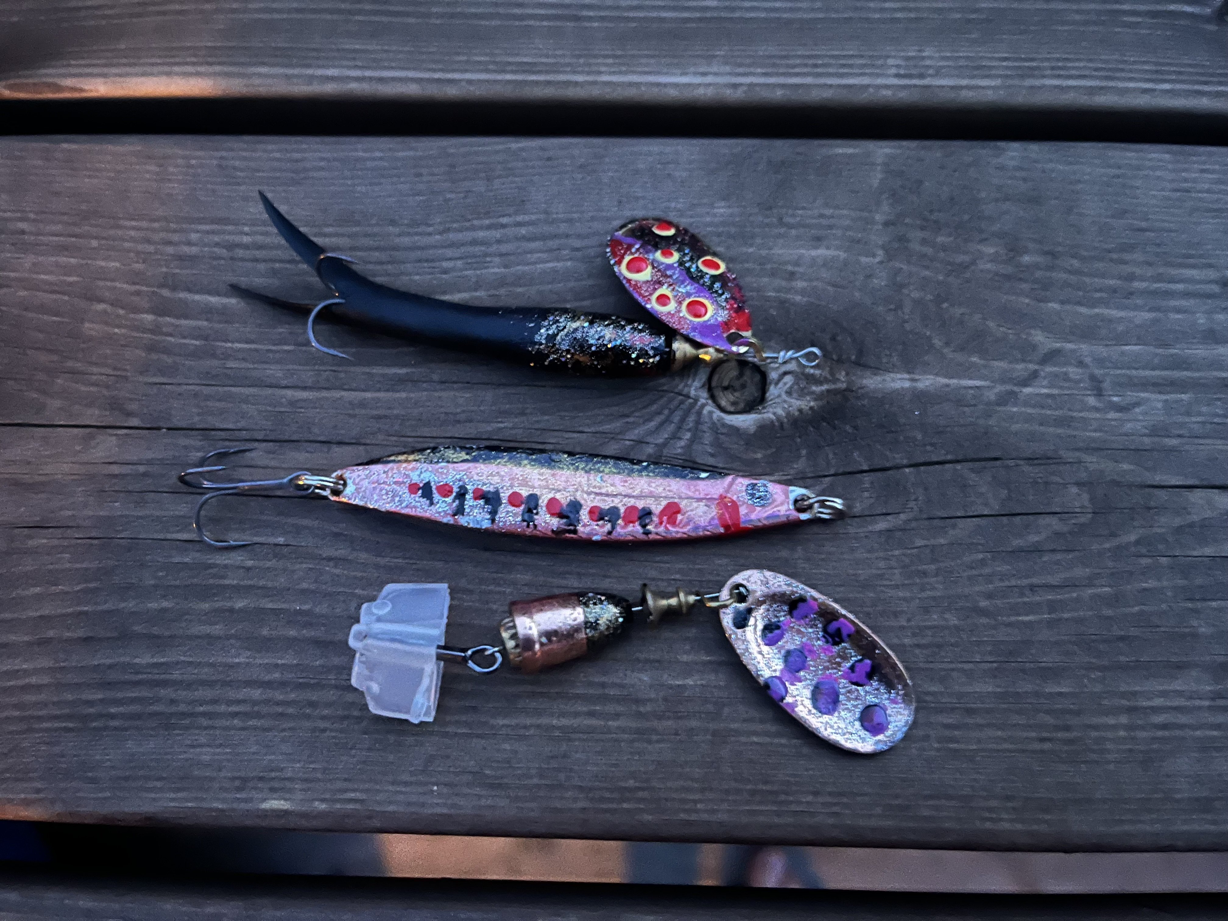 Etter tips fra en kollega malte jeg nylig opp igjen noen sluker med neglelakk kjøpt på Europris. Det går fint an å fjerne all gammel lakk med rødsprit og/eller aceton men jeg valgte å kun rense dem med isopropyl alkohol. Etter en rask runde med litt forskjellige typer base coat, neglelakk, glitter og klarlakk er resultatet klart og jeg må si meg godt fornøyd. Det gir også et resultat som ser ut til å være skikkelig holdbart. Effektivt er det også, og både den store spinneren på toppen samt møresilda har rukket å fange flere fisk siden de ble malt opp igjen.1 poeng