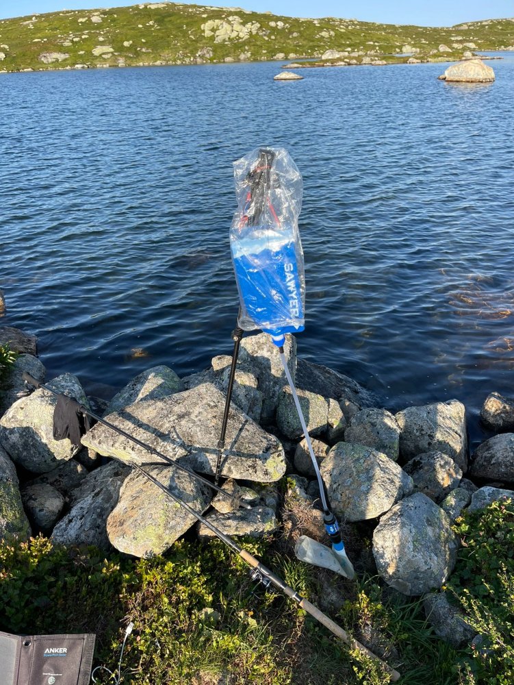 Det finns sikkert ikke så mange grunner til å velge Sawyer Mini, men det er i hvertfall 1 og det er vekt og pakkbarhet. Måtte finne fram digitalvekta og veie filteret også. Posen veier altså 16g med kork og filteret (vått filter) veide 51g. Vi snakker altså 67g og pakkes sammen til størrelsen av en tjukk grillpølse. Til Bikepacking er ofte volum vel så viktig som vekt, noen ganger viktigere.1 poeng
