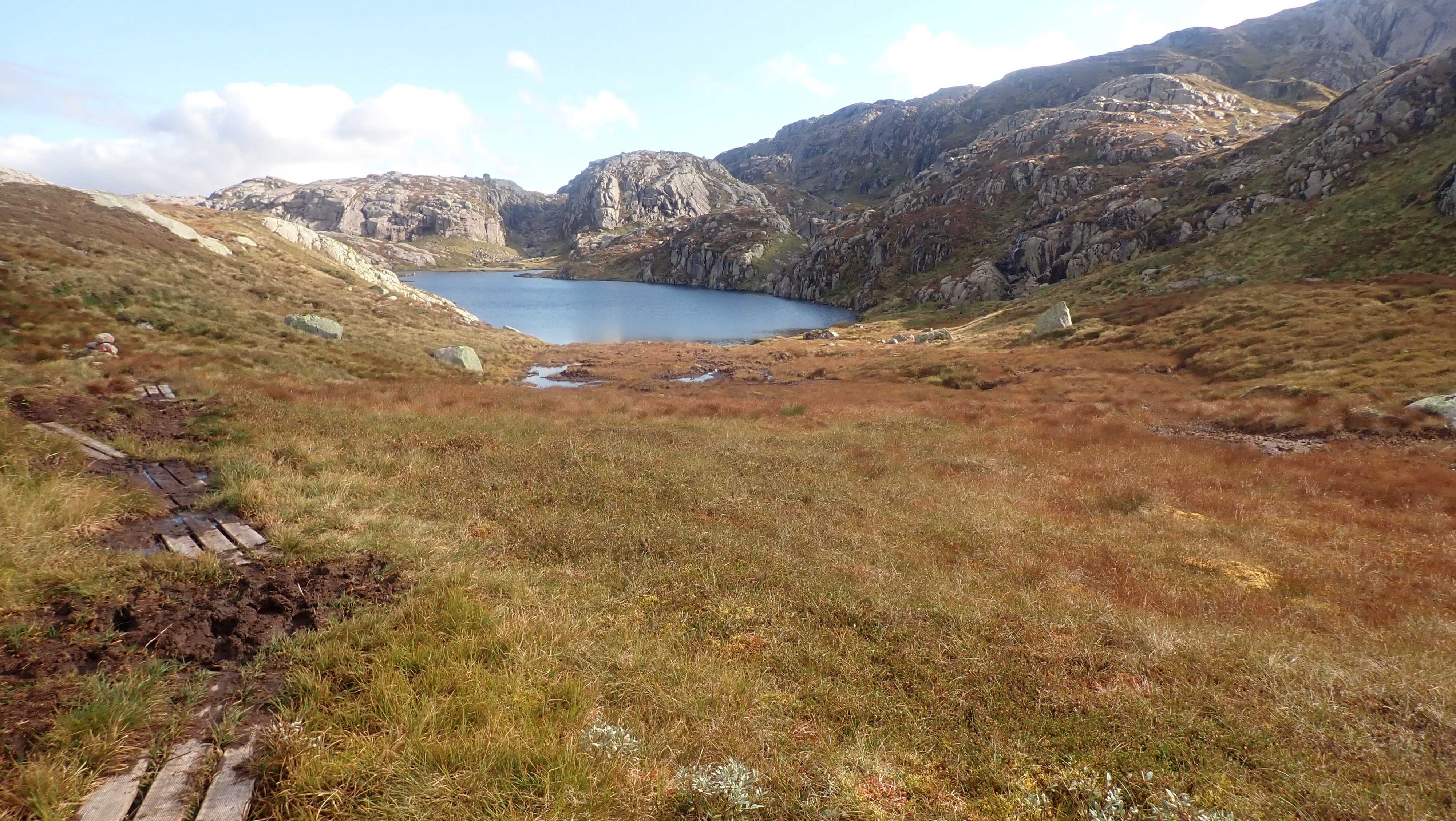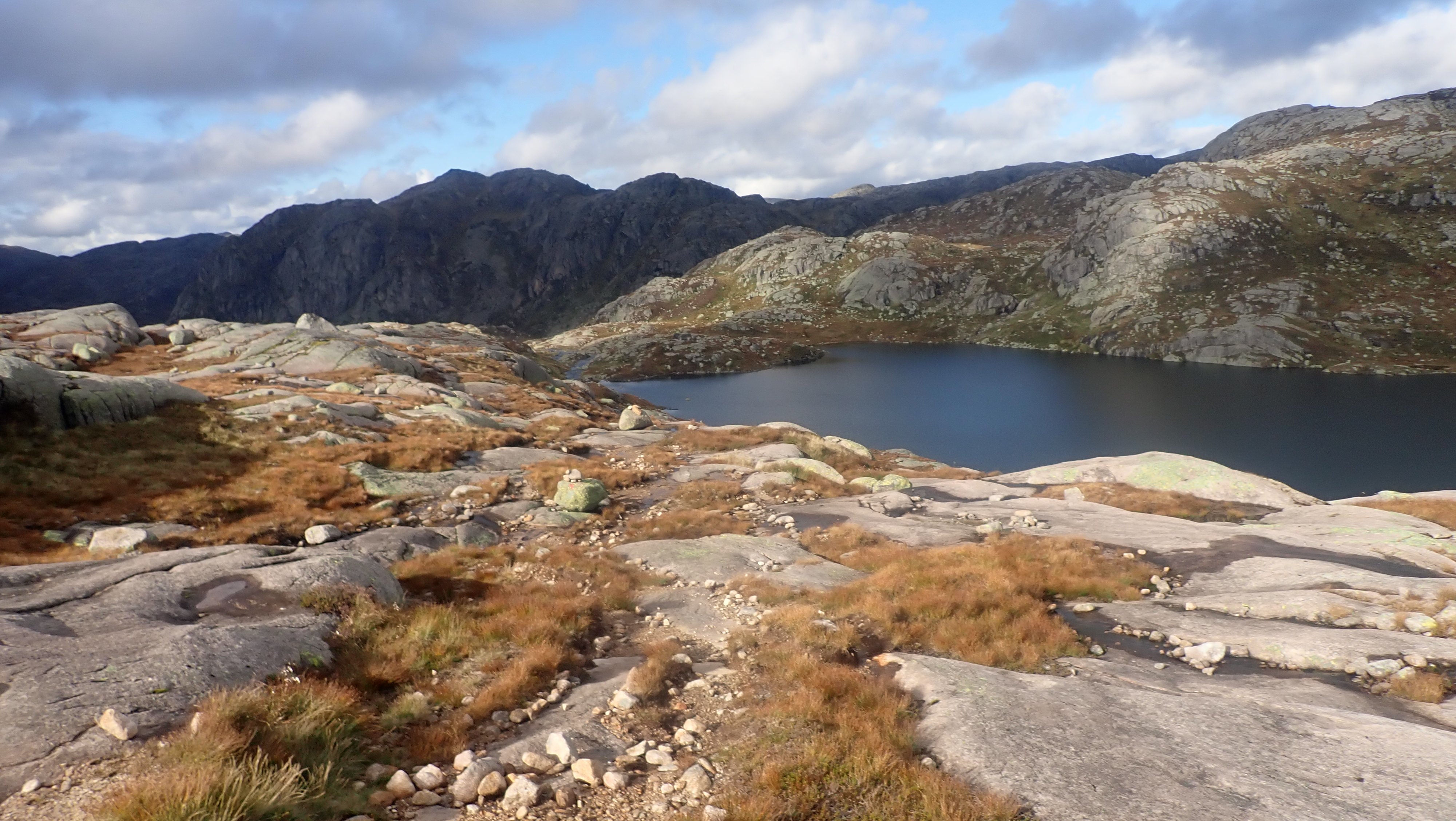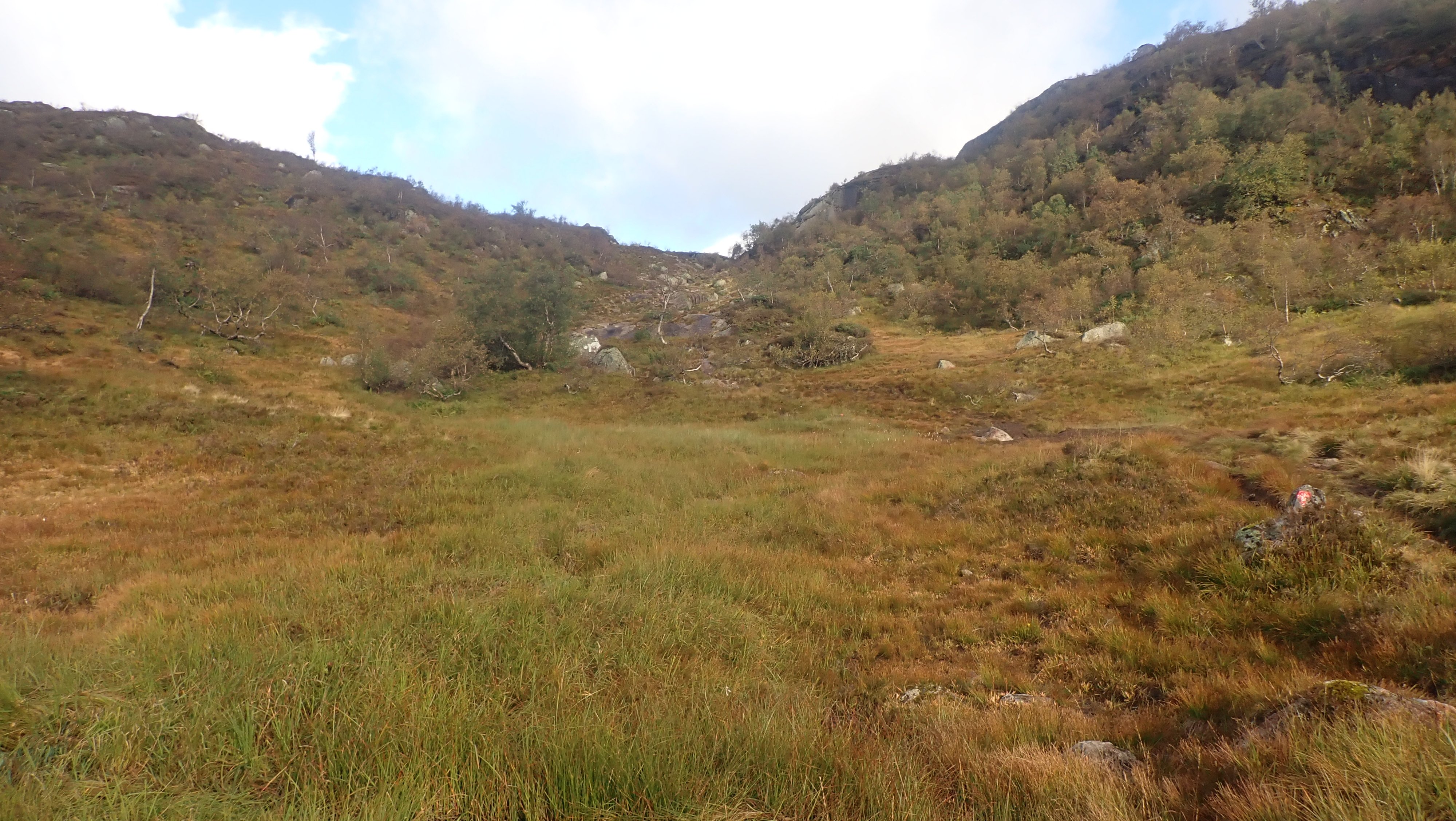 Det ble en slik tur i år også. Det begynner å bli mange år siden første gang jeg gikk innover til Blåfjellenden. Nesten 40 åt, og siden den gang har det blitt antakelig omtrent 1000 turer frem og tilbake på stien mellom Hunnedalen og Blåfjellenden. Det har alltid blitt en del overnattinger på hytta. Til å begynne med ble det to-tre netter, samt en del turer der jeg gikk frem og tilbake på dagen. Den gang, en helt grei tur på så vidt 4 timer med en god pause på hytta. De siste årene har det blitt mange turer med overnatting – og litt jobbing. Fortsatt ble det en tur eller to frem og tilbake på dagen. Etter hvert tar slike turer litt lengre tid... I fjor ble det en tur frem og tilbake på dagen. Til nå i år har jeg ikke tatt en slik tur. Den gang – i fjor – lurte jeg på om det ikke snart var siste gang jeg gjorde dette. Dette året hadde jeg ikke helt planer om en slik tur, men med nesten alle andre planlagte turer i boks, så kunne jeg muligens forsøke meg på denne en gang til. Yr og Storm var enige om at det denne dagen ville være bra vær. Det var snakk om sol, og selv om det ville være kaldt på morgenen, 4 grader ble nevnt, så ville det bli behagelig temperatur ut over dagen. Hele 16 grader var varslet. Skulle jeg prøve meg på en slik tur, var det bare å pakke sekken – lett – og ta ut. Det ble en tidlig start. Ikke mye over 8 satt jeg i bilen på vei oppover – i regn. I siste liten, det var kaldt utenfor døra hjemme, tok jeg med en lett jakke i tillegg til den lette Gore-Tex jakka. Det var meningen å legge denne igjen i bilen, men da jeg kom til parkeringsplassen var det 4 grader og vind. Jakka ble med på hele turen, både fram og tilbake, over den tynne ullblusen. Jeg måtte også finne fram et par tynne vanter, og capsen på vei over heia. Det var så pass kaldt at jeg savnet den lange under et lite øyeblikk. Nede ved hytta viste termometeret 5 grader og da var klokka omtrent 12. YR hadde nevnt 16 grader og sol. Det kom noen solglimt inne i mellom, men det ble aldri det gode været som var lovet. Det holdt seg kaldt og det blåste mer enn meldt. Det ble en ganske lang pause, hvor jeg fyrte opp i ovnen, og lukta av bjørka gjorde godt. Varm te og tørking svettevåte klær, var omtrent det jeg fikk gjort denne dagen. Godværet kom aldri og i tre-tiden tok jeg fatt på hjemveien. Oppover bakken fikk jeg til og med regn på meg. Ikke mye, og jakken ble værende i sekken. Med en mye svakere vinden bakfra, ble det en helt grei tur mot Hunnedalen. Det kom folk i mot. Hyttene på Blåfjellenden ville ikke stå tomme. Turistforeningens hytter, ville få ganske mange gjester, men det ville langt fra være fullt. Nesten nede ved Hunnedalen, gikk jeg på gamle kjente. Det var folkene på Fidjastølen som skulle inn for å prøve å få med seg flere sauer ned fra fjellet. Olav og sønnen, har jeg truffet mange ganger, og det er like hyggelig hver gang vi treffes, og får en kjekk prat om sau og hei. Litt senere kom det en kar oppover. Han skulle til stølen på Blåfjellenden, og være med på ettersankingen. Det er en jobb som betyr mange timer og mange kilometer i heia. Dette året i ganske bra vær. Onsdag var det sludd på Suleskard ikke mange kilometerne lengre nord. Vinteren er ikke langt unna. Det kan likevel bli mange flotte5 poeng