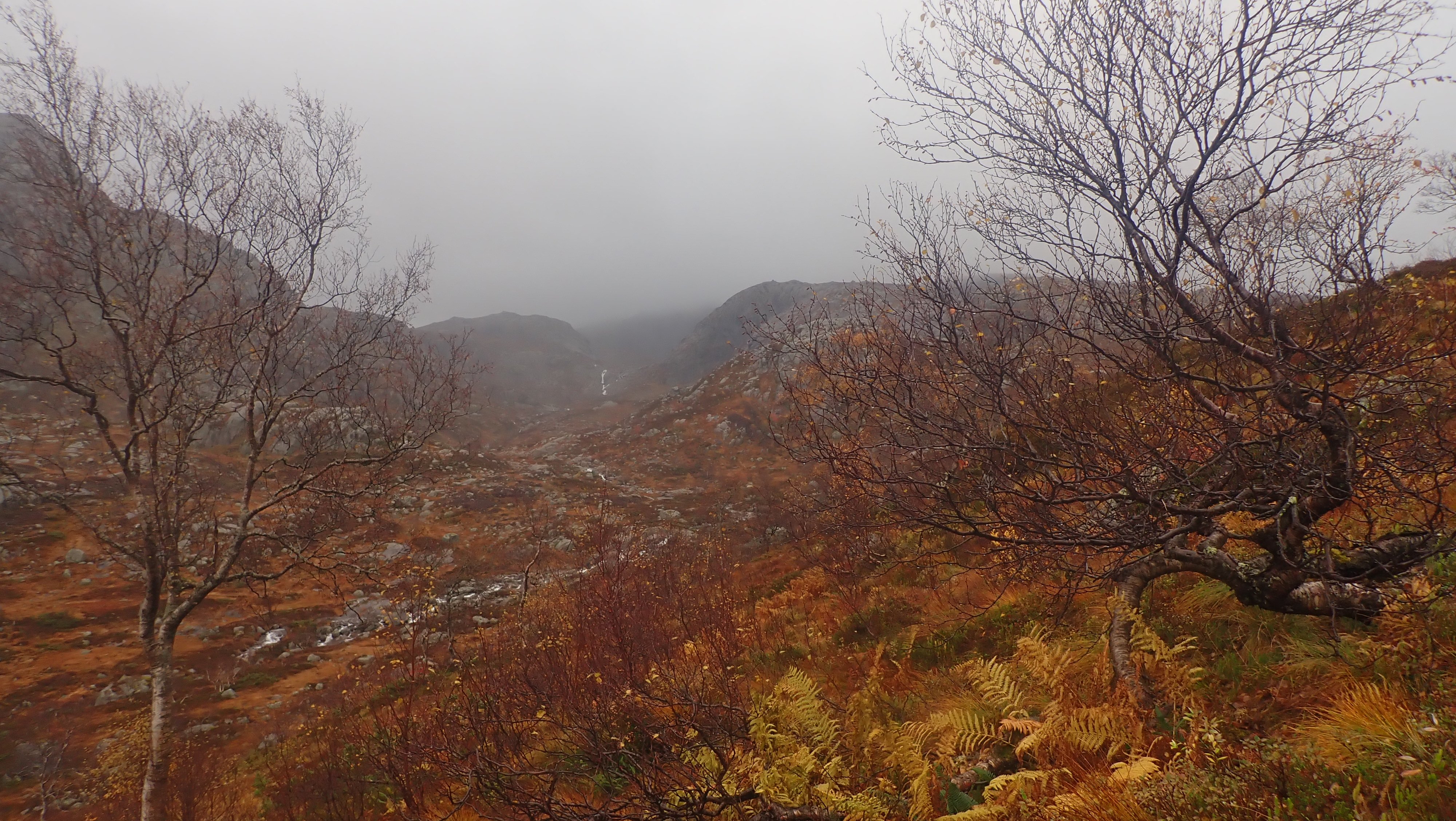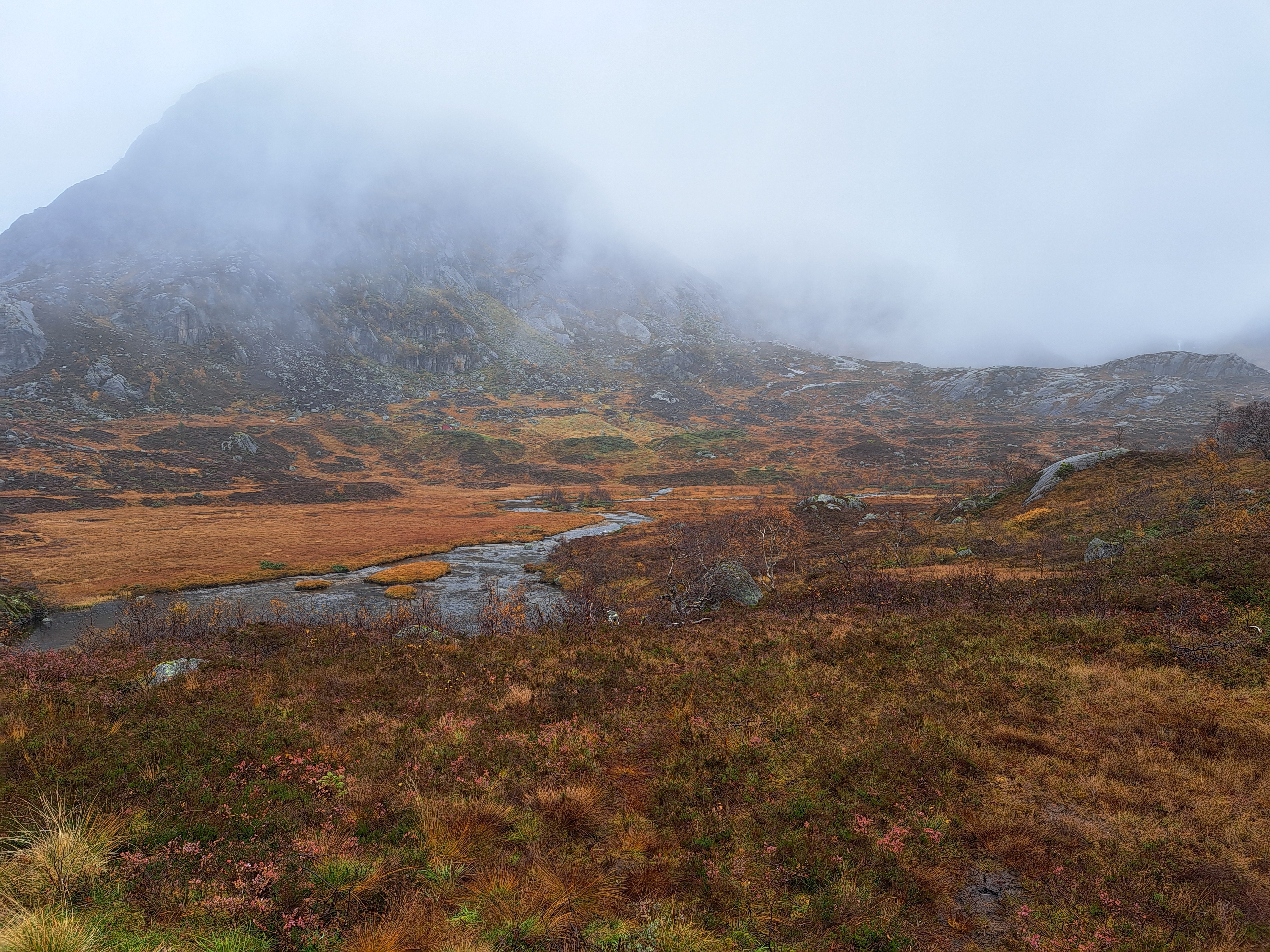 Det ble en vanlig tur til Blåfjellenden denne uka også. På tross av dårlig værmelding så jeg fram til ukens tur til Blåfjellenden. Det begynner å bli sent i sesongen og det kan ikke bli mange turer til dette året. Den siste turen går normalt i månedsskiftet oktober/november, selv om det et år har blitt en desembertur. Siste turen i fjor var i slutten av oktober. Året før fikk jeg en virkelig flott tur tilbake fra Blåfjellenden i midten av november. Jeg kan jo håpe på noe liknende i år også. Værmeldingen avgjør når det er greit å gå innover. Jeg tar ikker ut om det meldes is og snø – eller sterk vind og regn. Å vandre alene innover med slike forhold er ikke helt greit. To eller flere i lag er mye greiere. Denne uke ville det være mindre vind og mindre regn midt på dagen onsdag og torsdag. For virkelig å legge forholdene tilrette, var det snakk om vind fra sørøst på onsdagen og fra nordvest på torsdag. Det er noe helt annet å gå med været bakfra enn å få det midt i ansiktet. Det hadde vært en del folk på hytta natt til onsdag. Jeg møtte tre gjenger på min vei innover heia. De godt innepakket i jakka og med hetta opp. Jeg gikk stor sett med hetta nede, men med skikkelig vinterlue. Det ble faktisk så pass varmt etterhvert at jeg stoppet og hev mellomlaget i sekken og fortsatte i blusen under gore-tex jakken. Nå var jo turen innover ikke helt uten dramatikk likevel. I bakken nedover går stien i en bakke med sorpe. Jeg tråkket på en gresstue, som jeg trodde ville være «trygg». Den løsnet og jeg skled nedover bakken og havnet på baken. Nå har jeg vært skitten på baken noen ganger før, og uten andre skader, gikk jeg bare videre nedover, med adrenalin på topp... Skitten til knærne og med sope i baken på buksa, hadde jeg ikke tanke for å ta inn på hytta uten å ta av buksa først. Heldigvis var det ingen andre, og jeg kunne ta det hele med ro. Det var ni grader ute, og 20 grader inne. Noen av de som kom fra hytta hadde fyrt opp den morgenen. Jeg fyrte likevel opp i ovnen, og det tok ikke så veldig lang tid før det ble 25 grader inne, og jeg måtte skru ned varmen. Siden jeg hadde startet tidlig var det fortsatt noen timer med dagslys da jeg kom frem. Det ble noen timer med rydding, kost og fille, før jeg var noenlunde fornøyd. Da var det nesten kveld. Dagslyset forsvinner fort på denne tiden av året. Det var tåke og lett dusjregn da jeg sto opp på morgenen. Værmeldingen mente det skulle bedre seg ut over dagen. Jeg ventet til godt over tolv før jeg pakket sekken og tok opp bakken. Da hang tåka fortsatt ned over fjellsiden. Det var nesten vindstille på morgenen. Pytten utenfor døra lå speilblank, men da jeg kom opp i høyden, fikk jeg vinden bakfra. Det var også adskillig kaldere enn dagen før, med bare tre-fire grader nede ved hytta. Bortover flyene måtte jeg trekke inn – ha opp hetta, selv om vinden kom bakfra. Det ble skikkelig kaldt i nakken. Jeg ble igjen glad for å ha klær som står for en støyt. Både i vind og regn. Det er egentlig ikke så ofte jeg virkelig har bruk for Norrøna Recon, men de – meget få – gangene jeg er ute i slikt vær er de omtrent verdt prisen. Utenom helt på toppen, på bare heia, var det ganske bra forhold, og nedover mot Hunnedalen tittet til og med sola igjennom. Som vanlig ble det en grei tur, og jeg var ganske godt fornøyd da jeg sto ved bilen. Turen hadde også gått kjapt, på bedre tid en vanlig. Selv om forholdene ikke var optimale.5 poeng
