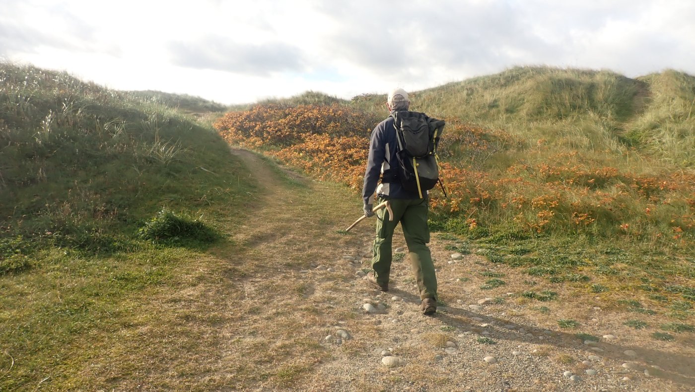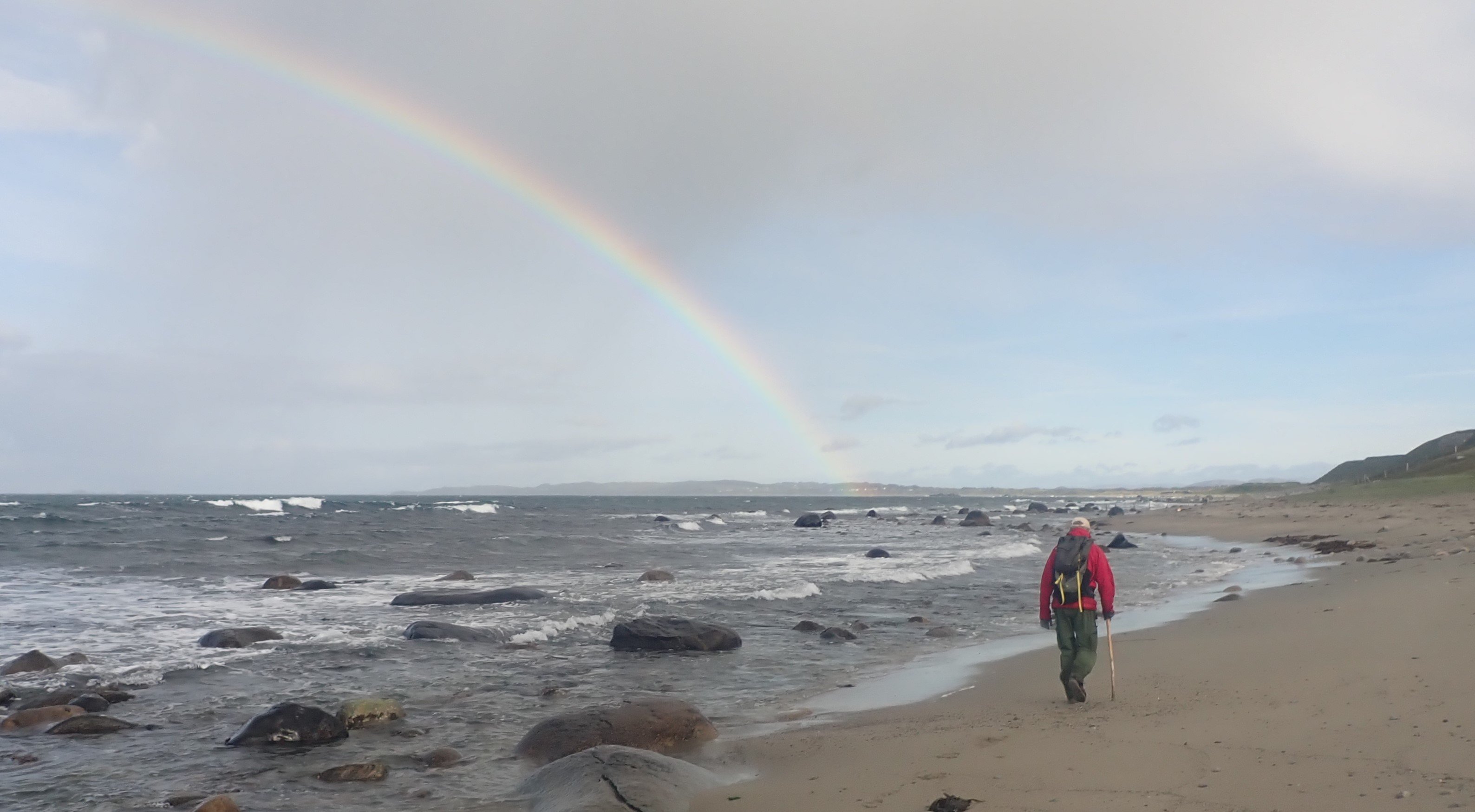Regn, vind, sol og regnbue. Jeg har kjent noe småvondt i venstrekneet den siste tiden, og sagt til meg selv at det går sikkert over. På vei tilbake fra Blåfjellenden sist, ble det høyre kneet vondt. Faktisk så dårlig at jeg tok et par dager uten tur. Det er ikke helt lett for gamle folk å sitte i ro i flere dager, selv om jeg benyttet anledningen til å ta en omgang med styrketrening. Det var lenge siden og plutselig fikk jeg andre «vondter» å tenke på – dagen etter. Mandag ville Yr ha det til at det skulle bli ganske bra vær, med lite vind og en del sol. Det var ikke snakk om regn i hvert fall. Nå holder ikke Yr alltid det de lover, men denne gangen tok jeg på finværsutstyr, selv om jeg mente det kunne bli våte partier i stien. Det skulle blåse fra nord, men ikke sterkt, og det ville ville bedre ut over dagen. Meningen var å ta en virkelig enkel og lett tur, bare for å teste knær. Siden det er enkelt å komme til flate strender, mente jeg det ville passe å ta en tur fra Bore til Reve Havn. Det er ikke snakk om bakker på denne turen, selv om det er noen små humper bortover. Flatt og greit å gå, men muligens litt fuktig helt mot havnen der dyra har gått opp myrsøkkene. De siste årene har jeg brukt ALFA Impact, som skulle holde livet ut. Det tok under to år før jeg måtte skifte såle og Gore-tex – til et par tusen kroner. Nå viste det seg at skoene ikke holdt tett etter reparasjon, men de burde likevel holde til turen i sjøkanten, så lenge det ikke regner. Jeg tok kontakt med broderen og han snudde om på planene og ble med på en strandtur. Vi startet litt senere enn vanlig, men uten en kjøretur i begge ender, ville vi likevel være hjemme igjen på vanlig tid. Det var litt sol da vi kom til Bore. Vinden, som ikke var mer enn 5-6 m/sek, var svinkald, og broderen savnet skikkelig hodeplagg. Det gikk likevel greit ut over mot Fuglingene og videre mot Reve. Etter en stund fikk vi svarte og sinte skyer over oss, or det kom regn. Litt mer enn bare en liten byge, nok til at vi våte. Den gamle (under to år) Norrøna Recon buksa holdt ikke regnet ute på lårene og det ble kaldt. Jeg savnet et lite øyeblikk et ekstra lag under... Med vinden i ryggen, sol i ansiktet, for sola kom selvsagt fram etter hvert, ble det likevel en helt grei tur havna. Som vanlig ble det stopp med Gjendekjeks og varm te. Det ble adskillig kaldere da vi satte kursen mot nord, selv om det var sol, og fikk vinden mot oss. Nå hadde vinden, som yr meldte, løyet litt. Likevel beholdt både broderen og jeg jakken på, over vindfleecen. Et stykke lengre nord, fikk vi se regnbue og ikke lenge etter kom regnet. Jeg hadde med en litt enkel Bergans allværsjakke. For enkel har det vist seg. Hetta på den jakke kan ganske enkelt ikke brukes i vind. Den blåser rett av. Med glidelåsen på jakka helt opp under haka, holder hetta seg sånn noenlunde på plass, men uten glidelåsen helt oppe, så blåser hetta rett av hodet. Nå varte regnet ikke lenge og på vei mot parkeringsplassen og bilen kom sol atter fram – og gjorde det varmt. Det var en dag med mye vær, både godt og dårlig. Skoene viste seg å tåle det lille vannet vi fikk på oss, så de kan muligens brukes -på søndager med godt vær, men buksa må pensjoneres. Jakken kan brukes som finværsjakke på sommeren. Men kneet holdt.1 poeng
