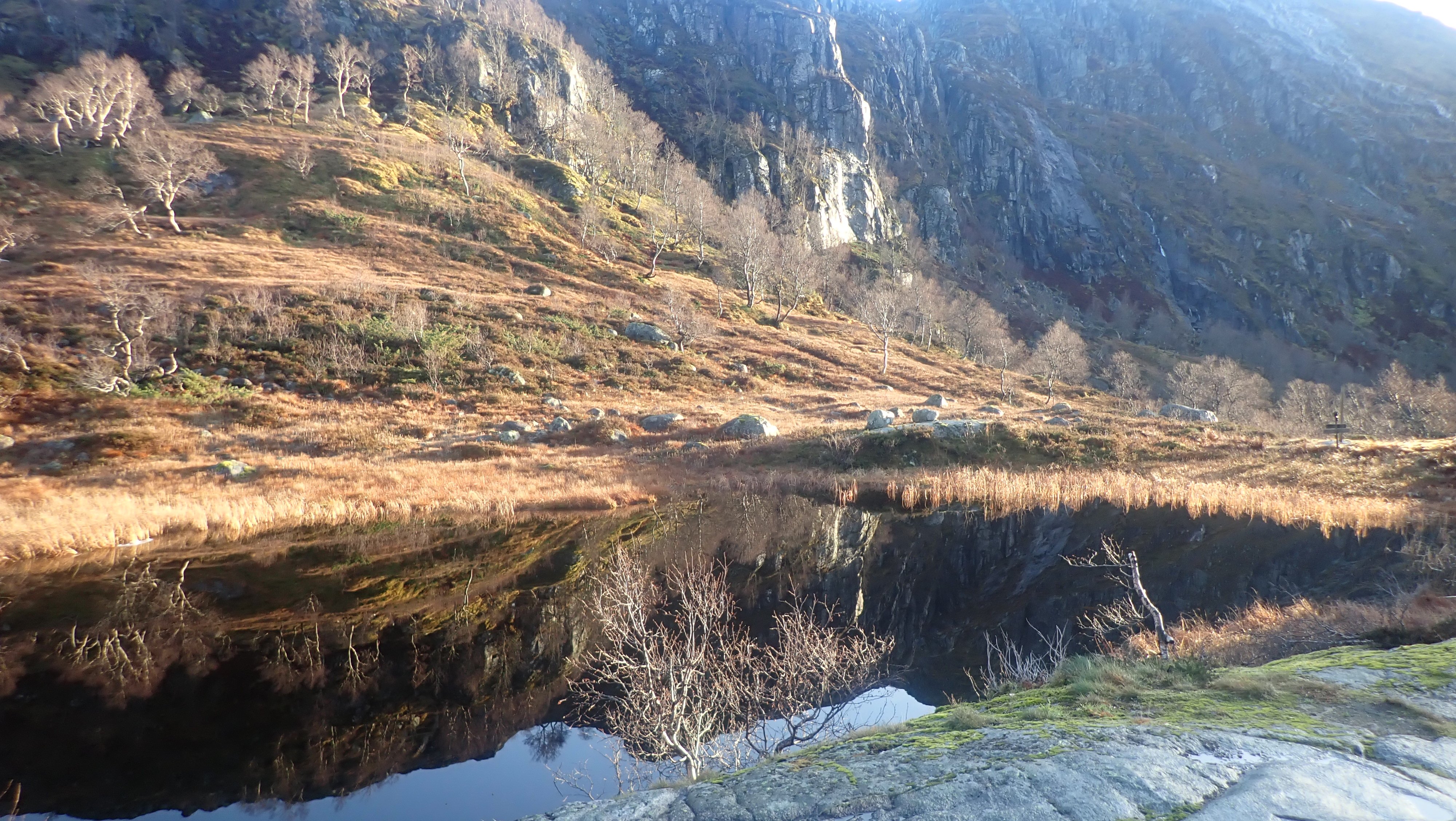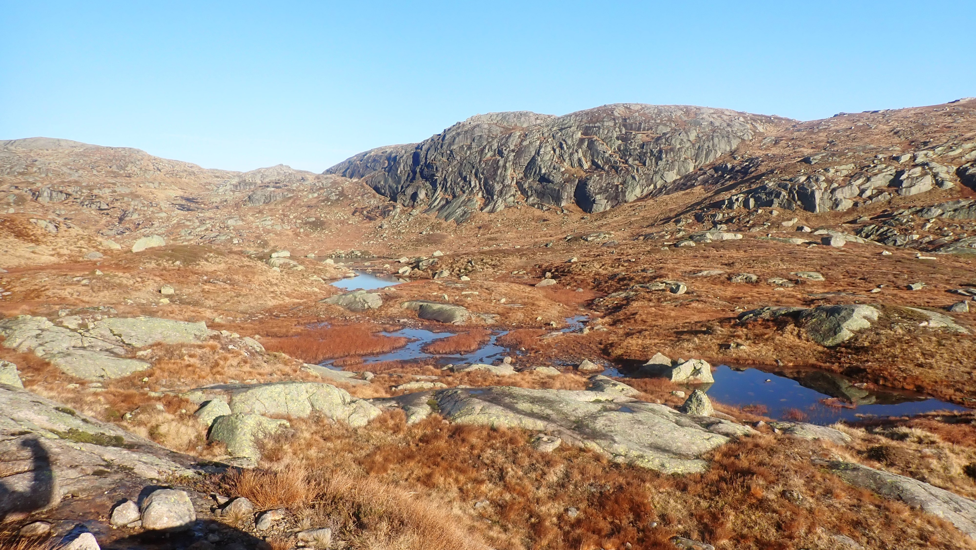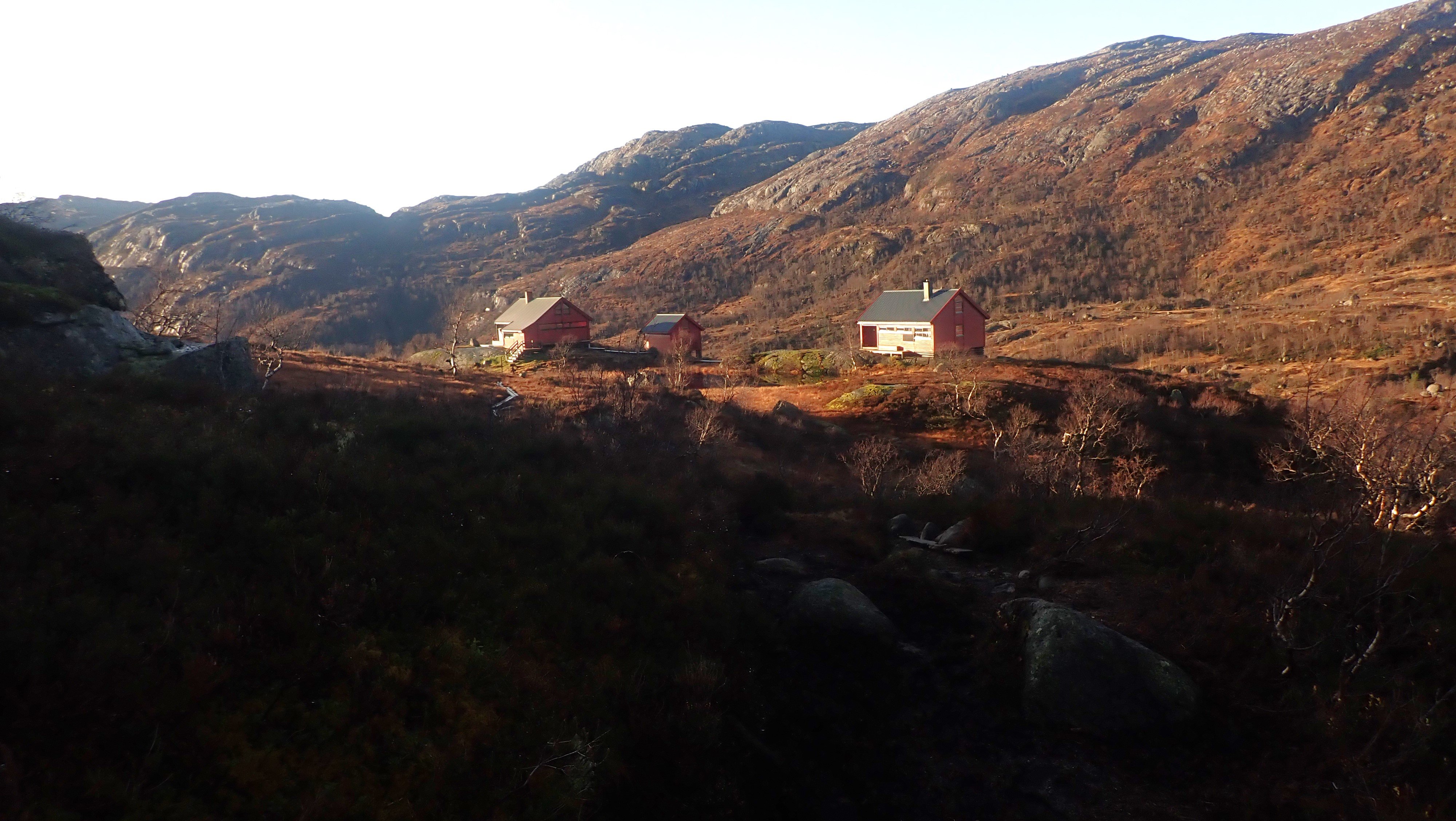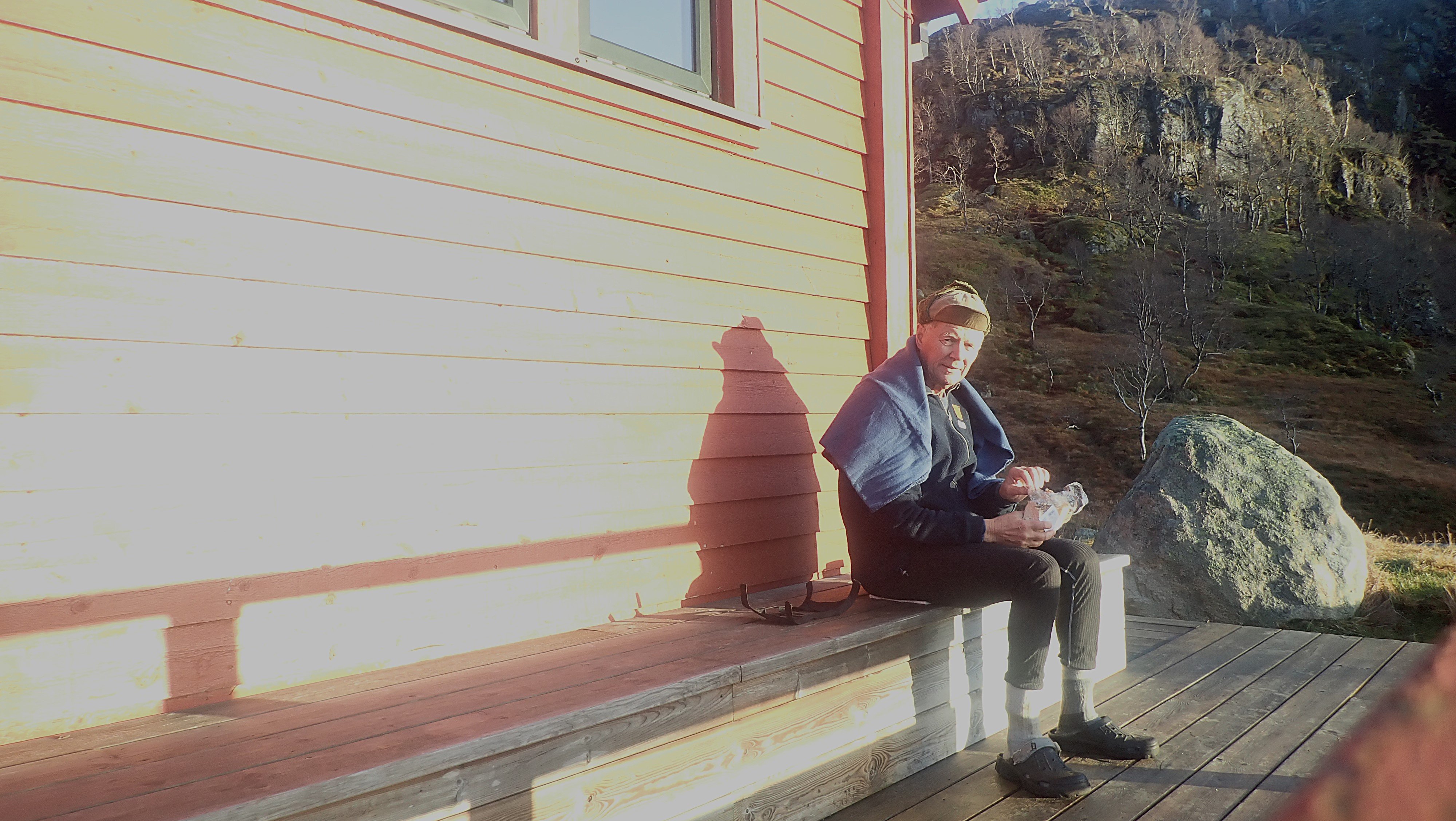 En virkelig flott tur i heia. Dette året har det vært en lang sesong for fot-turer inn til Blåfjellenden. Det ble en tidlig start. Alt 18. mai var jeg på tur innover. Fortsatt med snø og is, men det var helt greit ¨komme inn til hytta. Jeg var ikke alene i flott vær, og det kom folk fra mange steder. Den siste turen, før vinteren tar over, går som regel i månedskifte oktober/november. Sist jeg var innover, var jeg svært usikker på om det ville bli flere turer dette året. Denne uka mente både yr og storm at det ville være varmegrade, lite vind og ingen nedbør både mandag og tirsdag. Det burde så avgjort være mulig å komme inn en gang til før snø og is gjør det vanskelig. Det er folk som går innover selv om det er frost. Det er ikke helt noe for meg. Balansen er ikke som den var og det er heller ikke like kjekt å ta ut i dårlig vær. Jeg satset på en tur til. Værmelderene mente det ville være tåkeskyer og lite sol, både mandag og tirsdag. Hjemme lå tåka som et lokk over landskapet, men ikke langt inne i landet ble det blå himmel, og oppe i Hunnedalen var det ikke antydning til skyer. Blå himmel og sol var det som møtte meg, men sola sto lavt og mye av stien lå i skyggen av fjellet. I gore-tex jakke med bare en ullbluse under, var det ørlite kaldt starten, men oppover bakkene der sol fikk tak ble det varmt. Jeg lurte på hive av jakken, men gadd ikke. Jeg åpnet jakken i front og trakk ned glidelåsene i buksa, men fortsatt svettet jeg. Oppe i høyden fikk jeg trekken (Det blåste ikke mange meter i sekundet) midt i mot, og glidelåsene kom fort opp og jakken var plutselig helt nødvendig. Nede i hytta var det 7 grader inne og solskinn utenfor. Etter å ha hentet både vann og ved, fyrte jeg opp ovnen, men trakk bort på terrassen utenfor hovedhytta. I sola var det helt greit å ta en skikkelig pause med varm te og mat. Jeg fant et pledd og hadde det rundt meg. Det var ikke direkte varmt , selv om sola skinte. Det ble en flott stund i eget selskap. Terrassen på hovedhytta har virkelig flott utsikt nedover Fidjadalen og det er mange som synes utsikten er verdt hele turen inn. Jag satt til sola gikk ned bak fjellene nede i dalen. Etter bålfyring i et par timer, var temperaturen inne så vidt over tyve grader, og det hadde gått med en sekk ved og vel så det. Det ble fyring ut over kvelden for å holde varmen. Sola forsvant i firetiden, men først litt før halv seks var det mørkt ute. Jeg var ute i et nødvendig ærend i løpet av natta, og da var det fortsatt varmegrader. Da jeg sto opp, var det ny is på pytten utenfor. Temperaturen var nesten fem grader, og jeg ventet til litt ut på dagen før jeg tok ut mot Hunnedalen. Det var en helt annen verden ute enn det værmeldingen hadde ment jeg ville få. Sola skinte – lavt – fra blå himmel. Det var ikke et vindpust. Pytten – der den ikke var dekket av is, lå speilblank. Det var virkelig flott, og jeg så fram til turen over heia mot Hunnedalen. Problemet var at temperaturen sank fortsatt, og var rundt null i skyggen. Gangveiene var dekket av is og spinnglatte. Det gikk sakte i bakken, men oppe i høyden der sola hadde fått tak, var det tørt og greit Det ble egentlig en fantastisk tur over heia. Vannene lå speilblanke eller med et tynt islag. Sola skinte. Inne i skyggen var det mørkt – kontrasten var stor. Det ble en del stopp for å ta bilder. Det er sjeldent så pass bra vær så sent på året, og her var det bare å ta for seg. Jeg glemte is og glatte forhold på veien over heia, men i skyggen langs det nederste Fossebekktjødnet, fikk jeg en litt ubehagelig opplevelse. Det var is i stien – som ikke viste, og jeg skled nedover. Nede ved bilen var det bare så vidt over null, men heldigvis var veien klar, og selv om jeg fortsatt har sommerdekk, gikk turen mot Byrkjedal greit. Høsten er over og det nærmer seg vinter.1 poeng