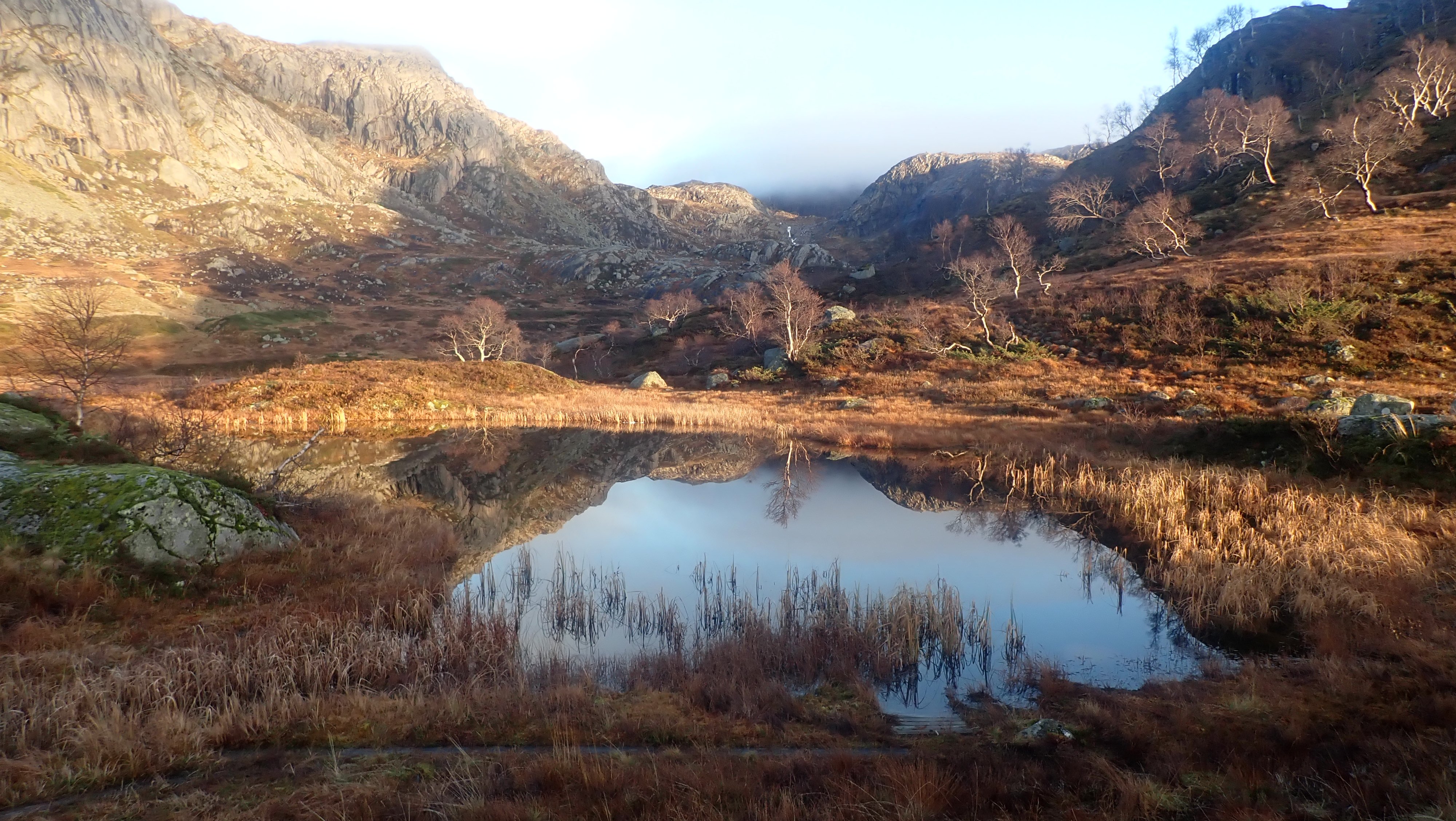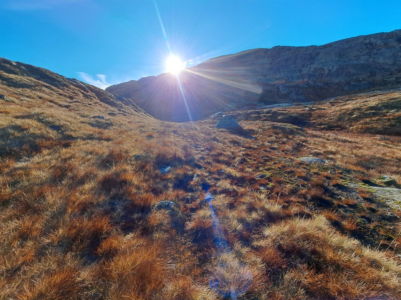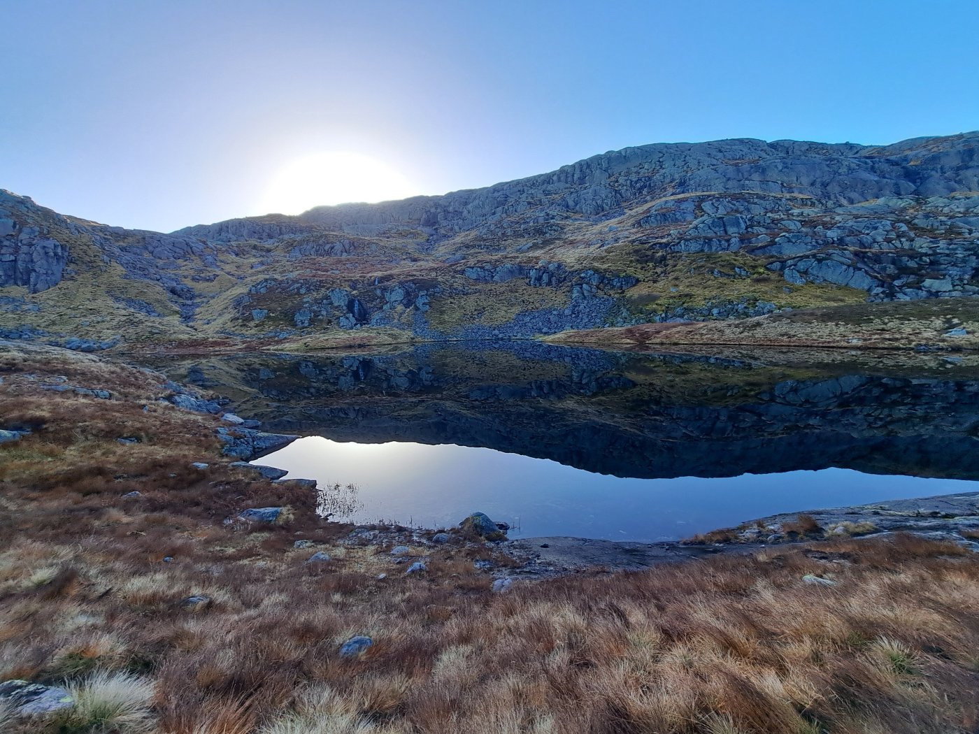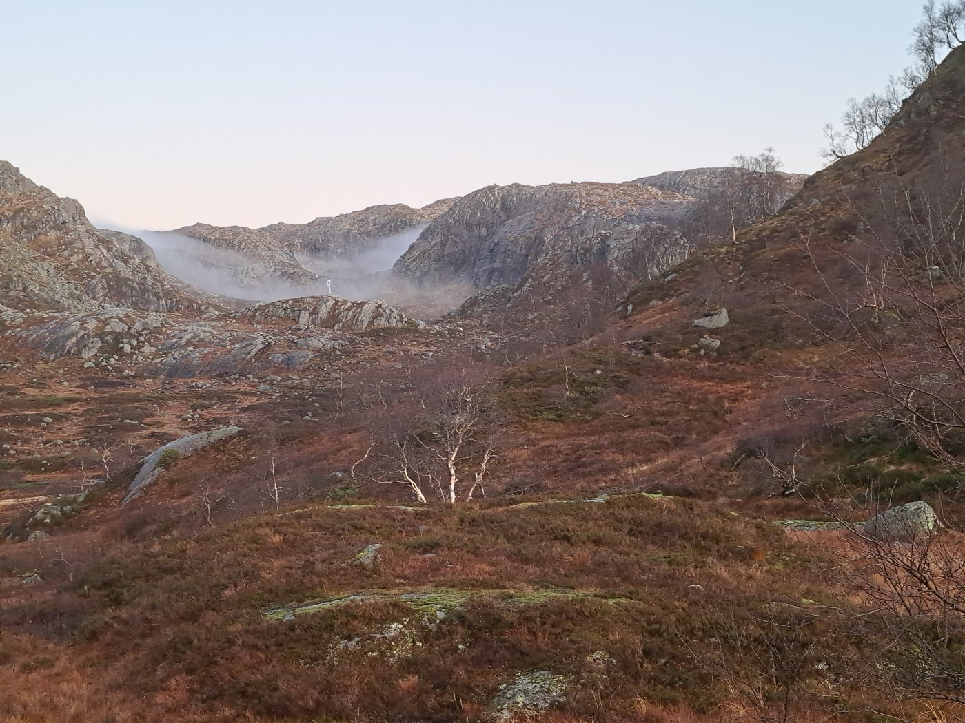 En virkelig flott tur i heia. Dette året har det vært en lang sesong for fot-turer inn til Blåfjellenden. Det ble en tidlig start. Alt 18. mai var jeg på tur innover. Fortsatt med snø og is, men det var helt greit ¨komme inn til hytta. Jeg var ikke alene i flott vær, og det kom folk fra mange steder. Den siste turen, før vinteren tar over, går som regel i månedskifte oktober/november. Sist jeg var innover, var jeg svært usikker på om det ville bli flere turer dette året. Denne uka mente både yr og storm at det ville være varmegrade, lite vind og ingen nedbør både mandag og tirsdag. Det burde så avgjort være mulig å komme inn en gang til før snø og is gjør det vanskelig. Det er folk som går innover selv om det er frost. Det er ikke helt noe for meg. Balansen er ikke som den var og det er heller ikke like kjekt å ta ut i dårlig vær. Jeg satset på en tur til. Værmelderene mente det ville være tåkeskyer og lite sol, både mandag og tirsdag. Hjemme lå tåka som et lokk over landskapet, men ikke langt inne i landet ble det blå himmel, og oppe i Hunnedalen var det ikke antydning til skyer. Blå himmel og sol var det som møtte meg, men sola sto lavt og mye av stien lå i skyggen av fjellet. I gore-tex jakke med bare en ullbluse under, var det ørlite kaldt starten, men oppover bakkene der sol fikk tak ble det varmt. Jeg lurte på hive av jakken, men gadd ikke. Jeg åpnet jakken i front og trakk ned glidelåsene i buksa, men fortsatt svettet jeg. Oppe i høyden fikk jeg trekken (Det blåste ikke mange meter i sekundet) midt i mot, og glidelåsene kom fort opp og jakken var plutselig helt nødvendig. Nede i hytta var det 7 grader inne og solskinn utenfor. Etter å ha hentet både vann og ved, fyrte jeg opp ovnen, men trakk bort på terrassen utenfor hovedhytta. I sola var det helt greit å ta en skikkelig pause med varm te og mat. Jeg fant et pledd og hadde det rundt meg. Det var ikke direkte varmt , selv om sola skinte. Det ble en flott stund i eget selskap. Terrassen på hovedhytta har virkelig flott utsikt nedover Fidjadalen og det er mange som synes utsikten er verdt hele turen inn. Jag satt til sola gikk ned bak fjellene nede i dalen. Etter bålfyring i et par timer, var temperaturen inne så vidt over tyve grader, og det hadde gått med en sekk ved og vel så det. Det ble fyring ut over kvelden for å holde varmen. Sola forsvant i firetiden, men først litt før halv seks var det mørkt ute. Jeg var ute i et nødvendig ærend i løpet av natta, og da var det fortsatt varmegrader. Da jeg sto opp, var det ny is på pytten utenfor. Temperaturen var nesten fem grader, og jeg ventet til litt ut på dagen før jeg tok ut mot Hunnedalen. Det var en helt annen verden ute enn det værmeldingen hadde ment jeg ville få. Sola skinte – lavt – fra blå himmel. Det var ikke et vindpust. Pytten – der den ikke var dekket av is, lå speilblank. Det var virkelig flott, og jeg så fram til turen over heia mot Hunnedalen. Problemet var at temperaturen sank fortsatt, og var rundt null i skyggen. Gangveiene var dekket av is og spinnglatte. Det gikk sakte i bakken, men oppe i høyden der sola hadde fått tak, var det tørt og greit Det ble egentlig en fantastisk tur over heia. Vannene lå speilblanke eller med et tynt islag. Sola skinte. Inne i skyggen var det mørkt – kontrasten var stor. Det ble en del stopp for å ta bilder. Det er sjeldent så pass bra vær så sent på året, og her var det bare å ta for seg. Jeg glemte is og glatte forhold på veien over heia, men i skyggen langs det nederste Fossebekktjødnet, fikk jeg en litt ubehagelig opplevelse. Det var is i stien – som ikke viste, og jeg skled nedover. Nede ved bilen var det bare så vidt over null, men heldigvis var veien klar, og selv om jeg fortsatt har sommerdekk, gikk turen mot Byrkjedal greit. Høsten er over og det nærmer seg vinter.1 poeng