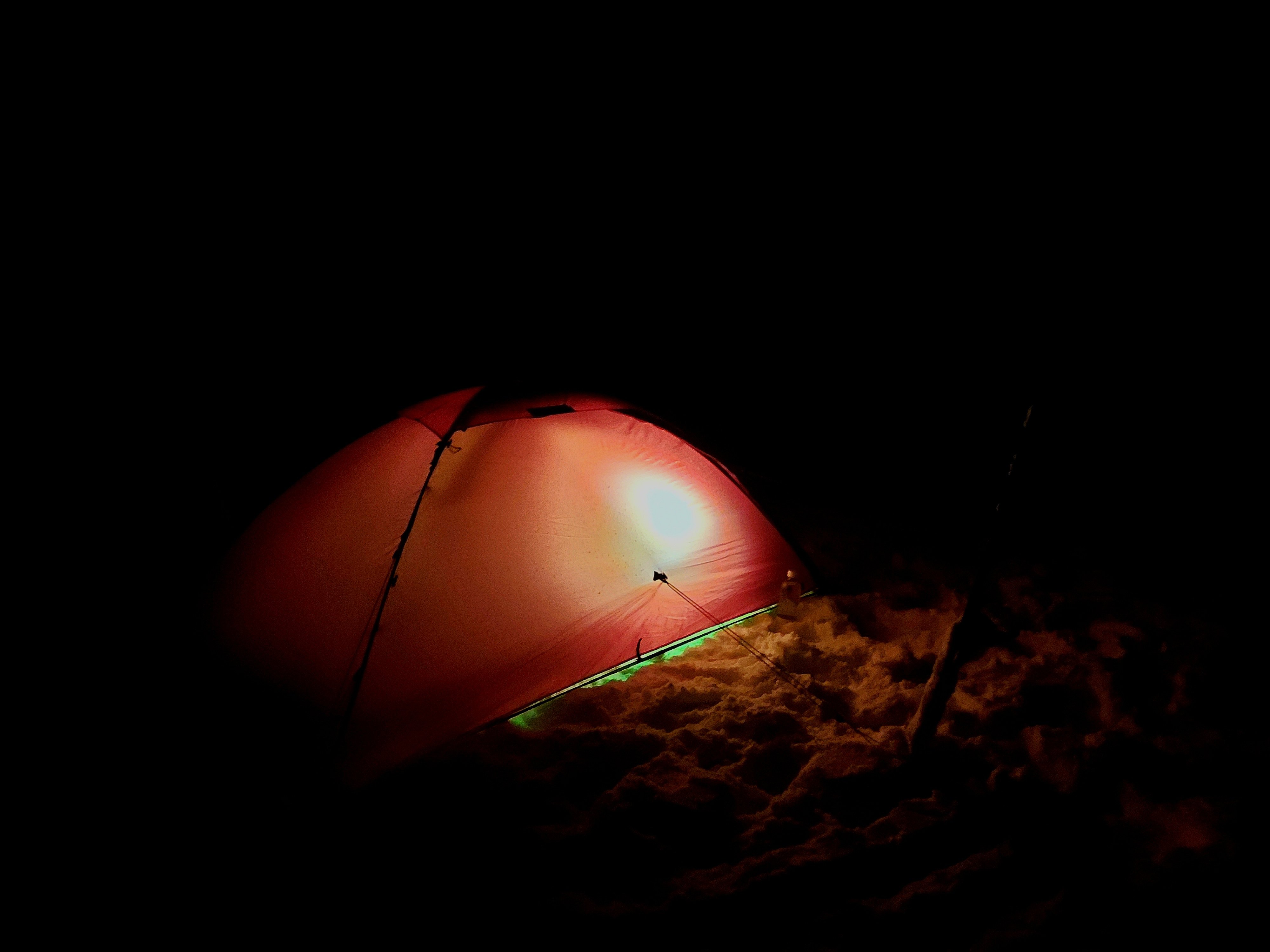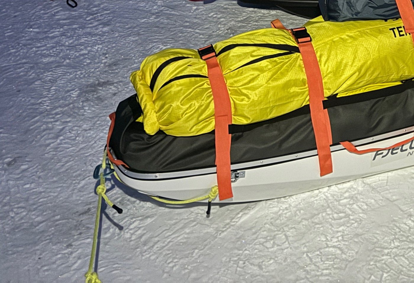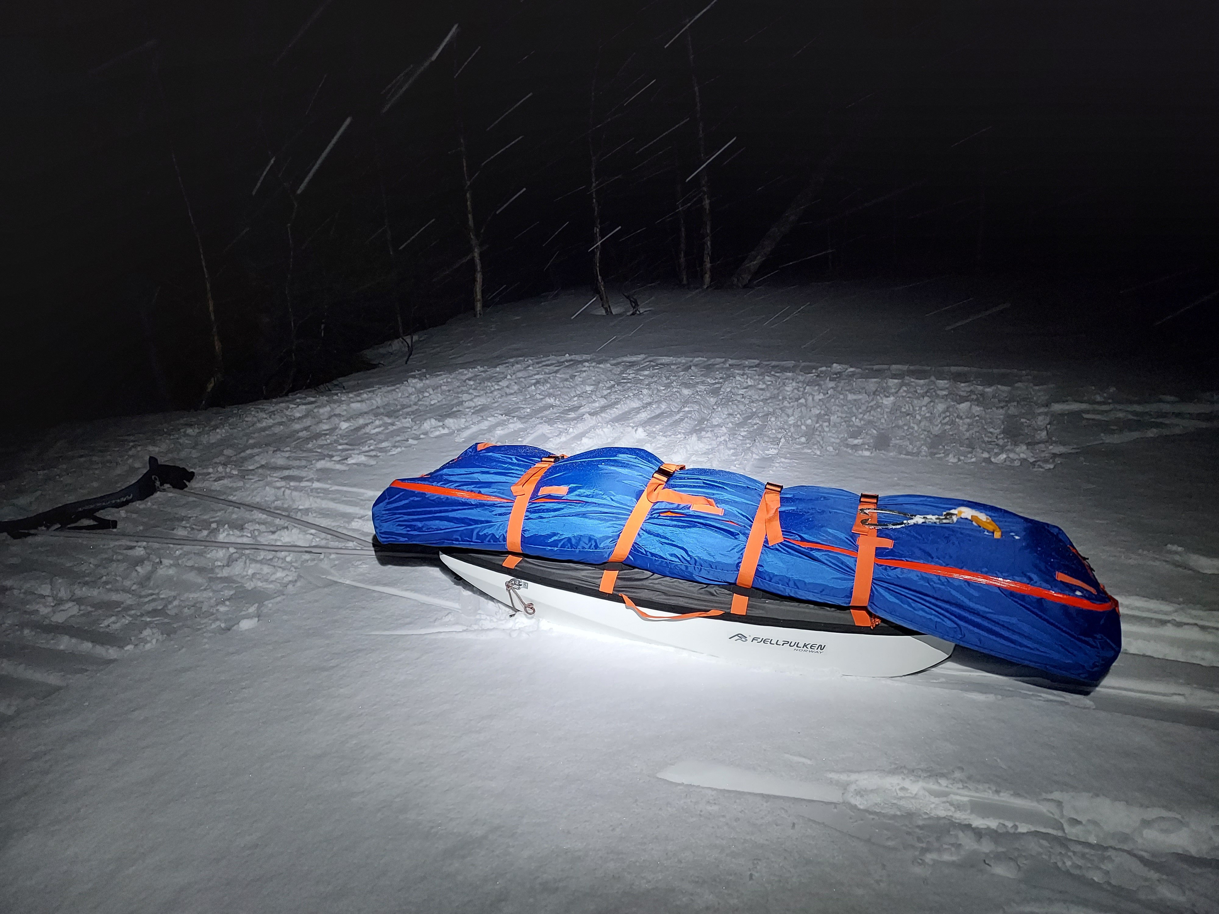 Dobbel testtur i kveld. Første tur med Fjellpulken Touring 145, samtidig som jeg prøver Hilleberg Unna i snøvær. Beddingen fra Sydvang og reimene til Touring 145 var ikke helt på stasjon. Det er laget løkker i beddingen for å tre reimene gjennom, men det passet kun på én, så kom resten ut av synk. Burde nok festet beddingen lengre frem på pulken, men på grunn av betongføre så gjorde det ikke noe at den stakk ut litt bak. Boksen som jeg kjøpte kom nesten helt bak. Uten å måle tipper jeg det var 5-7 cm igjen av pulken, bak boksen. Som sagt er jeg på en dobbel testtur, og prøver også Unna for første gang i lett snøvær. Tror ikke jeg vil anbefale det til så mange. Med bedding, dobbelt underlag og litt kraftig 3-sesongspose er jeg borti innerduken både i fot og hodeende. Det ble litt for mye kontakt med innerteltet etter min smak. Særlig vinterstid når det blir en del kondens inni teltet.1 poeng