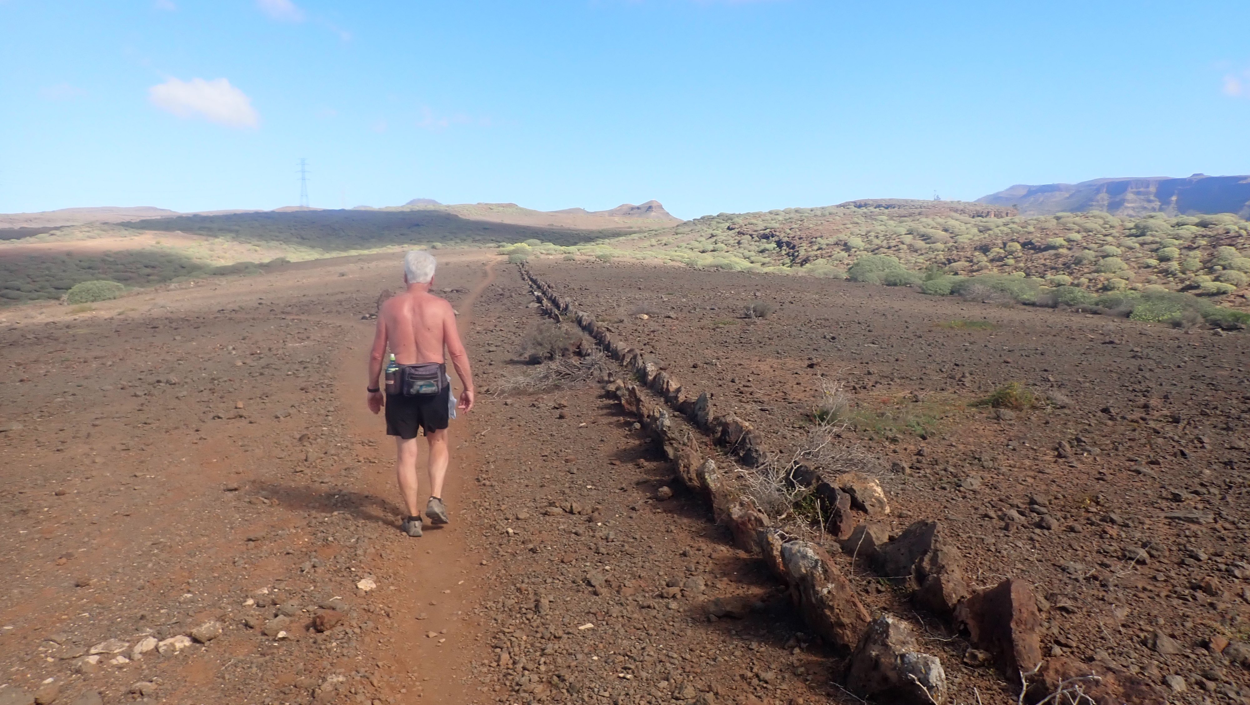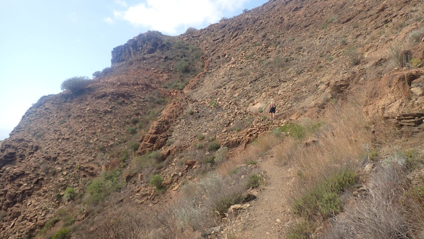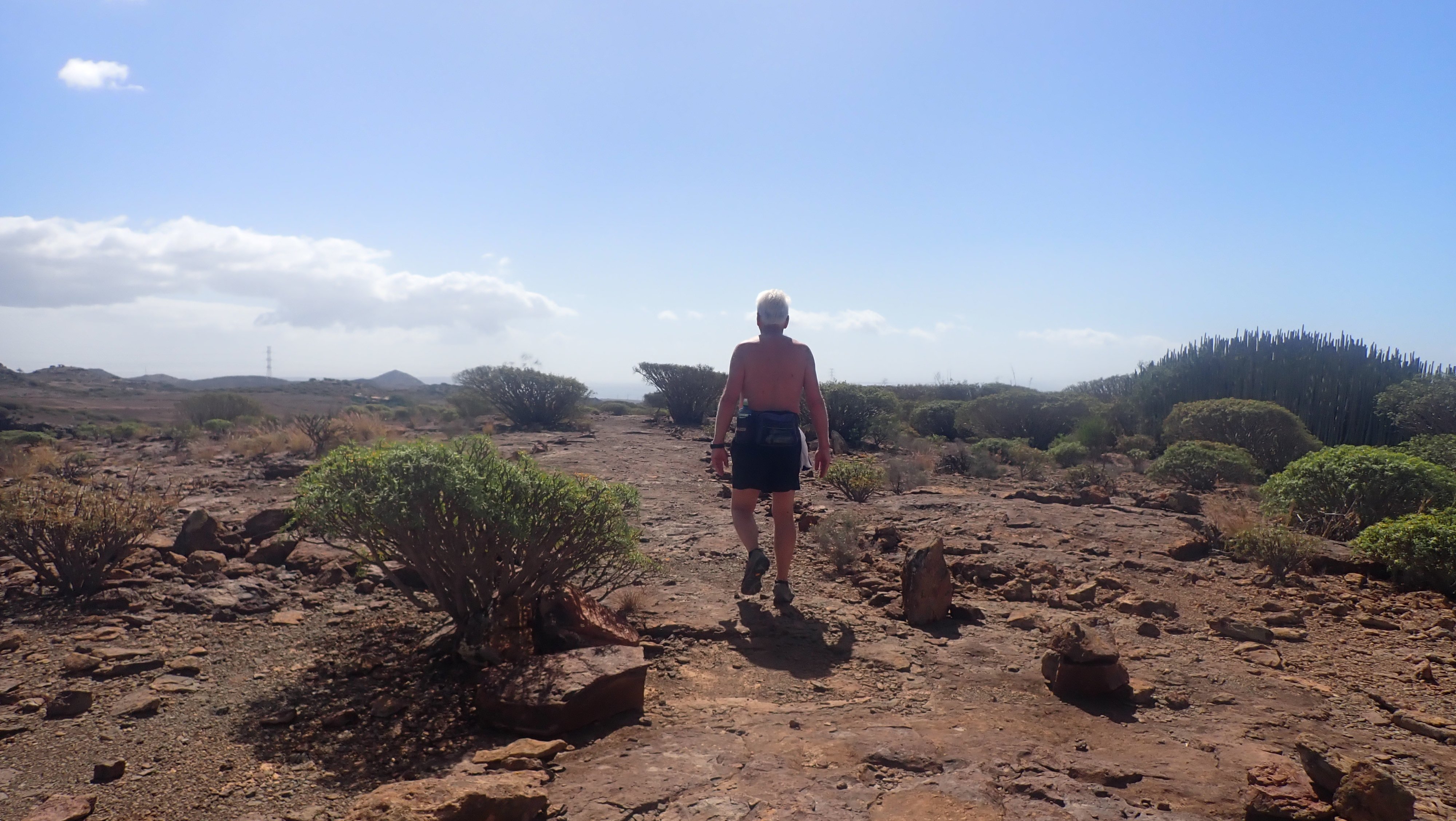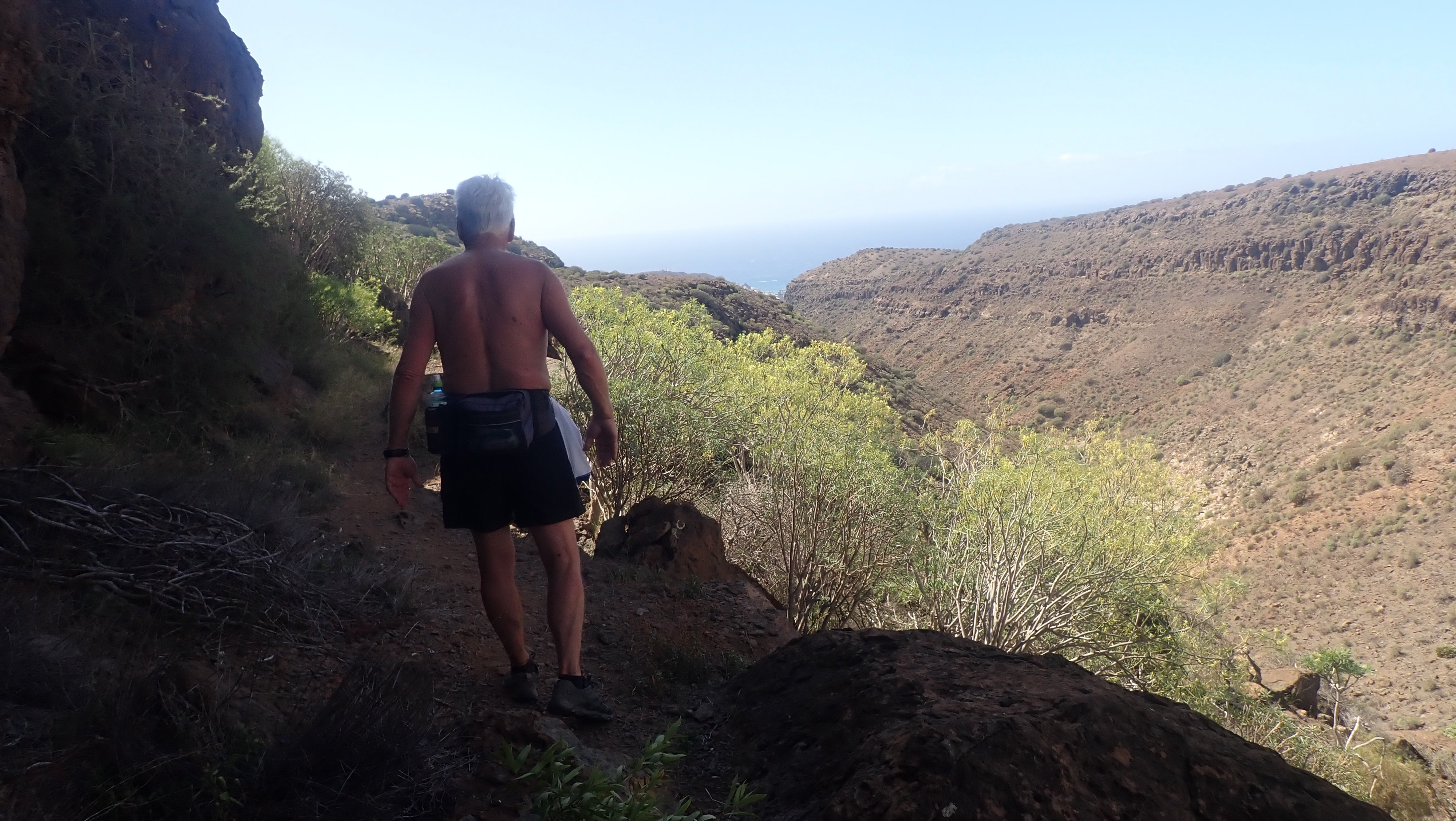 En sommeretur. (Dette er en av 12 turer jeg fikk gått i denne omgang. Det er kjekt å gå i kort bukse og lite annet i februar.) Turen til Hjermanns Plass, regner både Edvin og jeg som en langtur. Den blir nærmere 20 kilometer slik vi går den. Begge var langt fra sikre på om vi ville ta turen innover til Dusjen for å gå tilbake om Hjermanns plass. Etter å ha testet formen i godt over en uke, spurte Edvin om vi skulle forsøke oss på langturen. Turen er så pass flott og litt spesiell, at jeg var enig i at vi fikk gjøre et forsøk. Det kunne jo lett gå godt. Det ble en tidlig start. Opp bakken fra Huledama, og videre innover mot Norskeplassen gikk det i et greit tempo. Formen hadde tydelig blitt bedre ut over oppholdet. Nå fikk vi hjelp av alle turene tidligere under oppholdet. Forrige gang vi gikk turen, var jeg virkelig glad for vannflaskene på Hjermanns plass. Denne gang hadde vi begge nok vann, og heldigvis var det ikke så varmt som sist vi gikk denne løypa. Nå var det også andre som ville på tur denne dagen. Norskeklubben skulle gå til Cortadores og videre ned til Tauro. Vi så en gjeng som startet fra Norskeplassen, og da vi kom opp til Sukkertoppen, var det en ganske god gjeng som ville på tur. Vi tok inn mot «Våres plass» , men skar oppover og forbi stidelet mot Karpedammen og litt lengre inne, stidelet mot Rigmors plass. Det er et godt stykke oppover mot Dusjen. Oppe i bakken så vi oss tilbake, og kunne se gjengen til Norskeklubben komme over kanten et bra stykke nedenfor oss. Det gikk merkverdig lett oppover mot Dusjen. Jeg mener det har vært tyngre i bakkene oppover. Det var ingen grunn til å snu. Ved Dusjen var det folk. Det kom et par opp fra Hjermanns plass, og rett bak oss kom det en kar som ville videre innover. Da han hørte om våre planer, spurte han om veien og hvor han skulle gå. Vi mente han greit kunne følge oss inn til Hjermanns plass, slik at han kom på rett sti videre nedover. Naturen fra Dusjen og videre, helt ned til bakken mot Eivinds plass, er ganske annerledes enn rundt Norskeplassen. Det er mye mer planter og grønt. Vi fant en god del blomster, og lavendelen dukket opp flere plasser. Stien nedover går over haug og hammer, langs fjellsider, med stup på ene siden og fjell på andre. Det er en gammel «camino» - oppbygget sti - og egentlig grei å gå. For meg er det et par steder der jeg går forsiktig. Vi satte oss ned og pakket opp maten på Hjermanns plass. Det ble en god pause hvor vi fikk beundret utsikten. Som selvsagt er noe å få med seg. Det første stykket videre går stien på greit fjell og det er mulig å holde bra fart. Det stopper fort opp i bakken ned mot dalbunnen. Det var likevel greiere å komme ned dette året i forhold til året før. Det var til og med litt vann nede bunnen. Det er mulig å gå to veier videre. Opp tauet, som er godt synlig på andre siden, Folkene vi traff ved Dusjen, mente det var enkelt å ta opp tauet. Det så helt annerledes da vi kikket bort. Vi fortsatte videre ut dalen. Et stykke utover dalen går stien opp og treffer stien som ender ut ved Eivinds plass. Det er egentlig en grei sti å følge, men det tar alltid lengre tid enn vi regner med, før vi står på Eivinds plass. Hvor det igjen ble en liten pause. Fra Eivinds plass ble det beine veien opp til Sukkertoppen og videre nedover til Norskeplassen. Vi hadde egentlig god tid, og hadde noen timer på tur bak oss da vi gikk nedover mot Puerto Rico. Likevel ble det høyt tempo nedover. Vi kom ned etter omtrent fire og en halv time på tur, og telefonen mente vi hadde gått omtrent 20 kilometer. Både Edvin og jeg var godt fornøyd med turen. Det hadde i grunnen blitt en mye bedre og flottere tur enn vi hadde sett for oss.1 poeng