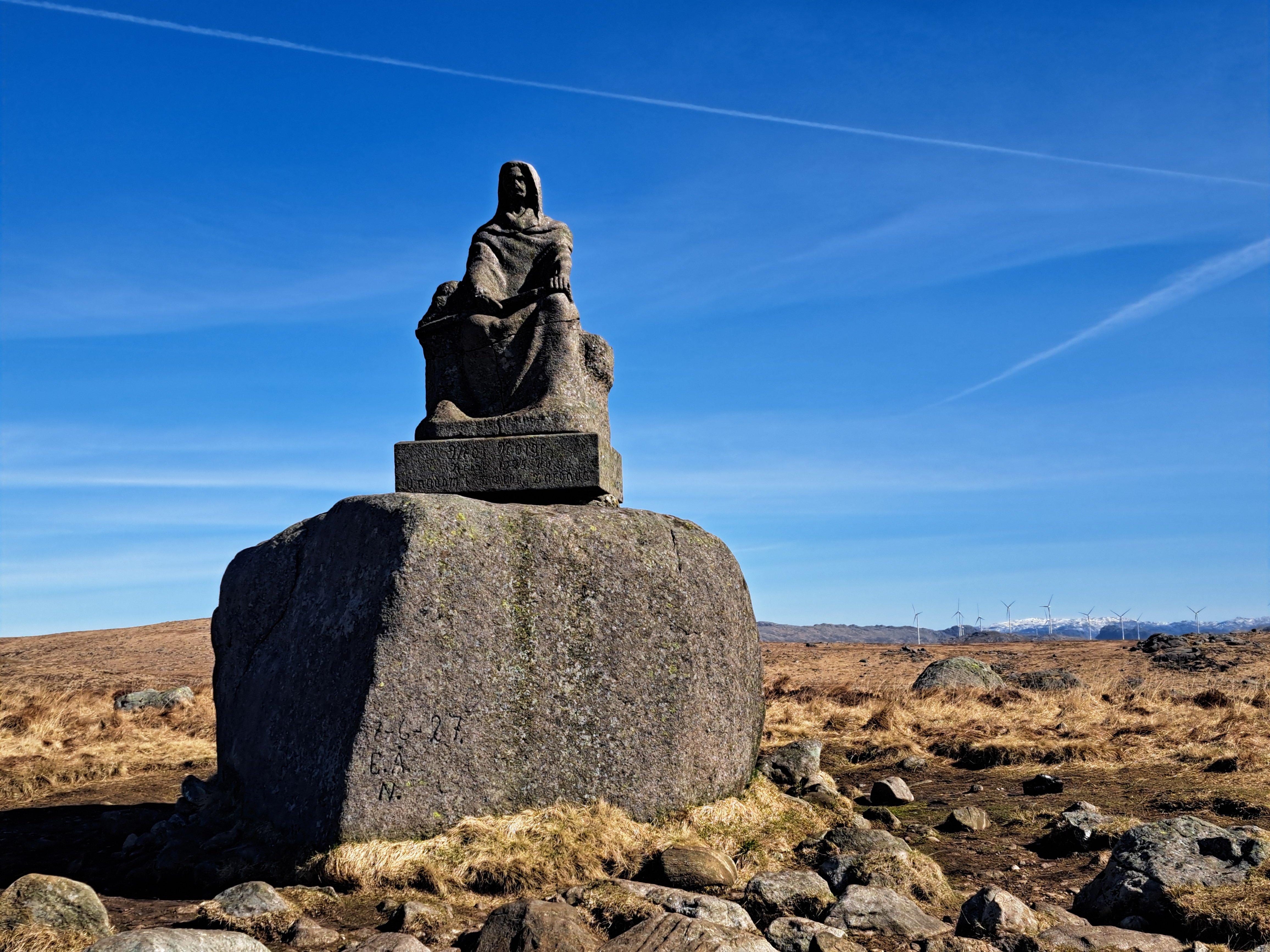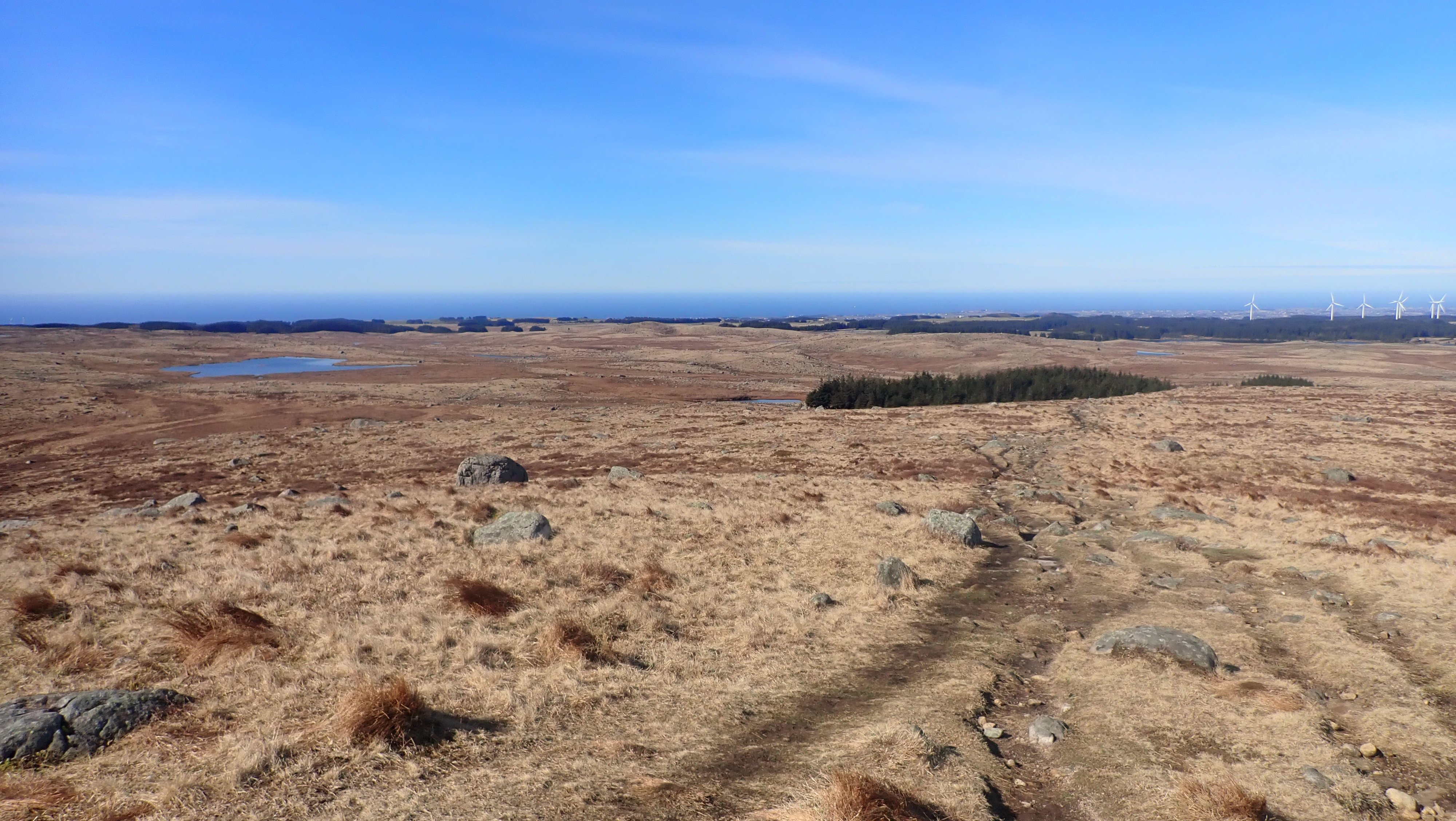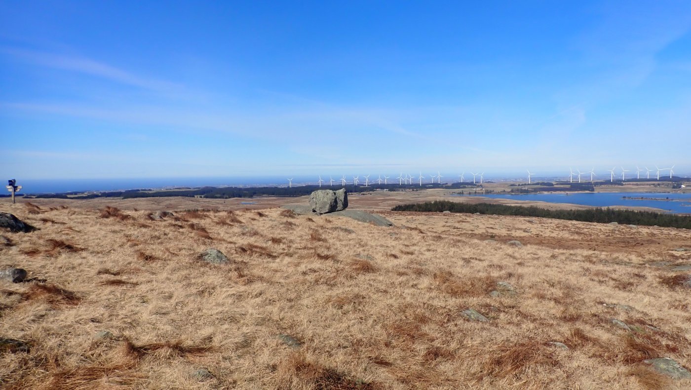 Det er vår på Jæren. Det er lenge siden traktorer med hevdalass kjørte på veiene. Lukta har nesten forsvunnet, og folk har igjen rene biler. Bøndene har alt startet pløyinga og det er sorte fuktige render i åkrene. Vipa, som ofte er det første skikkelige vårtegnet, har etablert seg for flere uker siden. Det er blomster i hagene, og småfuglene er også tilbake. På vei mot Høgjæren så jeg lam på marka, og oppe i høyden var lerka høyt i sky med sin sang. Markene nede på Jæren er omtrent skikkelig grønne, men oppe i høyden er det fortsatt brunt. Det skal ikke mange høydemeter til før det er merkbar forskjell. Nysnøen som kom oppe i heia, er alt forsvunnet på de nærmeste toppene. Bare lengst inne i selve heia er det hvitt. Det må være mange år siden våren har kommet så tidlig. Selv kan jeg huske et år da jeg kom meg innover til Blåfjellenden tidlig i mai. Det må ha vært på midten av nitti-tallet. Oppe på Høgjæren er det brunfargen som dominerer. Det er ikke mye grønt å se. Landskapet ble kaldt «De brune Jæren». Det minker stygt på nettopp dette landskapet. Både på grunn av alle vindmøllene som stikker opp, men også fordi det er blitt mer dyrket mark og flere bygninger og veier. Endringen er stor bare på de 50 årene jeg husker. I det åpne landskapet er det høy himmel og vid utsikt. I horisonten er det fjell i øst og havet i vest. Det er lett å se hvor Garborg fikk inspirasjon til «Det stig av hav et alveland». Han bodde ikke langt fra Synesvarden og jeg kjører omtrent forbi sommerhuset, «Knudaheio», til dikteren. I mange år har jeg gått tur i det som i 1994 ble Synesvarden Landskapsvernområde. Det var dit jeg hadde tenkt meg denne dagen. Det blir som oftest til at jeg bruker parkeringsplassen ved Tovdalsveien. Her har det blitt noen turer over Synesvarden og ned til Steinkjerringå – og retur samme veien. Denne gangen var planen å gå ned til Holmavatn og så til Steinkjerringå. - og så samme vei tilbake. En litt lengre tur enn bare opp og ned. Denne turen har jeg ment var en langtur, og jeg har ikke gått for mange slike «langturer i vinter. Det kunne bli litt spennende å sjekke formen. Selv om det hadde regnet skikkelig for bare et par dager siden, var det likevel ganske tørt. Problemet er bare at det var noen lange bremsespor flere plasser. Antakelig fra turfolk i helga. Det er ikke noe jeg satser på. Det gikk litt forsiktig nedover bakkene. Jeg hadde vinden i ansiktet nedover mot Holmavatn. Så snart jeg snudde mot Steinkjerringa, fikk jeg sola i ansiktet og vinden bakfra. Det ble varmt oppover bakkene. Det var skikkelig godt å kjenne sola varme. Nesten nede ved Steinkjerringå, satt det en hel gjeng i le bak granene og med sola midt i mot. De hadde funnet en flott plass, og satt der også da jeg gikk forbi på tilbakeveien. Det var ellers ganske få andre på tur denne flotte dagen. Det var mye kaldere å gå mot vinden samtidig med at sola kom bakfra på tilbakeveien mot Holmavatn. Heldigvis fikk jeg igjen vinden stor sett bakfra på vei videre mot Synesvarden. Oppover gikk jeg og gruet meg litt for de bratteste kneikene. De gikk greit, men i den lange bakken oppover mot toppen kom nok pulsen opp i hva jeg vil kalle «rød sone». Det ble en liten pustepause på toppen – for å ta bilder selvsagt. Tilbake ved bilen, var det tid for en liten oppsummering. Totalt er turen 15-16 kilometer. Denne dagen tok det meg omtrent tre og en halv time. Jeg var egentlig fornøyd med turen, selv om jeg har brukt mindre tid før i verden. Det var uansett en flott tur på en virkelig fin dag.3 poeng