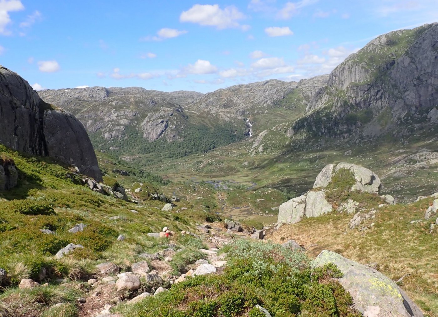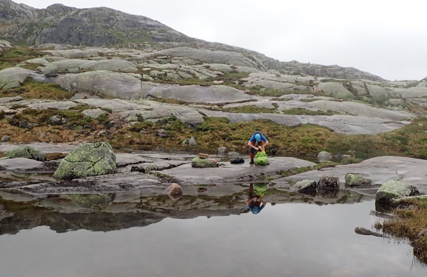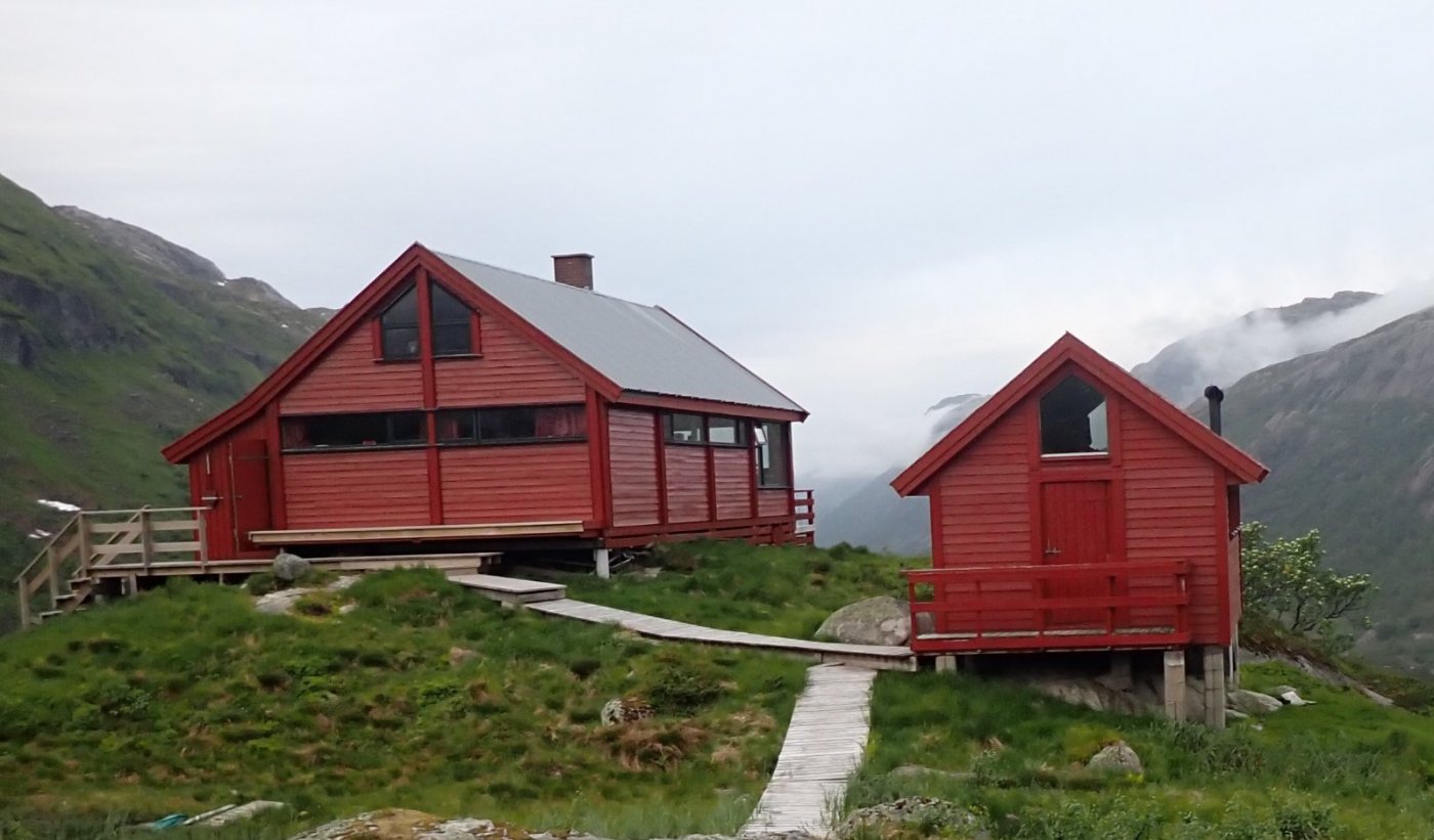 Etter en flott tur innover heia, var det kjekt å komme ned til hytta og snakke med kjente. Et par hadde gått foran meg innover, og satt på terrassen. De ville videre mot Flørli. To gutter hadde kommet opp fra Mån. De ville også videre mot Flørli og begge partiene ville ligge i telt – med tåke og regn om morgenen. Alle hadde bestilt båtplass ut til Lauvik på søndag. Uten bestilt plass kan det være vanskelig å komme med båten. Denne gangen var jeg ikke alene på annekset. To jenter kom fra Hunnedalen og ville videre til Sandvatn. Det ble en hyggelig kveld med prat om turer og fjell og hei.