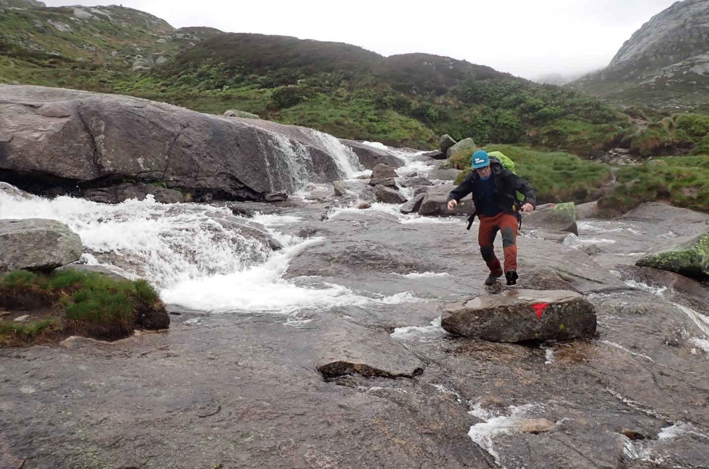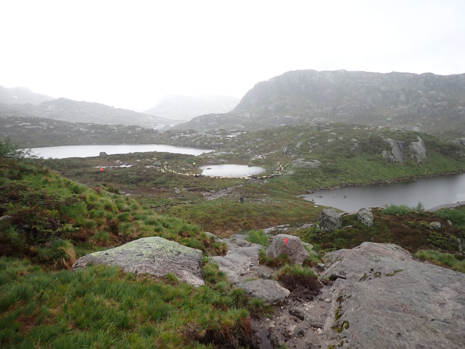 Tåka lå tett over Blåfjellenden om morgenen. Det regnet litt inne i mellom. Etter en stund lettet tåka for så igjen å legge seg rundt hyttene. Værmelding løs på mer regn ut over dagen, og jeg var klar til å ta ut i ti-tiden. En kar fra hovedhytta tok følge mot Hunnedalen. Det ble en våt tur. Det hadde regnet om natten og nå var bakken blør og sleip. Oppover gikk det greit, men i nedoverbakkene ble det mer vanskelig.