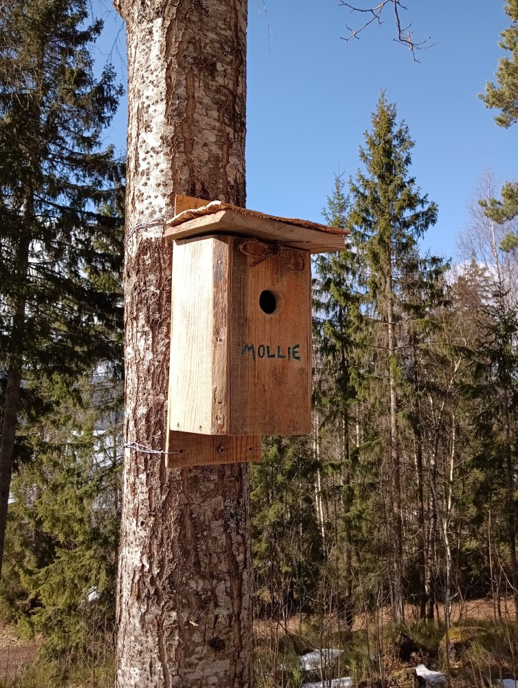 Skulle kanskje spørres om hvilke fuglekasse folk har. Fugler følger hullets mål og storleik gjerne. Men har de stått en stund, kan bl.a. hakkespetten vie ut åpningen og ha rasteplass der. Denne er til fluesnapper, og etter to år flyttet svart/ hvit fluesnapper inn. Nordvendt, satt inn med uttynnet produkt fra Møretyri. Lukta vel litt, men nå er den tydeligvis beboelig. Veldig trivelig å ha i utkanten av hyttetomta. Utført i furu med never på tak. Kunne jo hatt en bronse plate rundt hullet, slik at det ikke kan bli utvidet av andre større fugler. Men gripetak for klør bortfaller, og blir mindre funksjonelt for pipp. De liker å klore seg fast og titte inn m.m. Dessuten er fluesnappern en hissigpropp, så regner med at den hamler opp med bøller. Hatt grå fluesnapper tidligere oppunder mønkammen, der den sto i mot glupsk nøtteskrike.1 poeng
