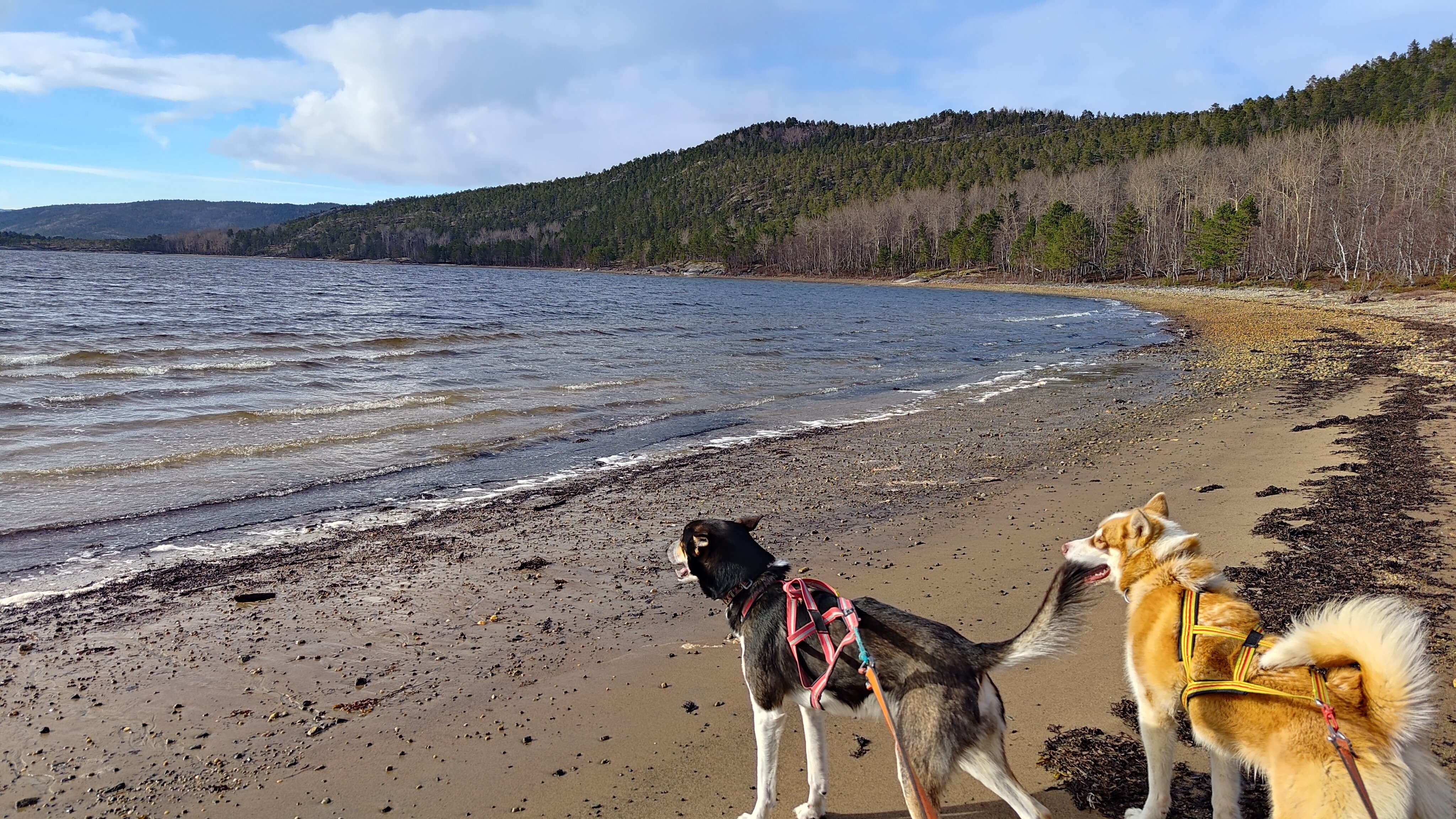 Jeg har 3 hunder: 2 Alaskan huskyer og en grønlandshund, som ikke vistes på det bildet. Teltet er et Hilleberg Anaris jeg kjøpte brukt for rundt 3000 kr eller noe deromkring. Et veldig fint telt for lavlandet, med god plass, og fortelt i hver ende. Om man ruller opp teltdøren føles det som å sitte i en gapahuk! Jeg bruker ofte gåstaver (dog som oftest bare én når jeg går med flere hunder) og kan slå det opp med de som teltstenger. Da veier teltet bare 1,4 kg med plugger! Jeg har ikke testet det, men i teorien burde man kunne droppe stengene og bare knyte lange snorer fra mønen til noen trær.1 poeng