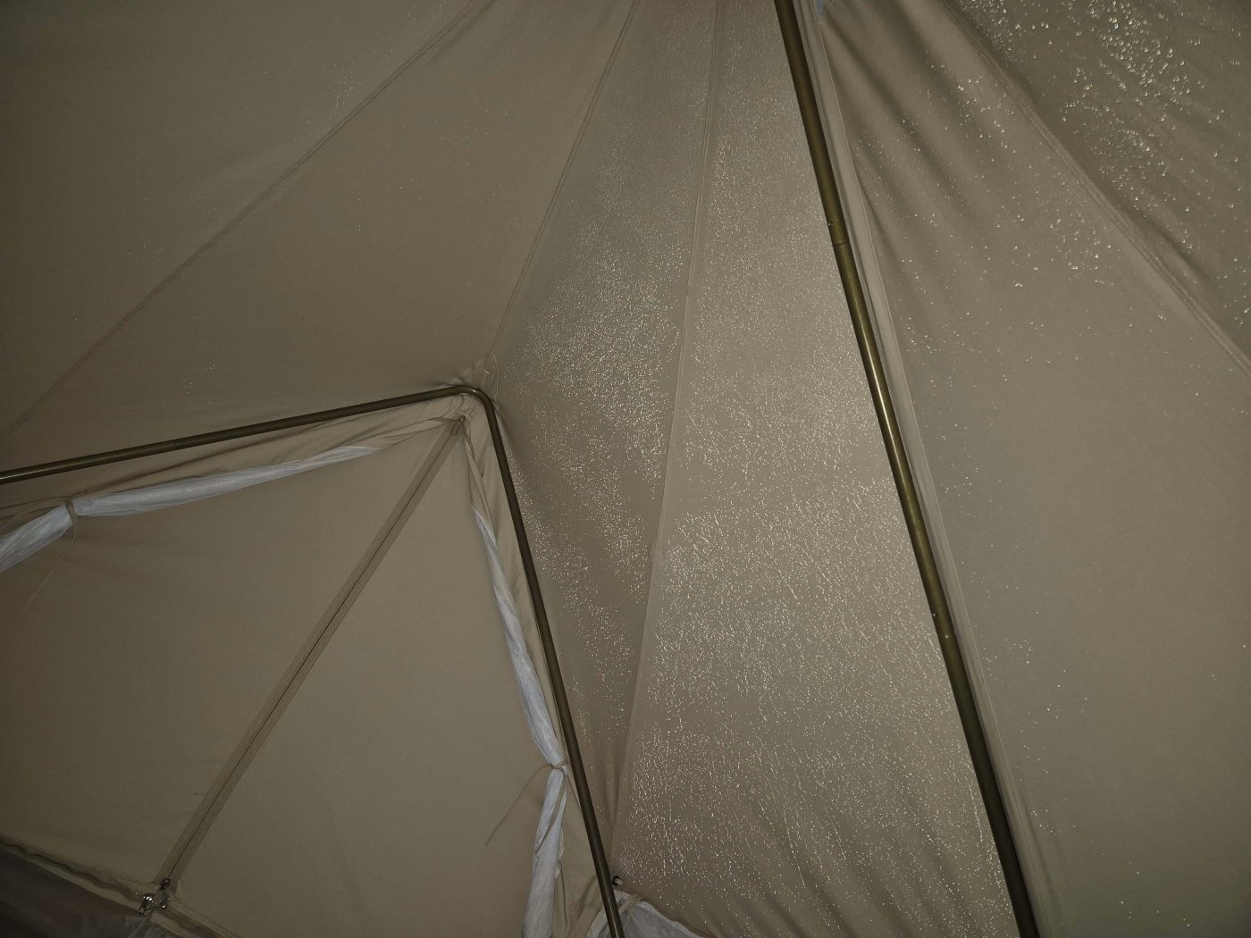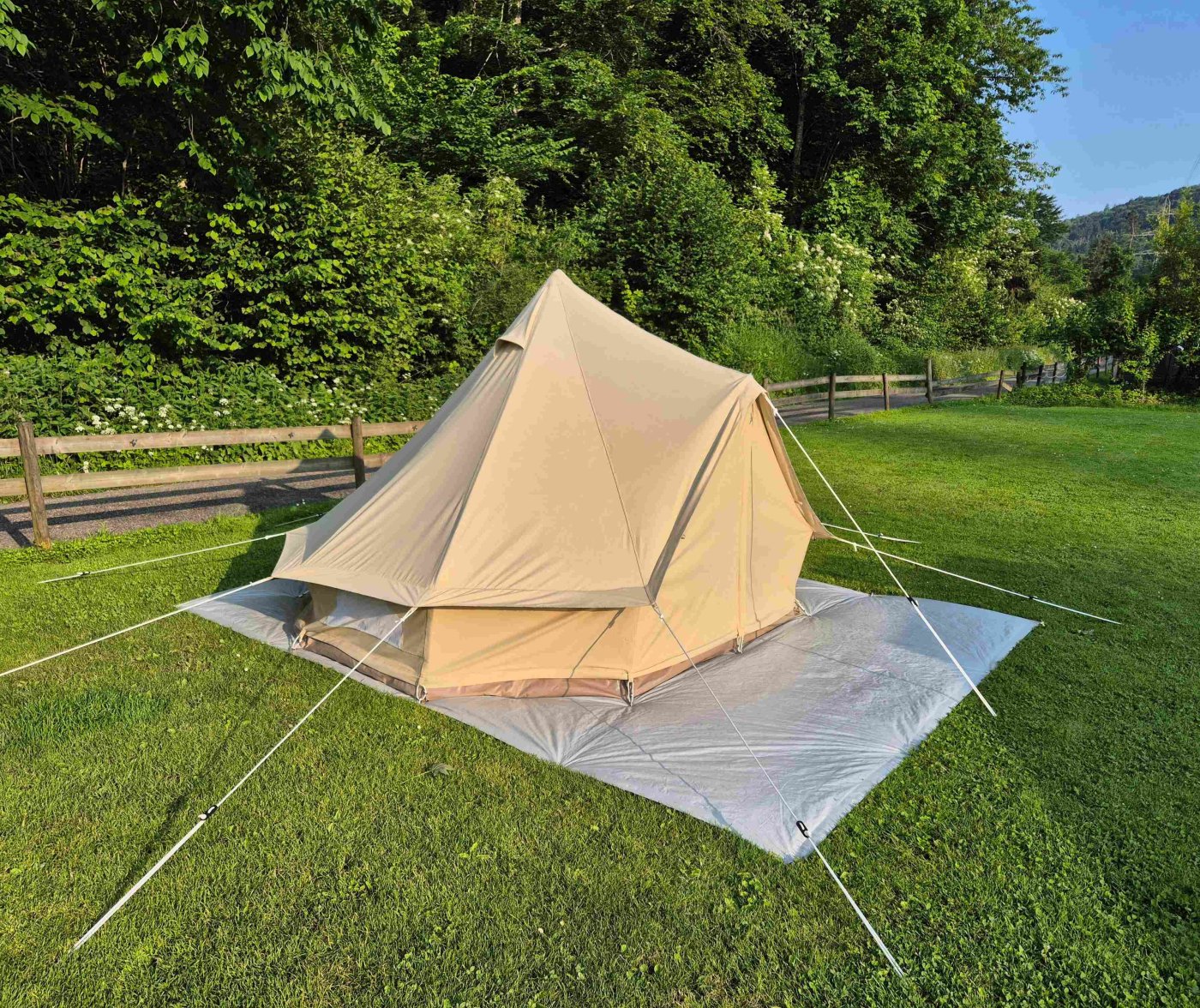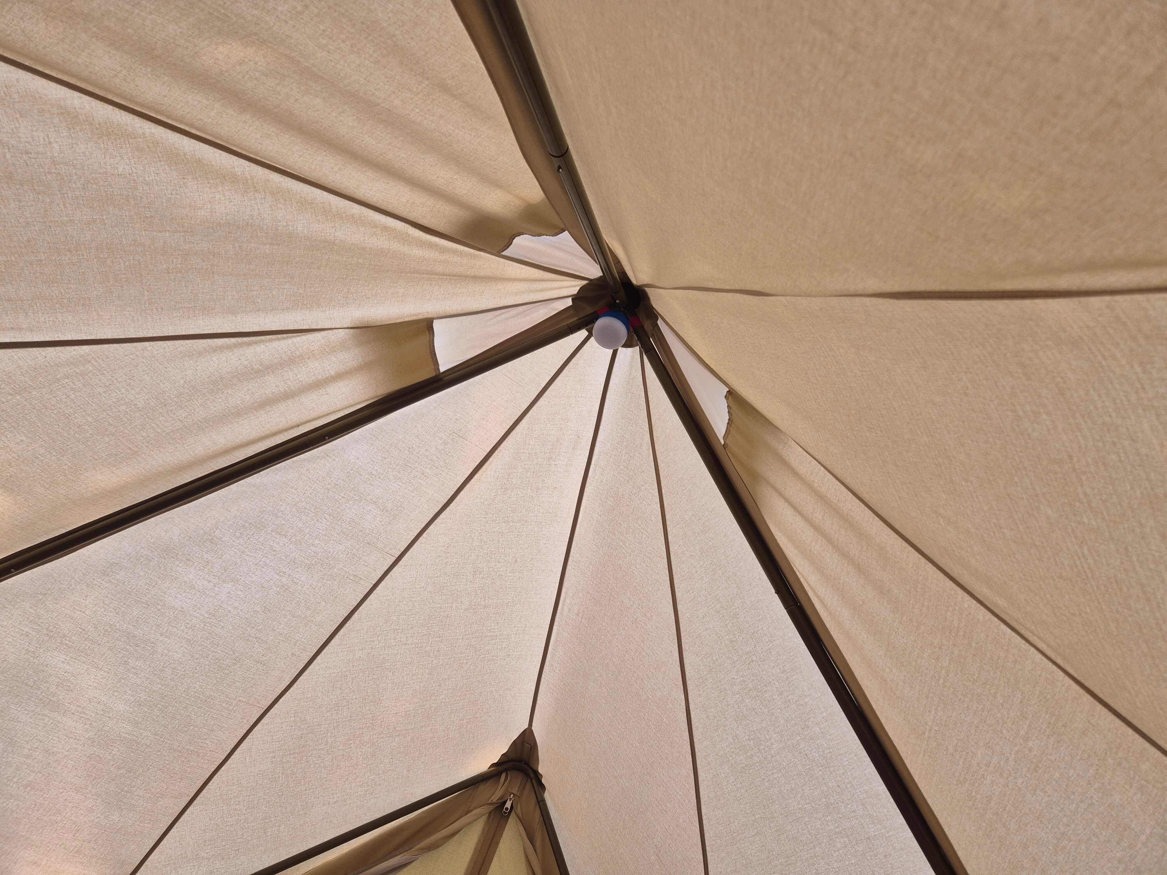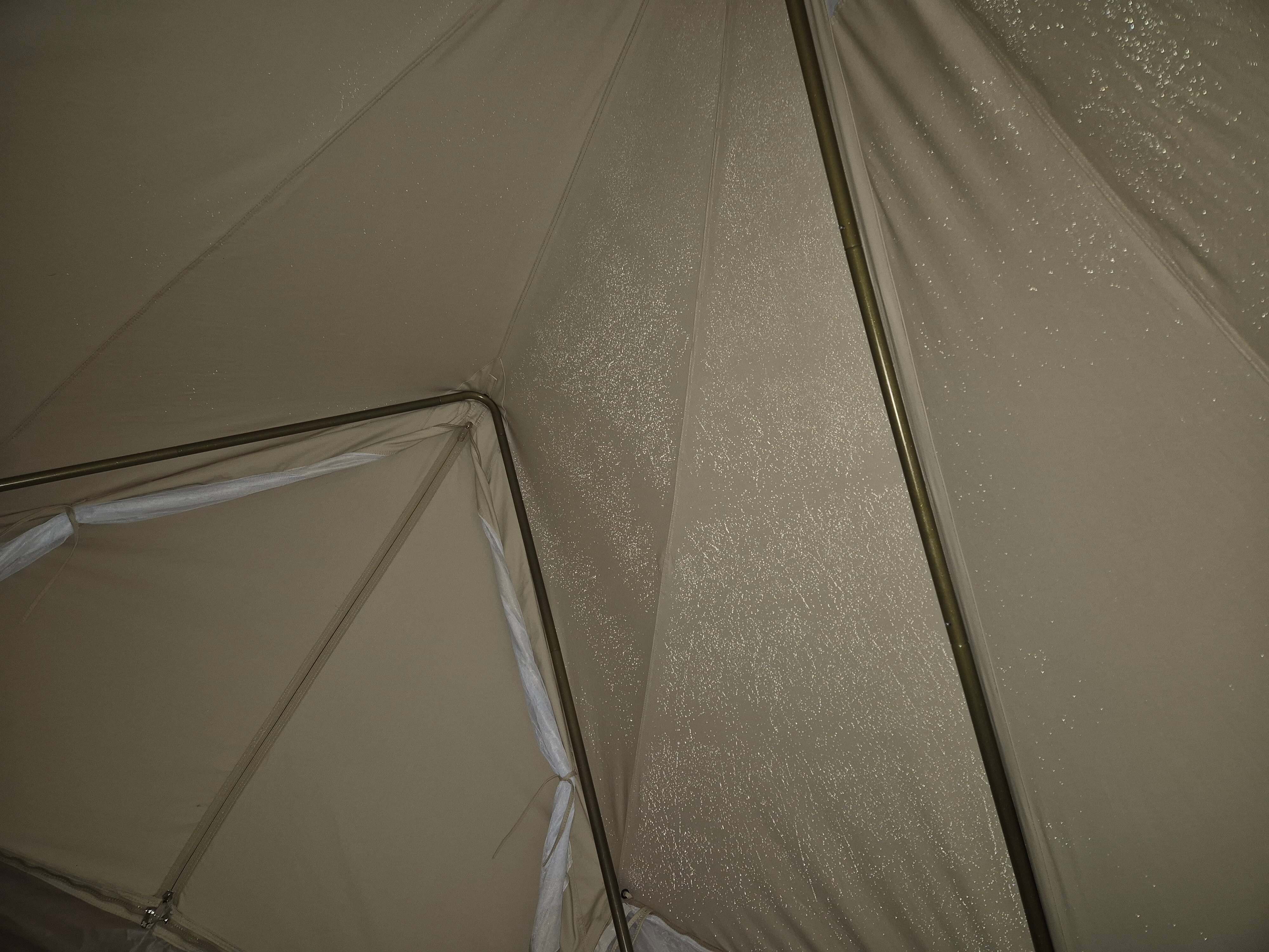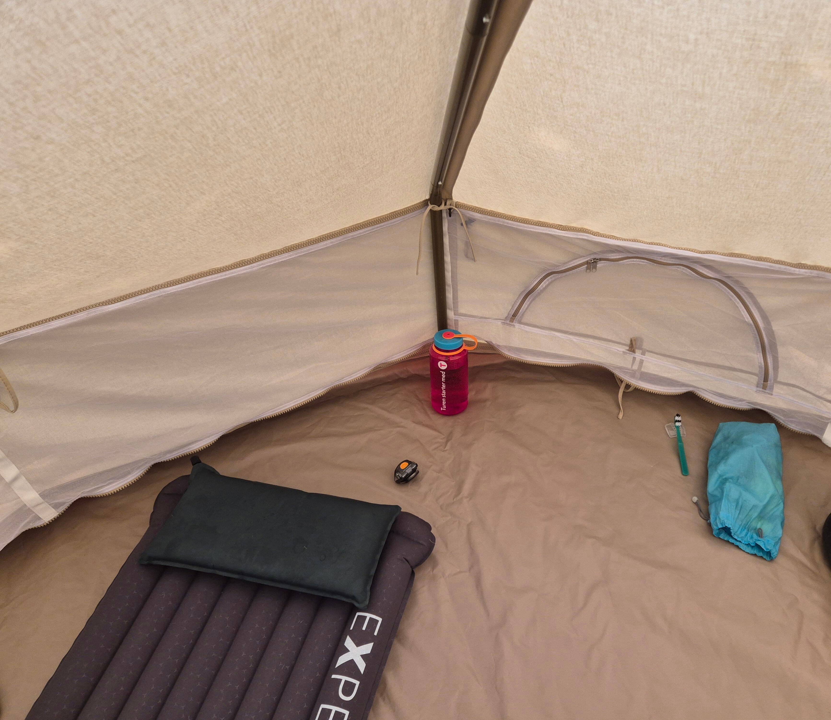 En kommersiell campingplass bare 7 km opp i dalen der jeg bor. Dette er et nytt telt, og jeg dro til denne lokale campingplassen bare for å venne meg til rutinen med å sette opp/pakke teltet. Det måtte også «døpes», dvs. bomullen skulle bli våt før første gangs bruk, slik at fibrene krymper og lerretet blir mer vanntett. Dette er ikke et telt som skal stappes i ryggsekken – teltet alene, uten gulvtarpaulin og markisetarpaulin som sees på bildet, veier 24 kg. Det har en stativramme av tunge stålstenger samt en A-ramme av stålstang for døren. Det jeg liker med teltet er at fordi det øvre teltet er av bomull/lerret, er det inneklimaet veldig behagelig i varmt vær (vi hadde ca. 25 °C her på ettermiddagen under testingen, og teltet ble ikke satt opp i skyggen). Stativrammen betyr at det ikke er noen midtstang, og den generøse høyden lar meg stå oppreist inni (jeg er 182 cm). Hvis man trenger mer ventilasjon, kan hele bunnduken tas helt av det øvre teltet. Lette nylontelt er veldig praktiske for mobil camping til fots (jeg har en Hilleberg Unna), men de blir ukomfortable veldig raskt i direkte sollys, og de er også litt klaustrofobiske i langvarig vått vær. Jeg bestilte dette teltet fra et selskap i Flandern. Merk at ikke alle modeller har stativramme – de fleste har en midtstang. Versjonen som sees her er Sibley ProTech 300 og har en enkelt dør, og gulvet har Ø 3 m. https://www.canvascamp.com/en/products/canvas-tents/sibley-bell-tents/sibley-protech Den første natten regnet det nesten ustanselig, til tider veldig kraftig (tordenvær), men bare en liten mengde vann sivet gjennom duken, og det dryppet ikke noe vann ned på gulvet: Utsikt fra gulvet opp mot taket, som viser stativet av stålstenger som veier 1,7 kg (hver stang!). Jeg kan stå opp uten å bøye meg, og hodet mitt berører ikke lampen som henger fra midten: Den bakre stangen på stativet. Den korte, vertikale delen av teltveggen kan trekkes av med glidelås og rulles opp, og i stedet kan den korte nettingveggen i forgrunnen trekkes inn med glidelås, noe som gir svært god ventilasjon – selv om ventilasjonen er god selv med teltet helt lukket: En liten silpoly tarp (250 x 150 cm) er et godt fortelt for å sitte ute, lage mat osv.:1 poeng