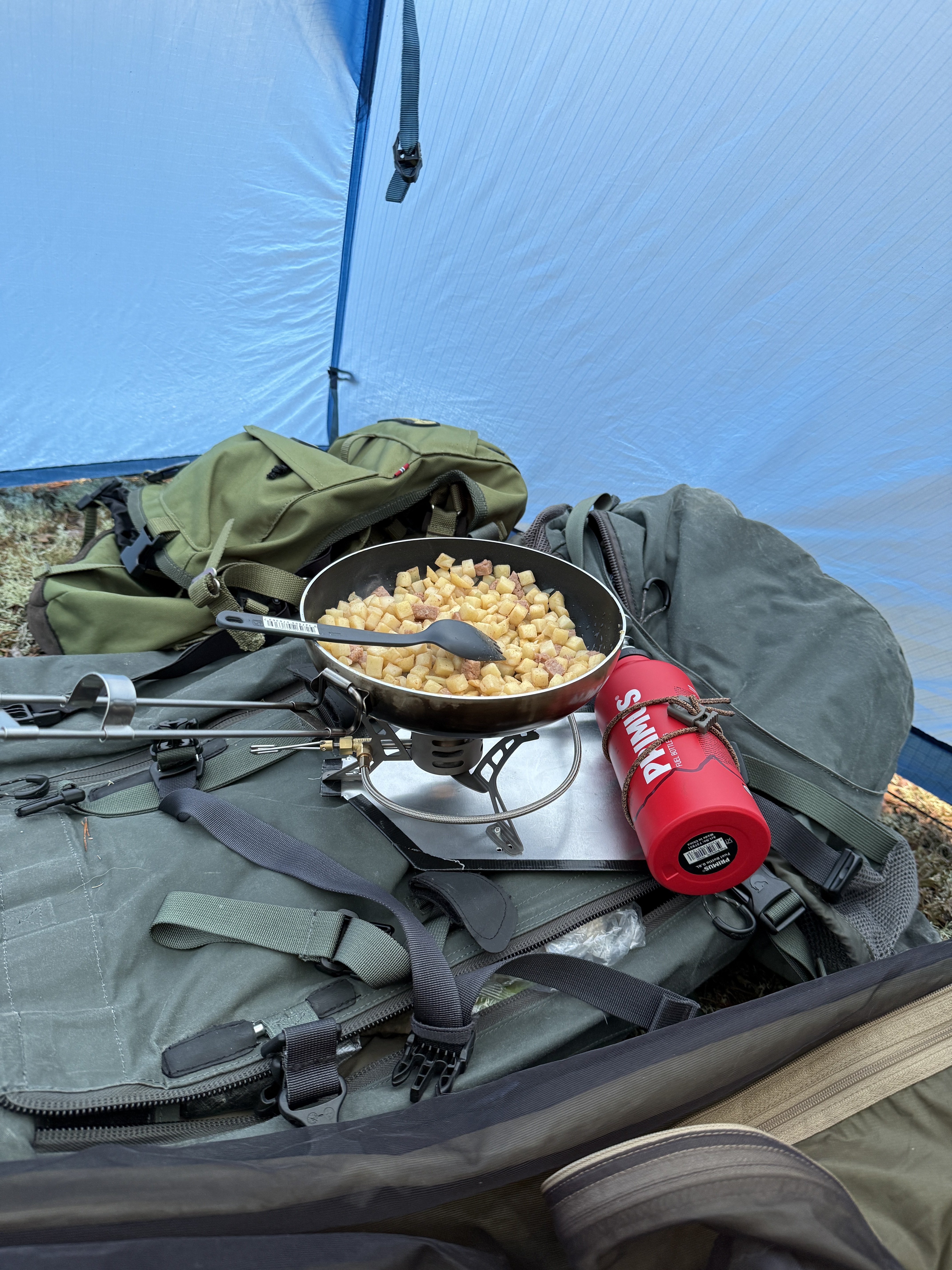 Dette teltet ble enda mindre fristende med «hypercurve» innerteltet. Det er vel et forsøk på å komme med noe nytt og «bedre». Har man stort innertelt, som på Unna, så kan man hekte løs et hjørne på innerteltet om man absolutt trenger større yttertelt enn det som allerede er der. Men trenger man så mye mer enn en våt sekk, våte støvler, og litt annet småknask uti der da? Jeg synes innerteltstørrelsen på Unna er helt super. Man får faktisk plass til å snu seg, skifte klær, tørke litt klær i taket, plass til tingene sine, og plass til matlaging. Åpner man døren mellom inner- og yttertelt får man med en gang god plass til koking, og et tørt gulv i nesten hele området. Setter man en teltplugg i bakken kan man faktisk trekke inn innerteltet på midten, lignende det buete innerteltet fire innlegg over. Jeg flytter ofte skumunderlaget over «dørterskelen» i overgangen mellom inner- og yttertelt, så får jeg flatt gulv som passer fint til matlaging3 poeng