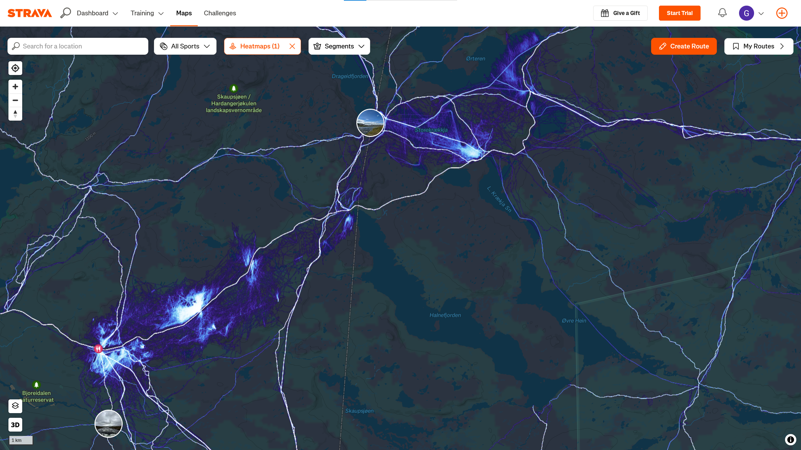 https://www.strava.com/maps/global-heatmap Denne ble anbefalt av noen andre her på Fjellforum for noen dager siden i en annen tråd, syntes den fortjente sin egen. De lyse stripene og områdene viser hvor folk har gått, mens de områdene uten striper viser hvor det er lite trafikk. Jeg må jo si at dette var veldig spennende, både med tanke på å finne ut hvilke turer og ruter som er mest populære, men også med tanke på å finne steder få andre går. Og det bekrefter jo mange av mine erfaringer om hvor få folk som går i enkelte områder kontra andre. Samtidig som det har avslørt enkelte svært populære turer i mitt lokalområde som jeg ikke visste om. Det har også avslørt enkelte områder hvor jeg lenge har lurt på om det går an å gå i det hele tatt, hvor ingen stier normalt er oppmerket, men hvor man plutselig kan se hvor andre har gått. Men når jeg ser at turen går over vannet må jeg jo lure på om det kanskje er snakk om en populær skitur og ikke en gåtur.1 poeng