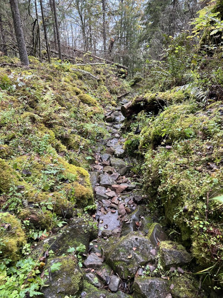 Sjekk av stiene jeg rydda i tidligere i uka, «Amy» har laget mye trefall og det kom ca 100 mm regn Stien er som en bekk. Her må nok stien legges om. Motorsag og kunnskap trengs her! og her. Stormen har gått i samme retning som dalførene. Tipper den største steinen er ca 1 kubikkmeter. Fin utsikt i Dronningveien. Dette ble ruta. IMG_2506.mov Alfa skoa var tette! IMG_2519.mov Her måtte jeg gå ut en annen vei.5 poeng