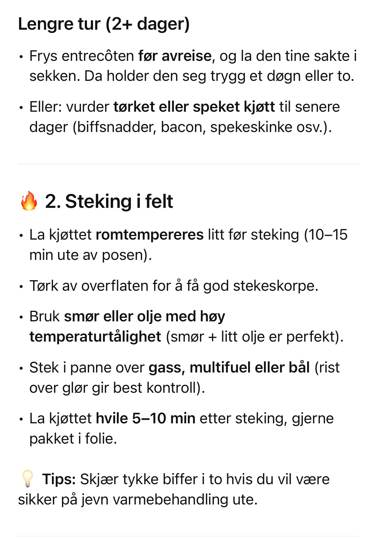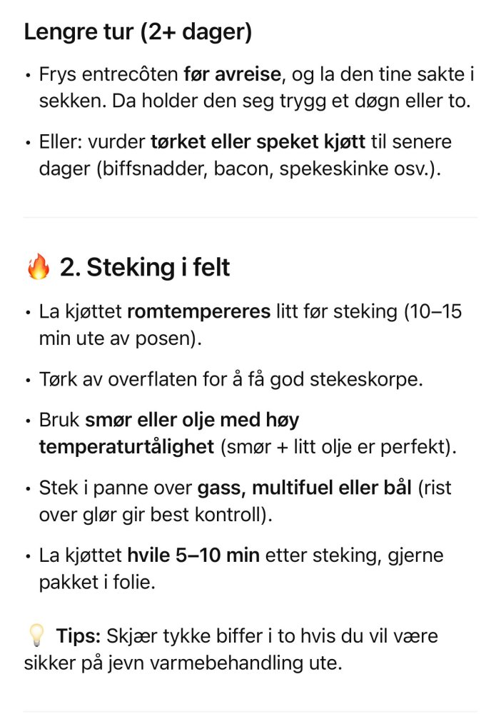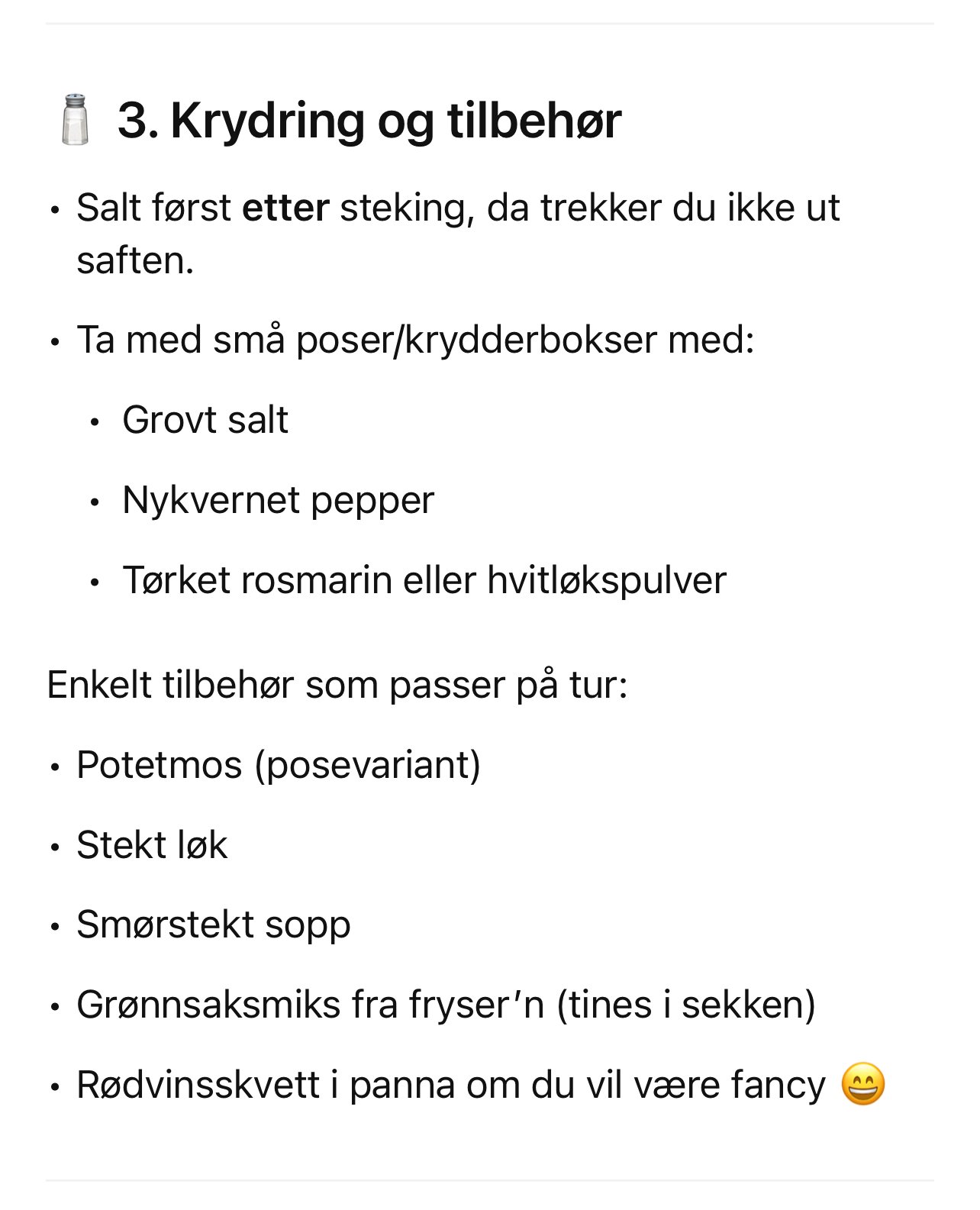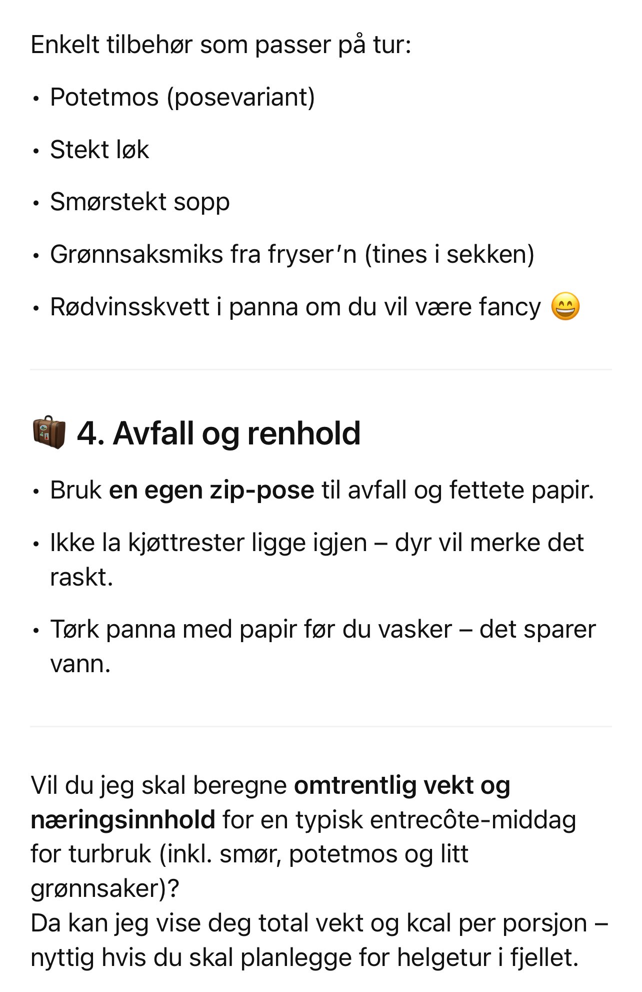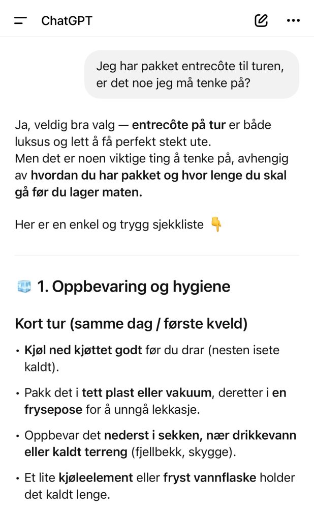 En klassiker for min del er at jeg de siste to turene har hatt med en Entrecote første kvelden men glemt smør. Den er litt vanskelig. Lurer på om KI fanger opp slikt. "Du har pakket Entrecote - du trenger smør til steking"2 poeng