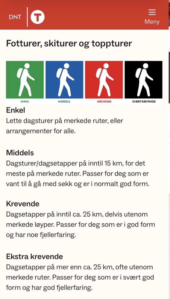 Takk for nyttig informasjon. 🙏 Har skummet gjennom den og Turen var annonsert på Facebook og på turlagets nettside på følgende måte: «Turbeskrivelse: Krevende tur der det er bratt, løst og luftig. Deltakerne må ha med, og kunne bruke, stegjern og øks. Maks antall deltakere: 12 Gradering: Ekstra krevende og krevende». Bare i utlysingsteksten ligger det jo vanvittig mye info om turen, så egen innsikt hos turdeltakerne blir jo viktig 🤗1 poeng