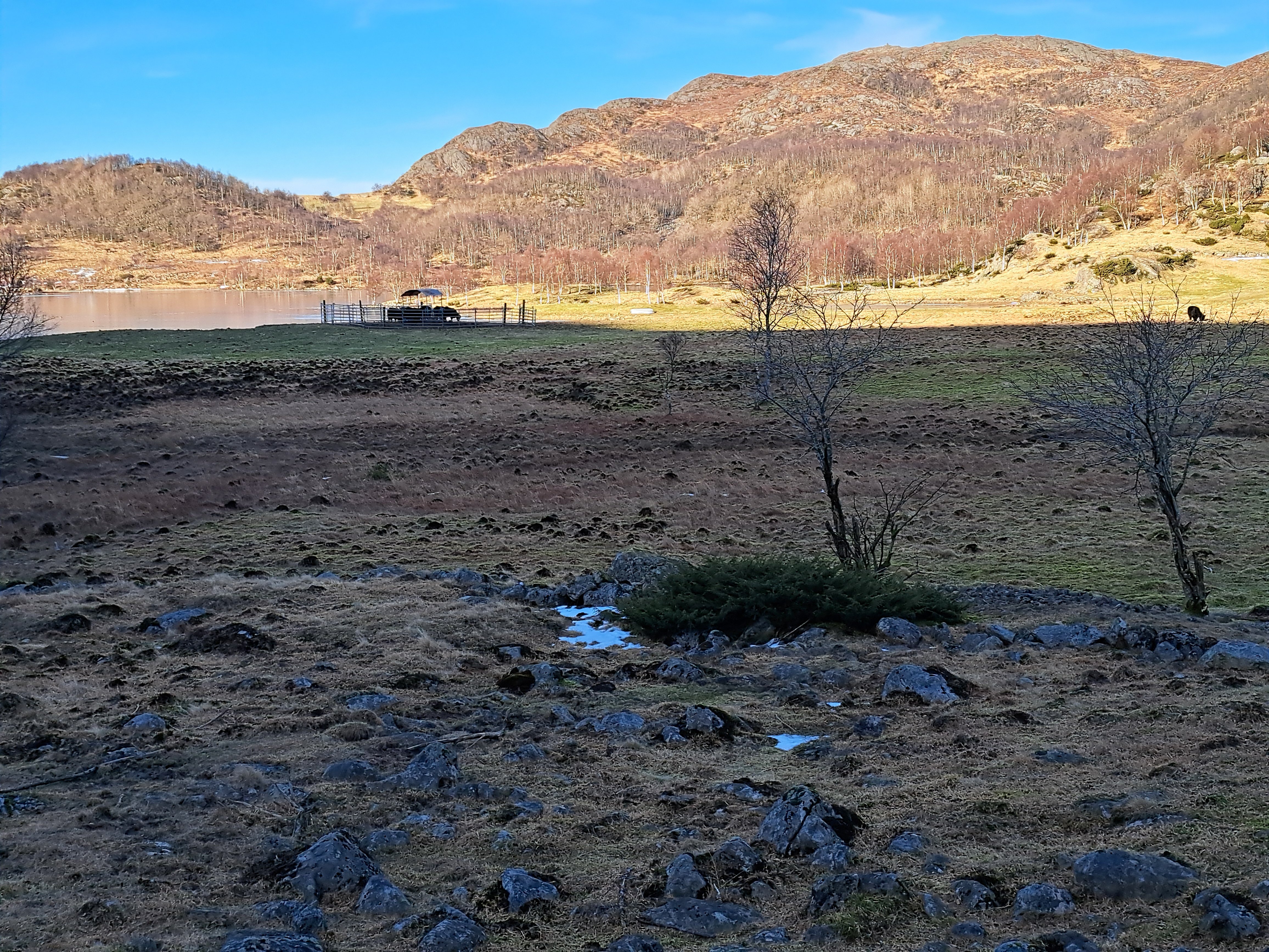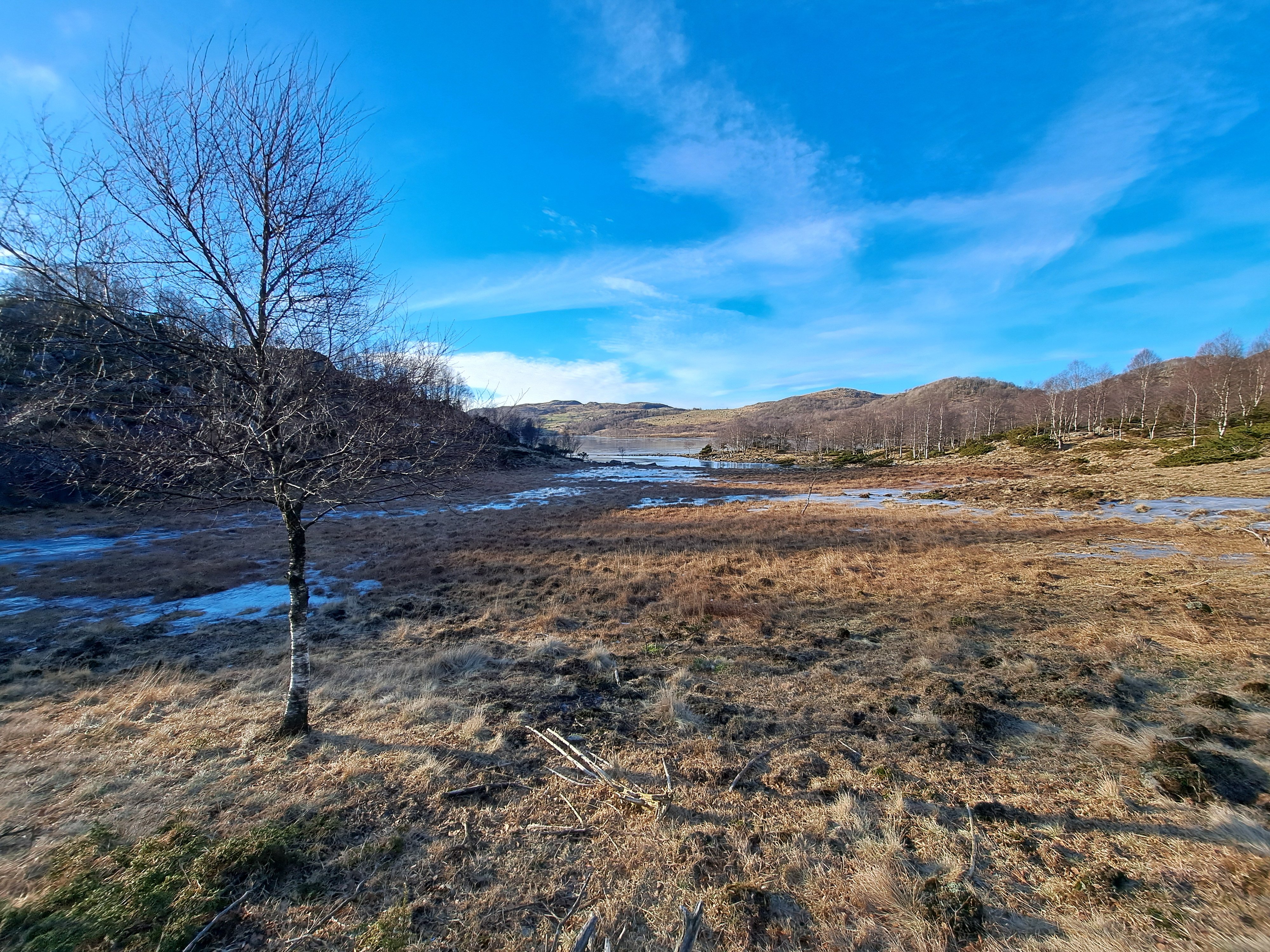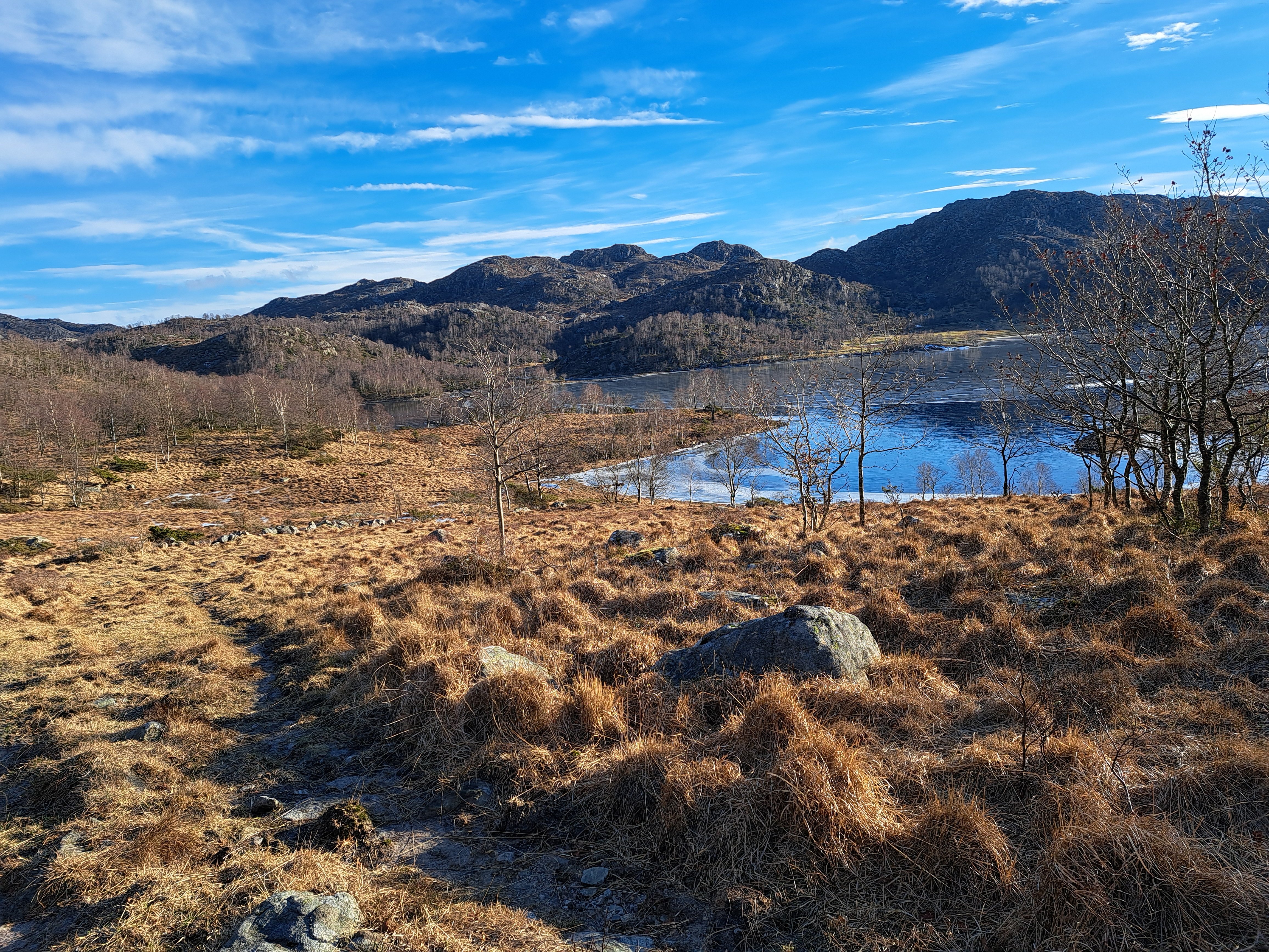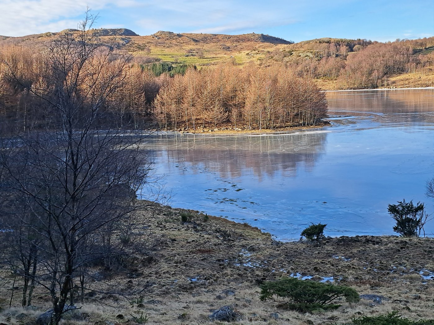 Det er ikke vanlig at vinteren, med kulde og vind, varer en måned. Januar var usedvanlig tørr – og kald, og februar fortsetter med mye samme vær. Det kom riktignok noen fjoner på søndag. Det ble så vidt hvitt der snøen blåste sammen. Vinden vil ikke gi seg. Når det i tillegg er kuldegrader, frister det ikke med tur på stranden. Det blir fort en kald fornøyelse. Broderen bruker Njåskogen som turområde. For egen del har det blitt noen runder rundt Gruda. Den turen er for kort til å bli med i loggen, og selv om det tar godt over en time, og det er en bra bakke på rundturen, så blir det liksom ikke «tur», men trening. Det hadde passet å få vanlig vintervær, mellom 5 og 10 grader og regn. Selv på turen rundt Gruda er det noen skikkelige si-svuller som jeg må rundt. På siste turen fra Gramstad vær det mye is nedover mot «Skaret». Det gikk egentlig greit å komme fram, men det hadde passet med mindre is. Jeg gikk og tenkte på en tur ut fra Sælandsskogen. Det burde være mulig å ta fra Skaret og opp til Bjødnali. Det er jo grus elle asfalt på hele strekningen. Det er i hvert fall ikke is. Det ville muligens også være mulig å utvide turen ved å ta rundt Engjavatnet. Selv med en runde rundt Engjavatnet ville det antakelig ikke bli mer enn 8-9 kilometer. I tillegg kunne det jo være vanskelig å komme over Skogsånå på grunn av is. Det fristet likevel med en tur, spesielt siden vinden gjorde det kaldt å gå på stranden. Jeg pakket sekken, og tok på mer klær enn vanlig. Vindtett ytterst, både hodeplagg og hansker. Ekstra mellomplagg under Reconjakken. I sekken tok jeg med både te på termos og varm saft i isolert pose. Jeg tok mot Sæland, men var ikke sikker på om jeg ville starte fra den vanlige plassen eller fra Skaret. Jeg kjørte rett forbi Skaret og videre mot Sælandsskogen uten å tenke meg om. Det ble den vanlige plassen denne gang også. Det var andre biler enn min på parkeringsplassen. Utenom vinden var det jo ganske bra vær med sol inne i mellom, og Sælandsskogen er grei i vind. Jeg tok en liten tur oppover mot Stølssletta, men der var det store is-svuller i stien. Det ble til at jeg tok mot Sjelset og bakken opp til Jærbuskaret. Det blåste skikkelig på toppen. Antakelig opp mot 14 m/sek, og med noen få kuldegrader ble det kaldt, men det ville jo bli bedre etter hvert. På toppen bestemte jeg meg for å ta direkte mot Skogen. Det ville i så fall bli en vanlig tur, men i motsatt retning. Nedover mot Engjamyrene, var det masse is. Det var likevel greit å gå rundt. Skogsånå laget heller ikke spesielle problemer. Det stakk opp steiner i bekken og jeg kunne greit komme over, selv om det ble en litt annen plass enn vanlig. Ved Skogen var dyra på plass i vinterkulden – uten å ha noen plass å trekke inn. Det virket kaldt. Jeg var i hvert fall glad for å ha på godt med klær. Som planlagt tok jeg turen bort til Bjødnali og fikk bildet av treet til broderen. Jeg hadde hele tiden tenkt å gå veien tilbake til Sjelset og bilen. På vei ned fra garden, tok jeg en liten avstikker for å se om det var mye is ved den lille brua rett før Bjødnali. Det var ikke is i det hele tatt. Jeg viste det hadde gått folk oppover Urdådalen, og la raskt om planene og tok stien nedover Urdådalen og mot Taksdalsvatnet. Det var bare en plass jeg måtte ut av «veien» for å komme rundt en issvull. Midt på den issvullen sto det ei jente som var på vei oppover. Jeg møtte også andre på tur denne dagen også. Det kom et par i mot, og nede på parkeringsplassen snakket jeg med en kar som også ville opp Urdådalen til Bjødnali. Med noen ekstra avstikkere, ble turen på omtrent 10 kilometer, og med noen små stopp og litt frem og tilbake, tok det meg nesten tre timer. Det var en kald og vindfull tur. Det var likevel kjekt å være på tur uten sand.2 poeng