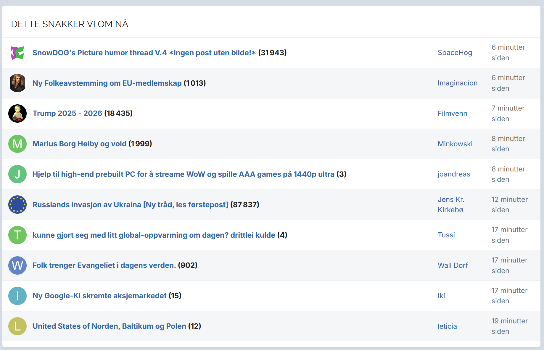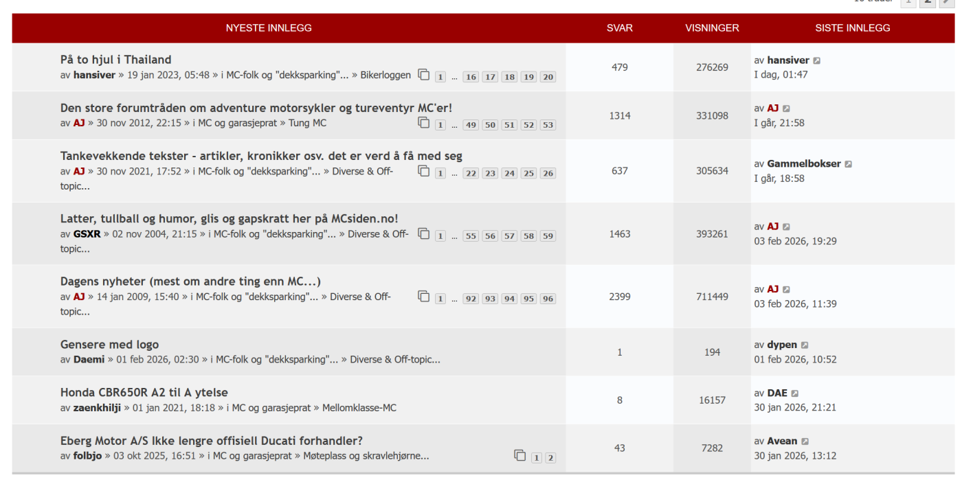 På Mcsiden er hele øverste delen av forumet dedikert til nyeste innlegg uavhengig av hvilket forum det blir lagt inn. Så du trenger ikke en egen knapp, alt det nyeste kommer opp. Likner mye på funksjonaliteten vi hadde på Sidebar her på Fjellforum. Du har noe tilsvarende på Diskusjon.no med "Dette snakker vi om nå". En av hovedforskjellene med dette kontra sidebar på Fjellforum er at det drar frem alle trådene, ikke alle innleggene. Så om du har 10 innlegg i en tråd, så blir ikke alle de andre diskusjonene borte på grunn av det. Mens med tidligere sidebar på Fjellforum så vil mange innlegg og reaksjoner i samme tråd drepe aktiviteten på resten av forumet. Det er en veldig fin måte å vise hvor aktiviteten på forumet foregår.2 poeng
