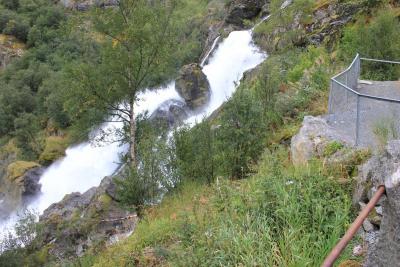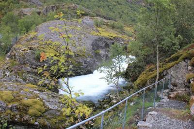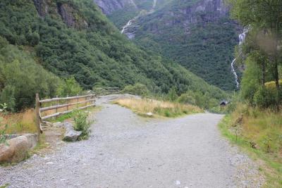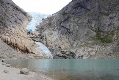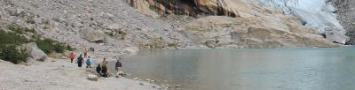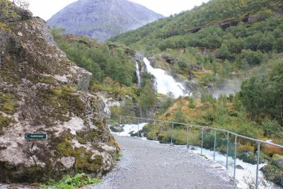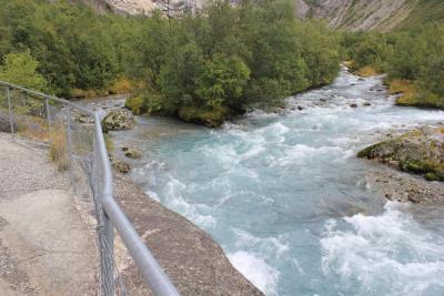 25. Hvordan er det med Briksdalsbreen i Olden? Er det noen sperringer der? Var opp til begynnelsen av vannet nedenfor breen, men kunne ikke se noen sperringer. Regner med sperringen var flyttet lenger frem på venstresiden av vannet. Bra med gjerde langs stien opp. Oppe ved brevannet: