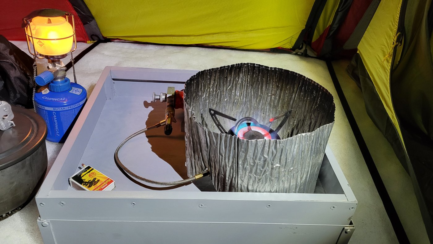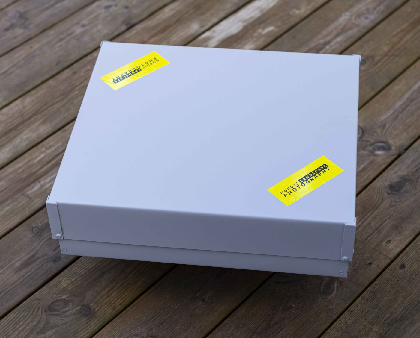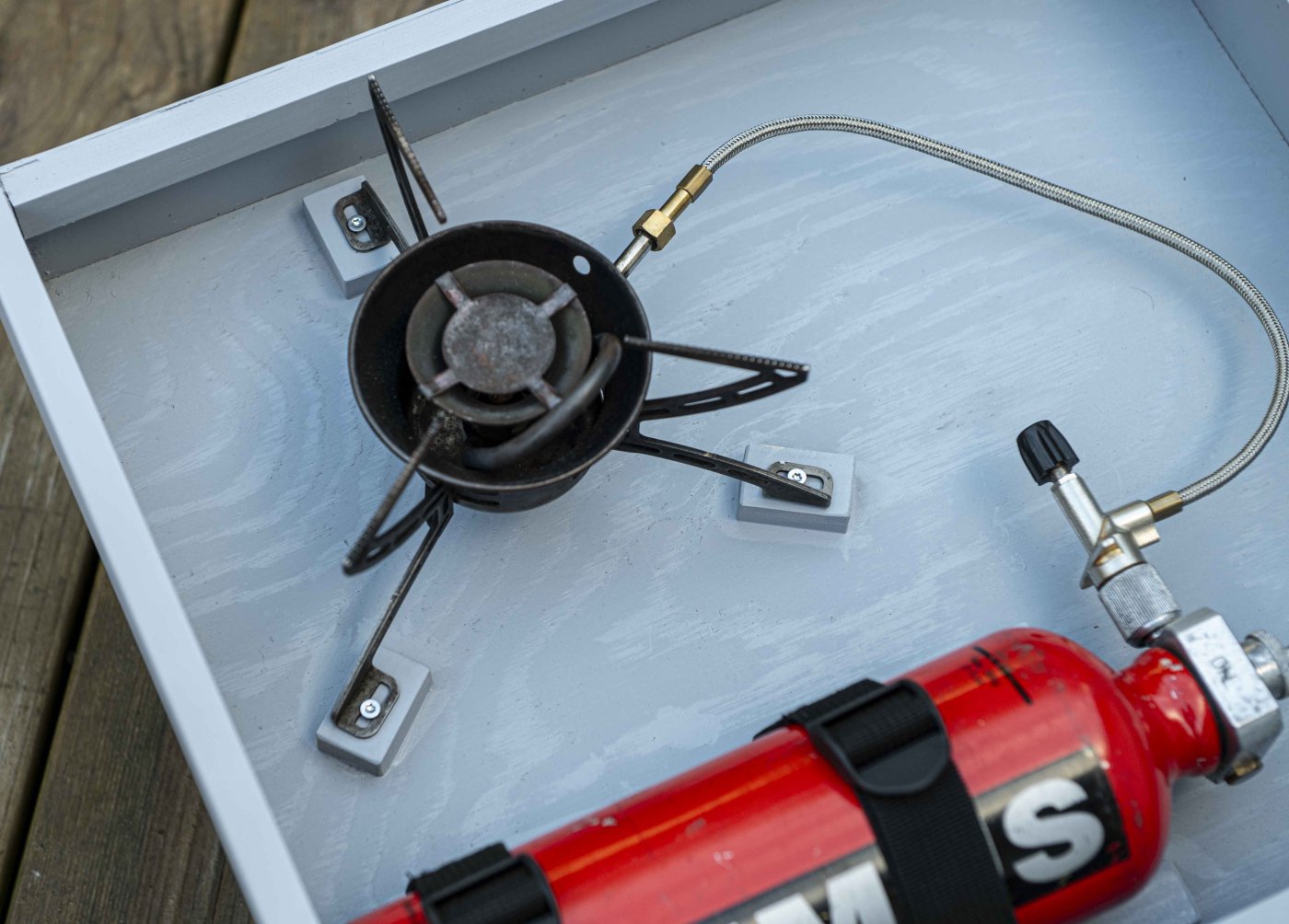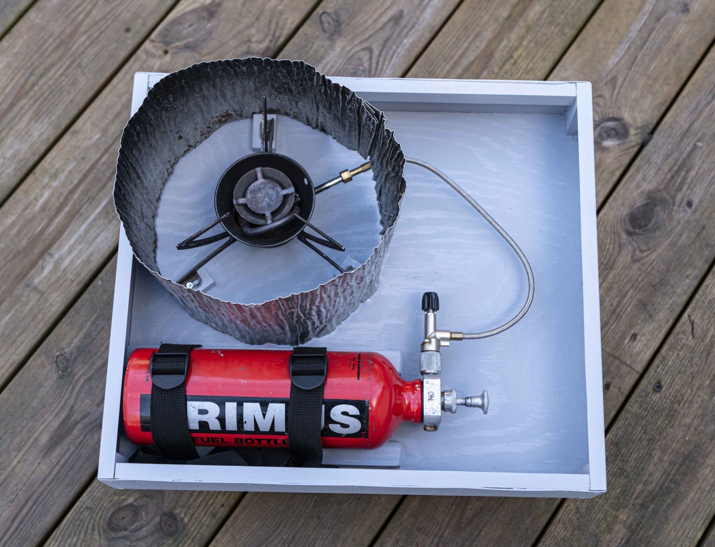 Jeg har laget min egen variant for å bruke på turer der jeg bruker pulk. Den står stødig og jeg har laget mulighet for å sette bunnen inni lokket for å få brenneren litt høyere opp. Alternativt kan jeg bruke lokket til en ekstra brenner eller til å sette kjeler oppi. Den er laget av 0,7 og 1,0 alu plater fra Biltema og en 4mm kryssfinèr i bunn og lokk. Lakkert med grunning for aluminium. Jeg har latt det være litt ekstra plass for å montere inn en boks for reservedeler og verktøy. Har bare ikke funnet den boksen jeg ønsker enda. Før jeg lager den neste skal jeg ha et TIG apparat klart og sveise hjørnene i stedet for nagling og liming.